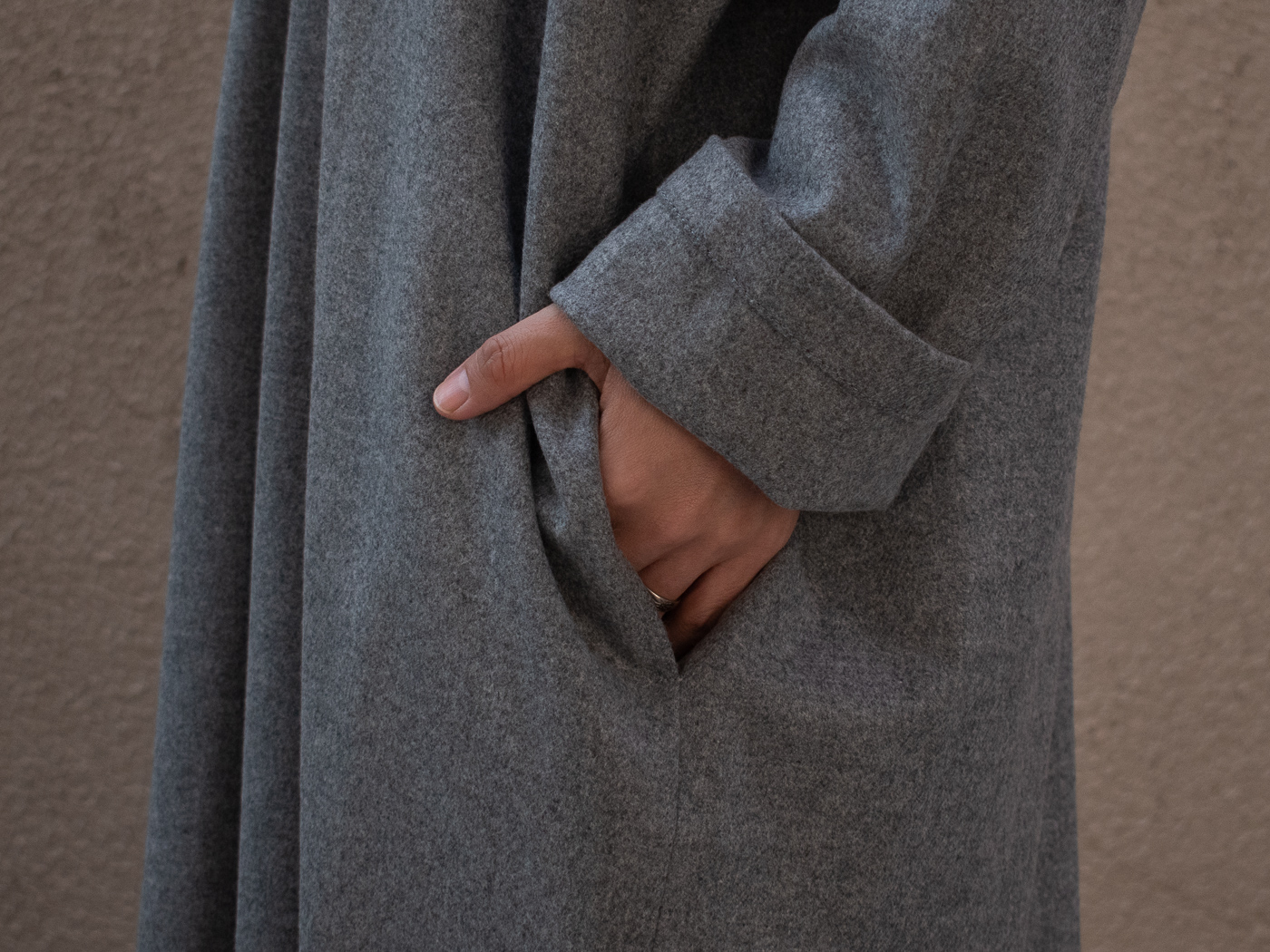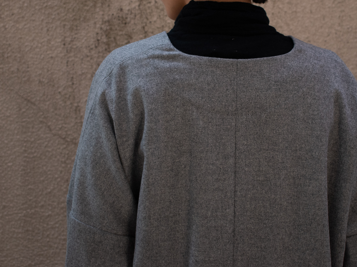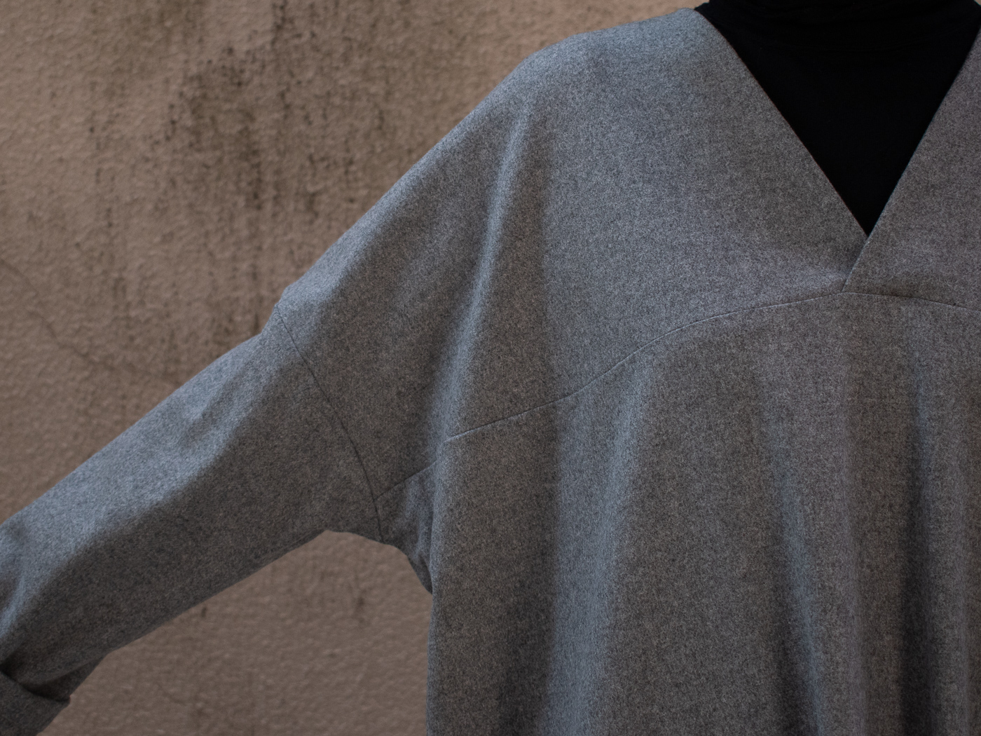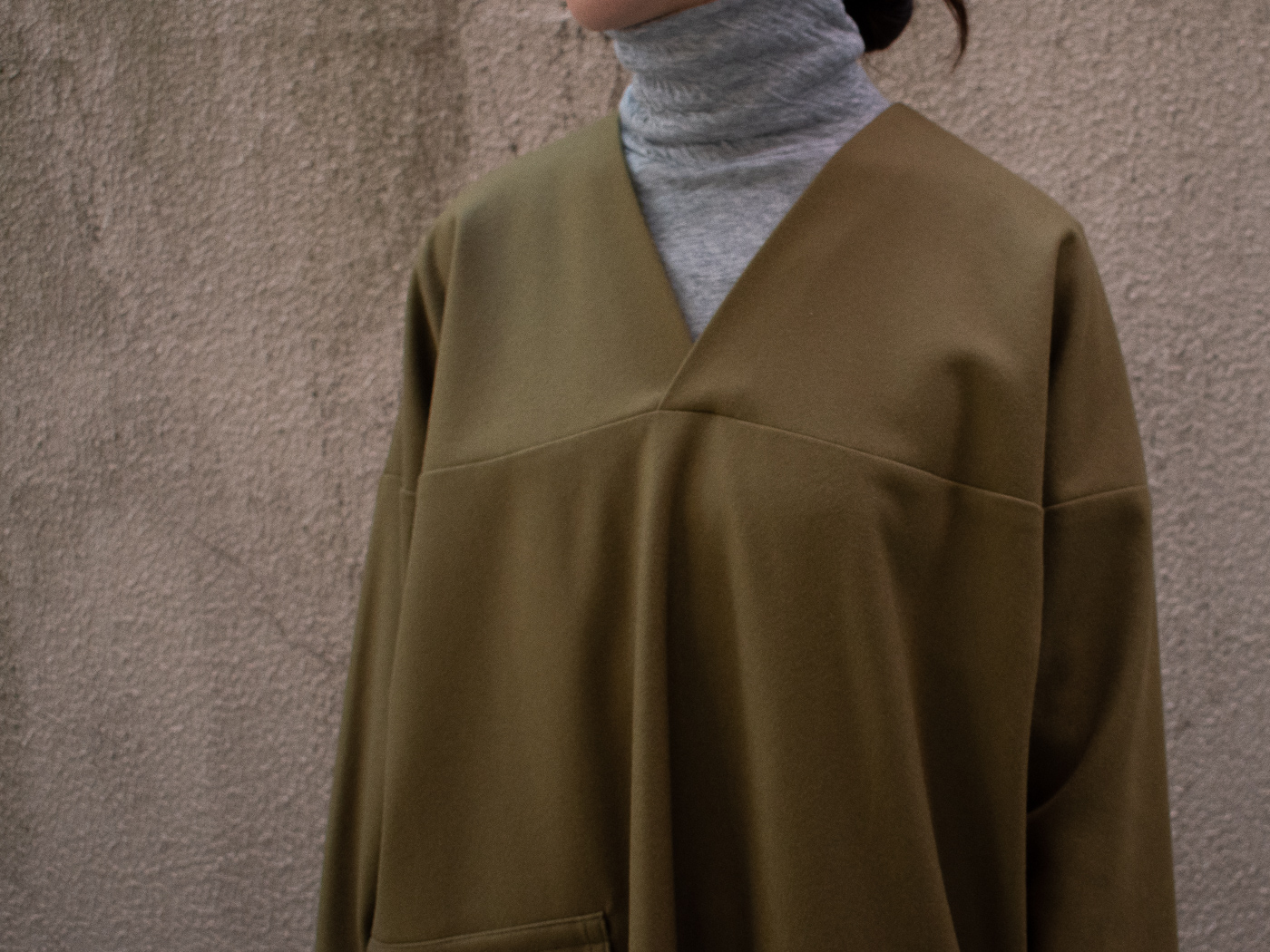 全体的にたっぷりと生地を使いながら、首元の程良い空き具合のVネックが引き締めてくれます。