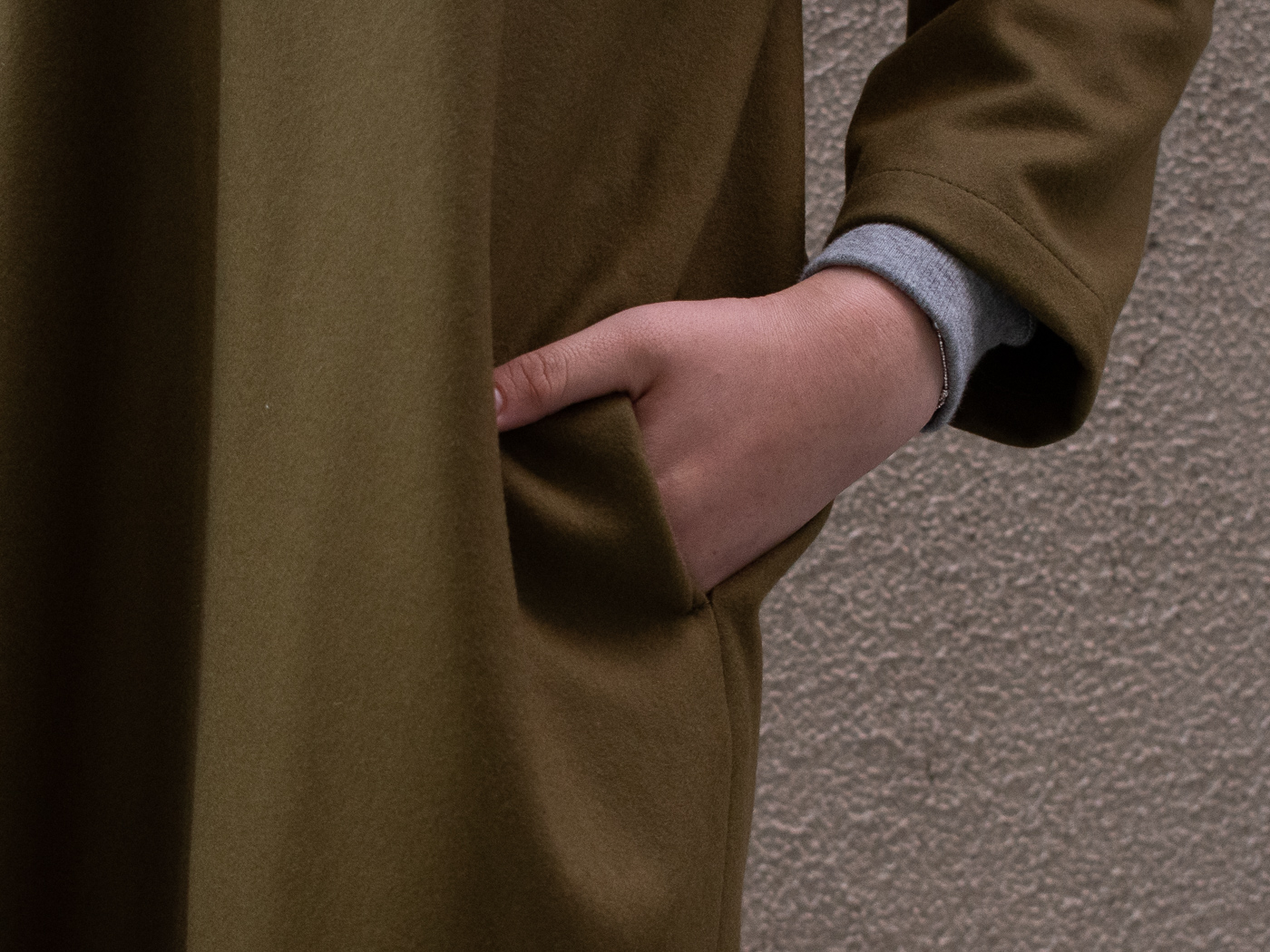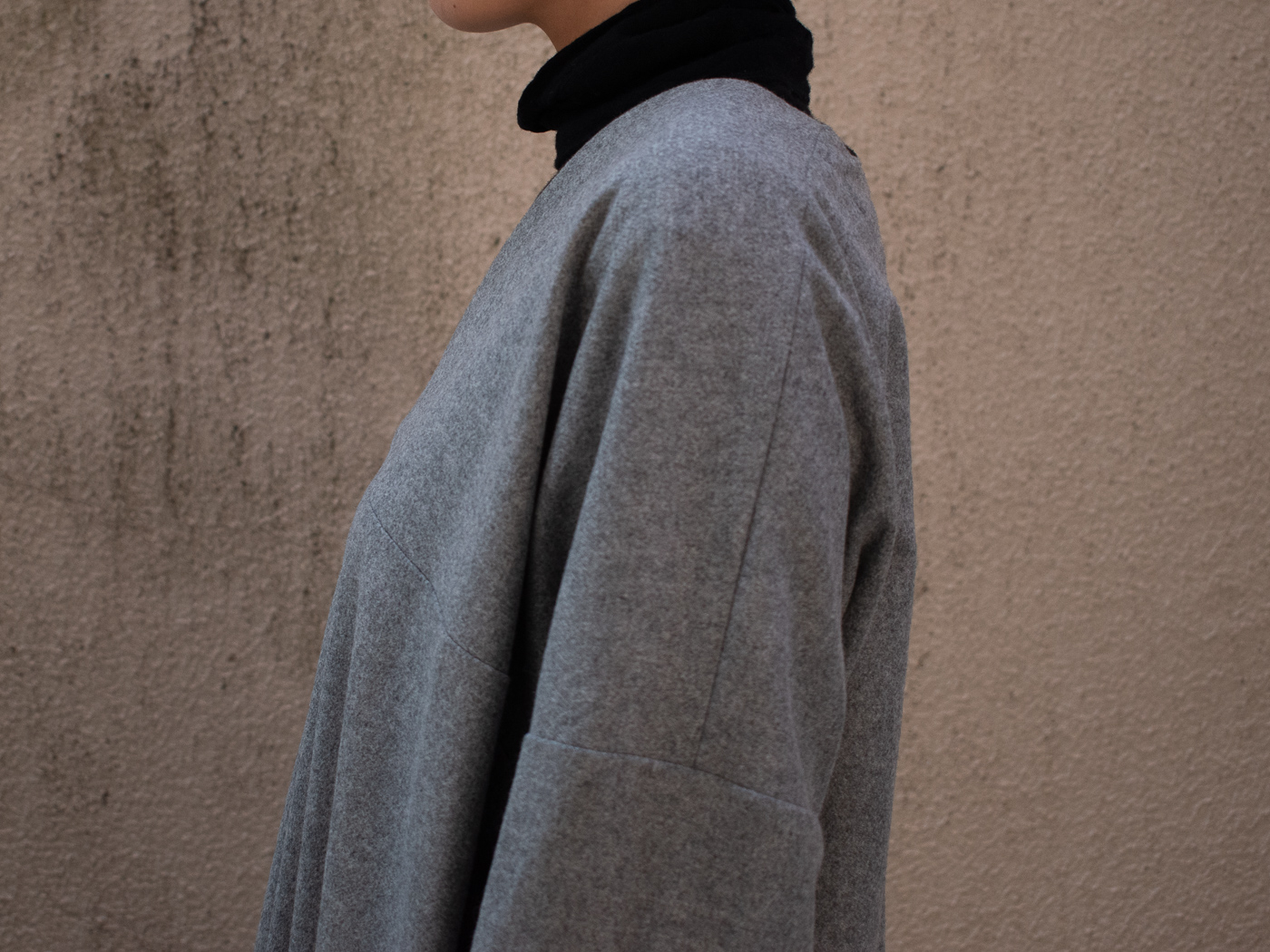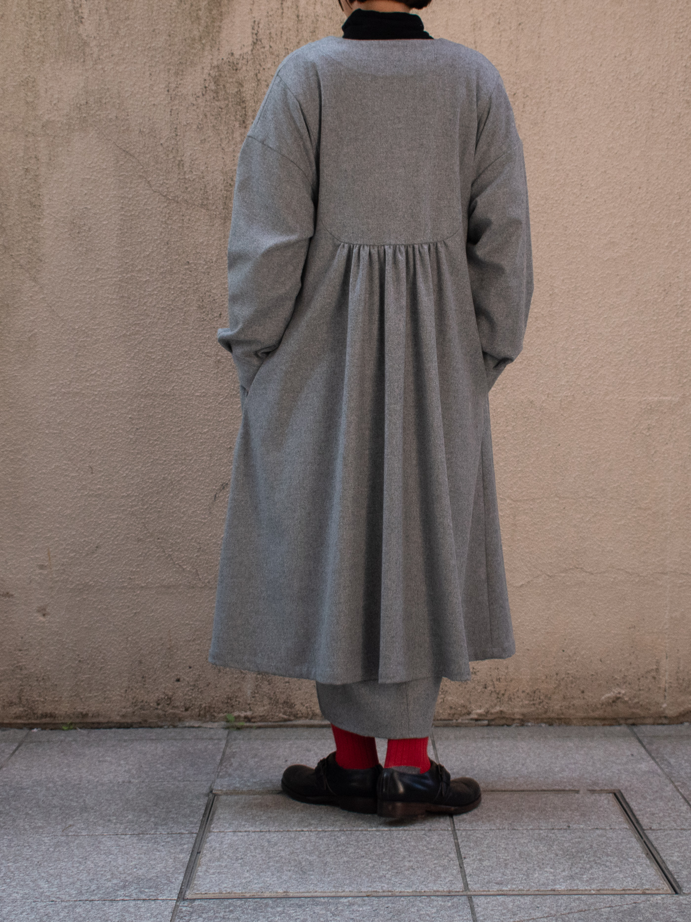 全体的にたっぷりと生地を使いながら、首元の程良い空き具合のVネックが引き締めてくれます。