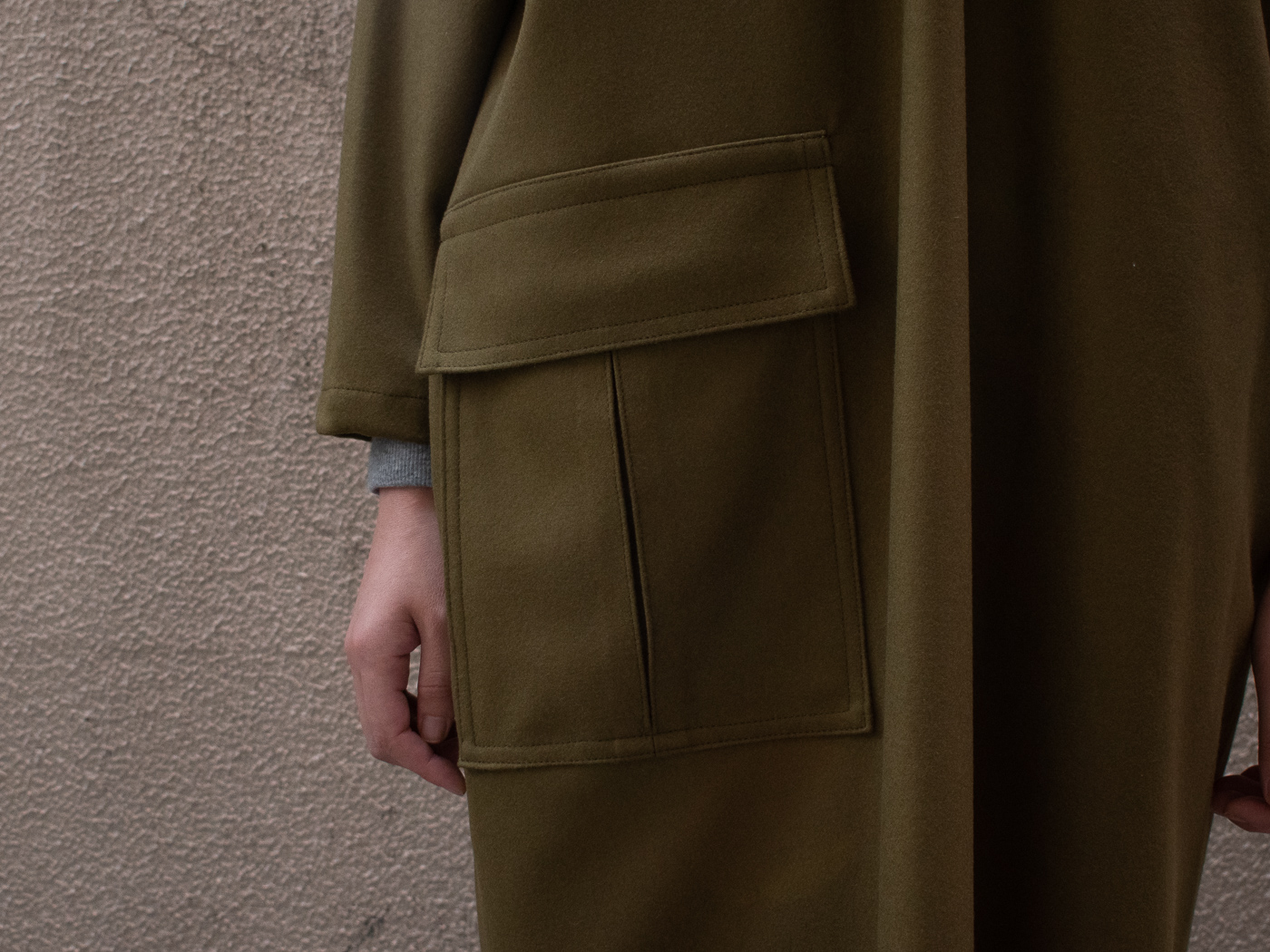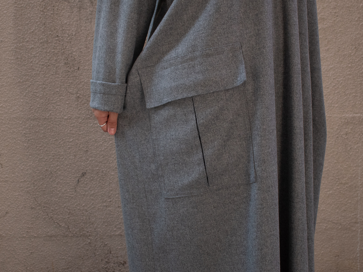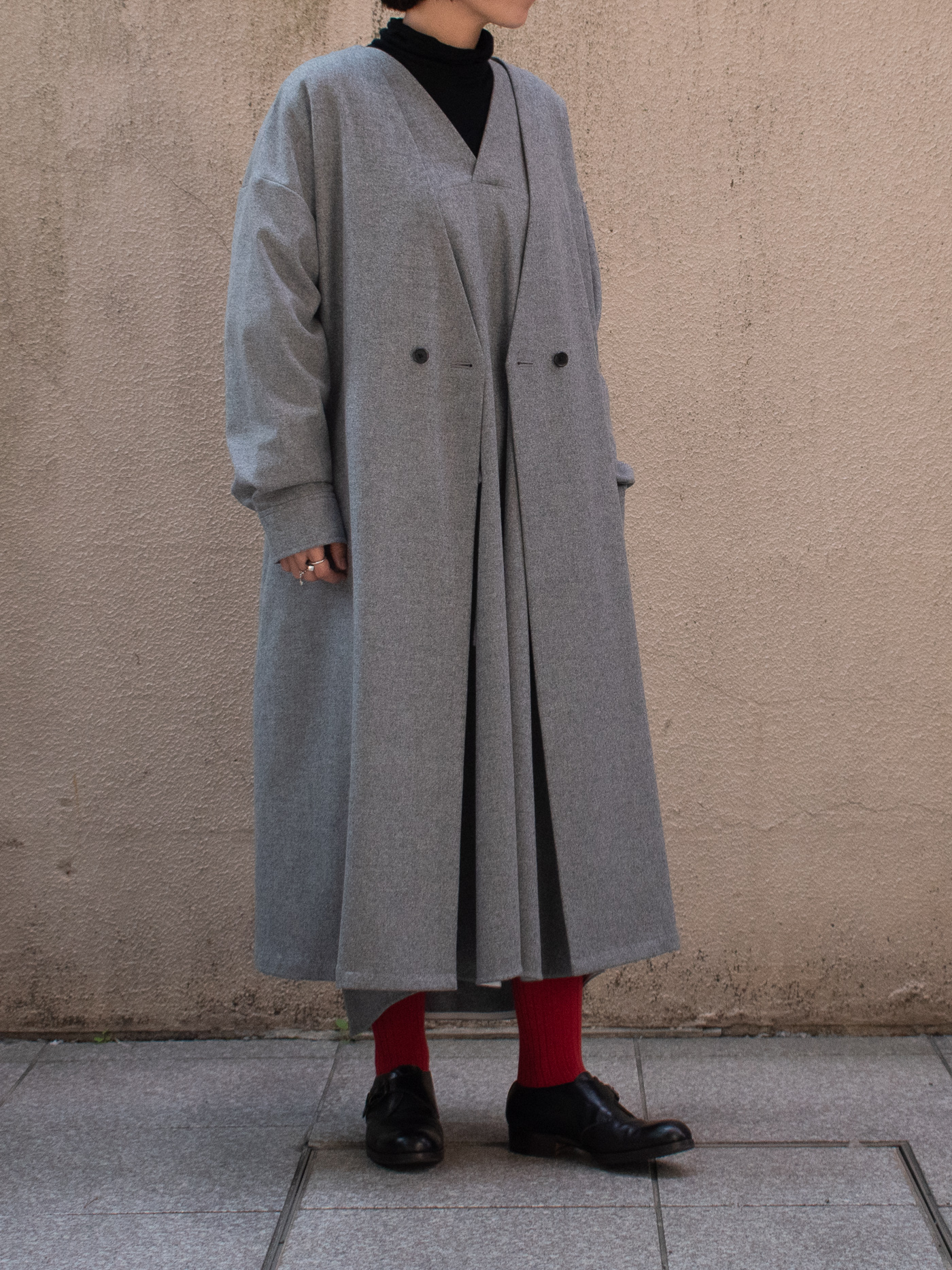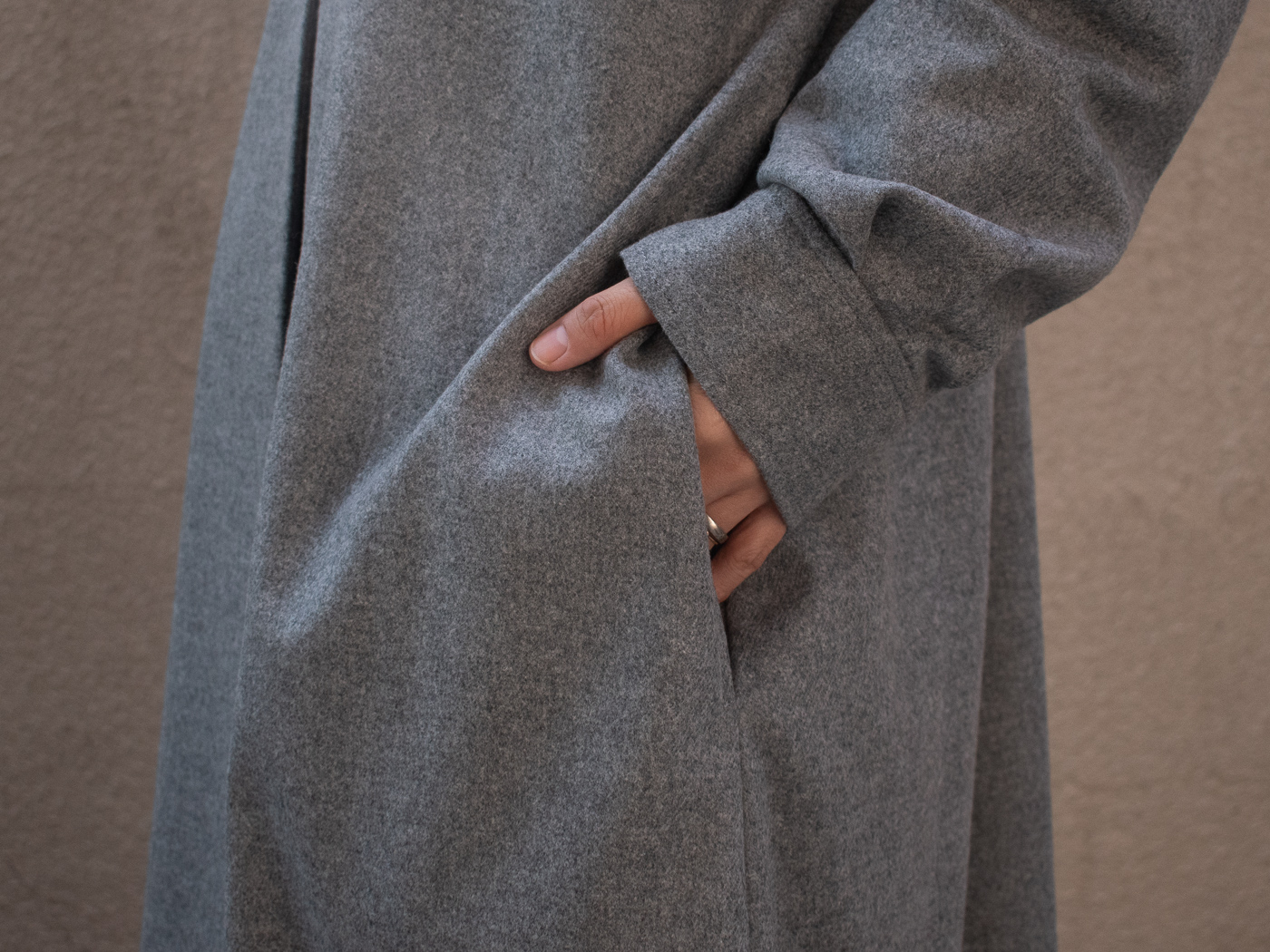 全体的にたっぷりと生地を使いながら、首元の程良い空き具合のVネックが引き締めてくれます。