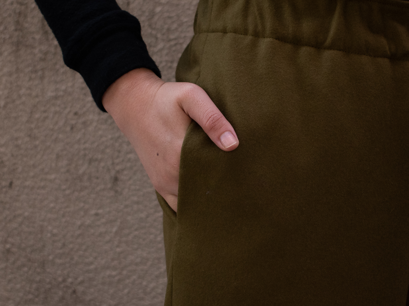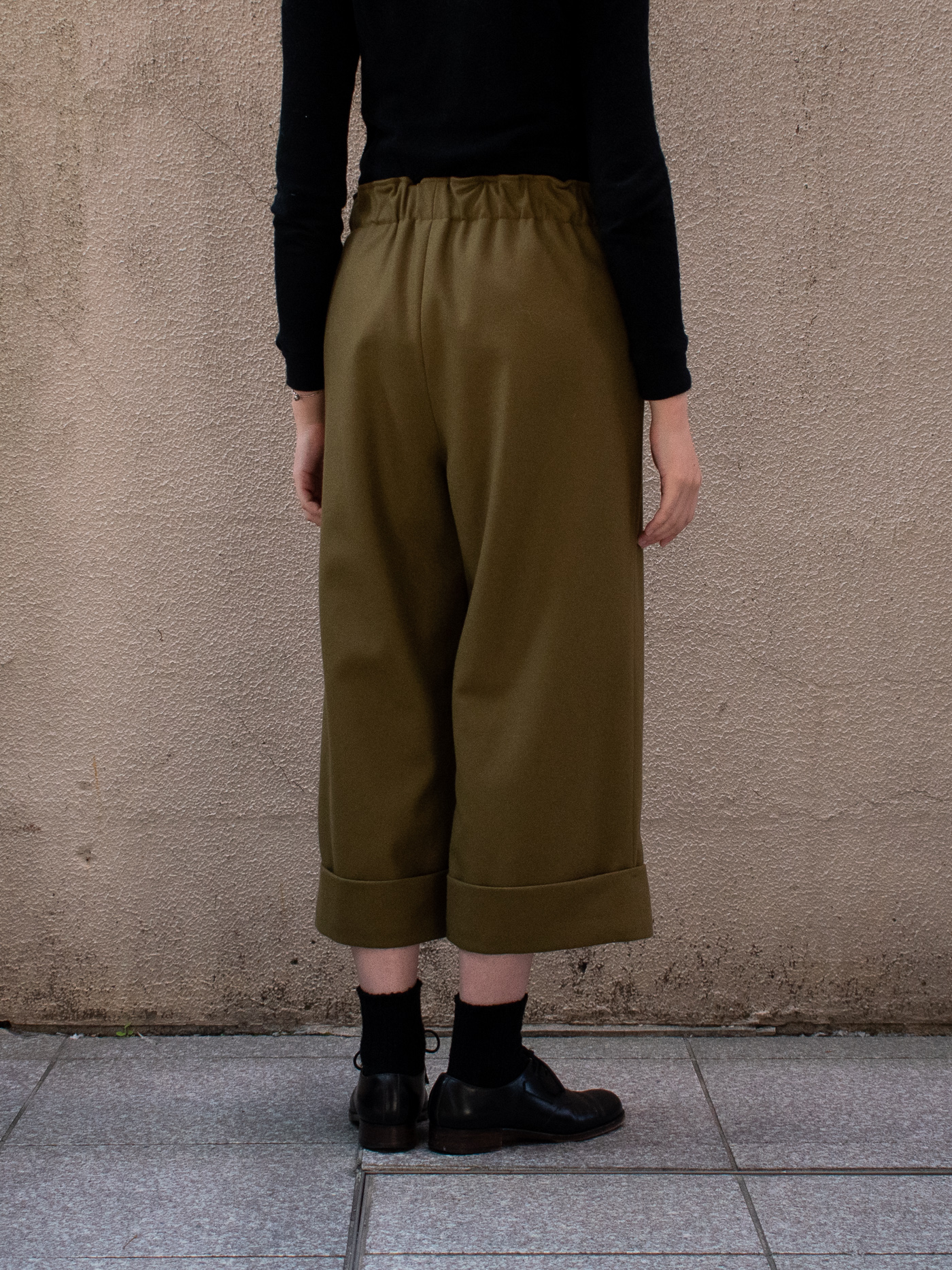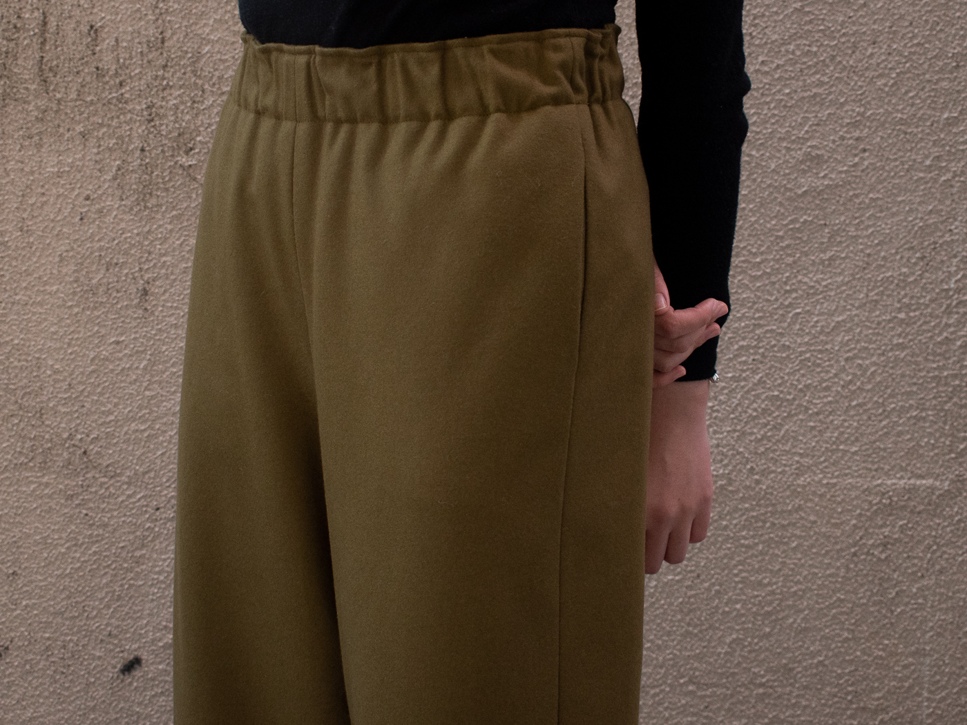 ウエストからストンと落ち、幅のあるダブル仕上げの裾。