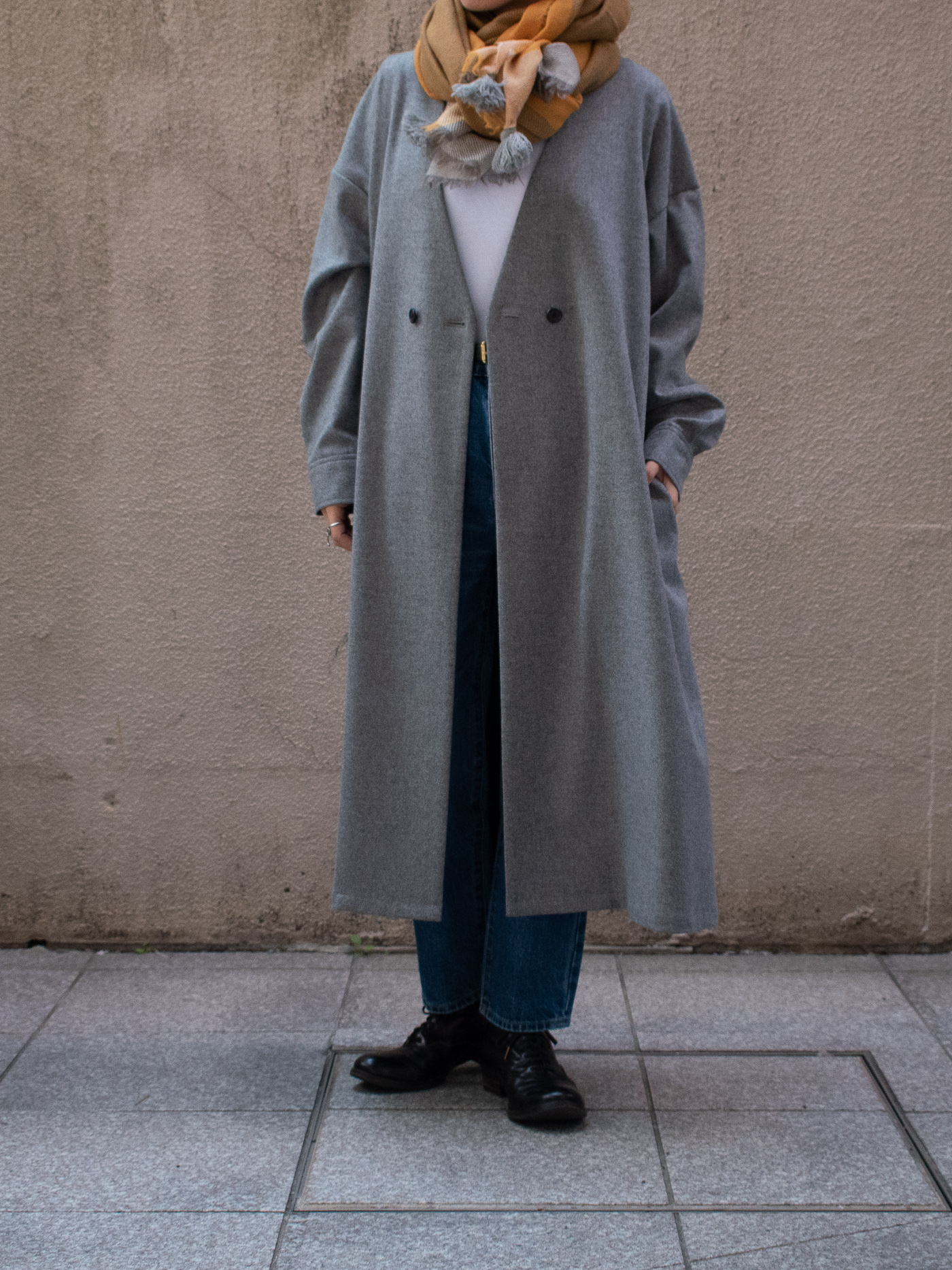 ノーカラーなので、首元にくるくるっとストールを巻くスタイルも好き。