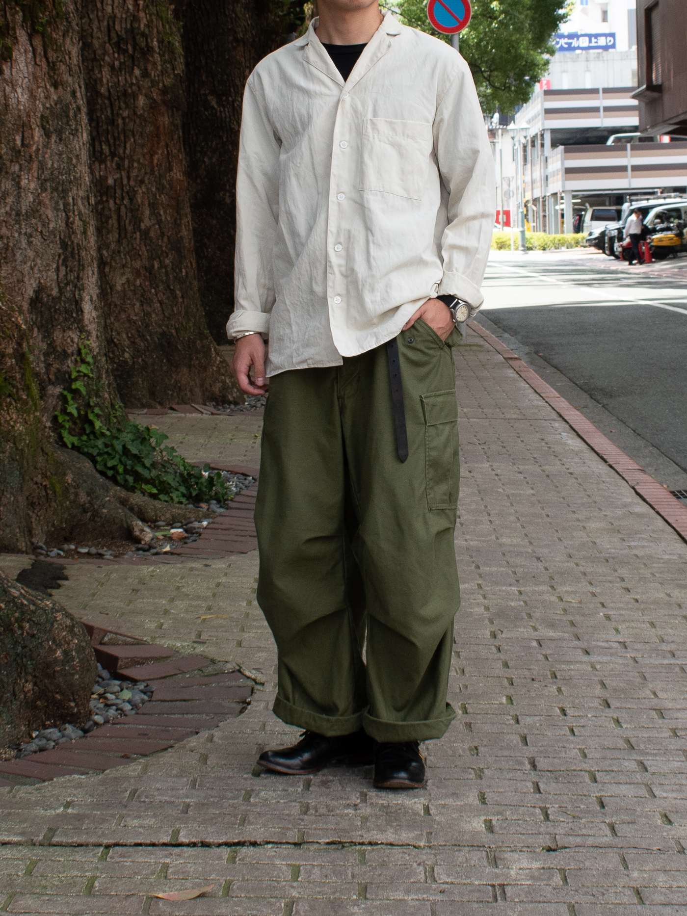 そして、コートとセットアップで合わせたいと真っ先に思い浮かんだのが、とても気に入っていた、ベルテッドのワイドパンツ。