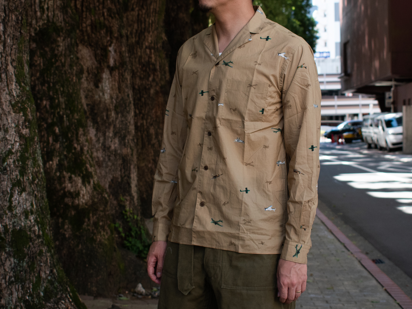 襟元が特徴的なこちらのシャツ。