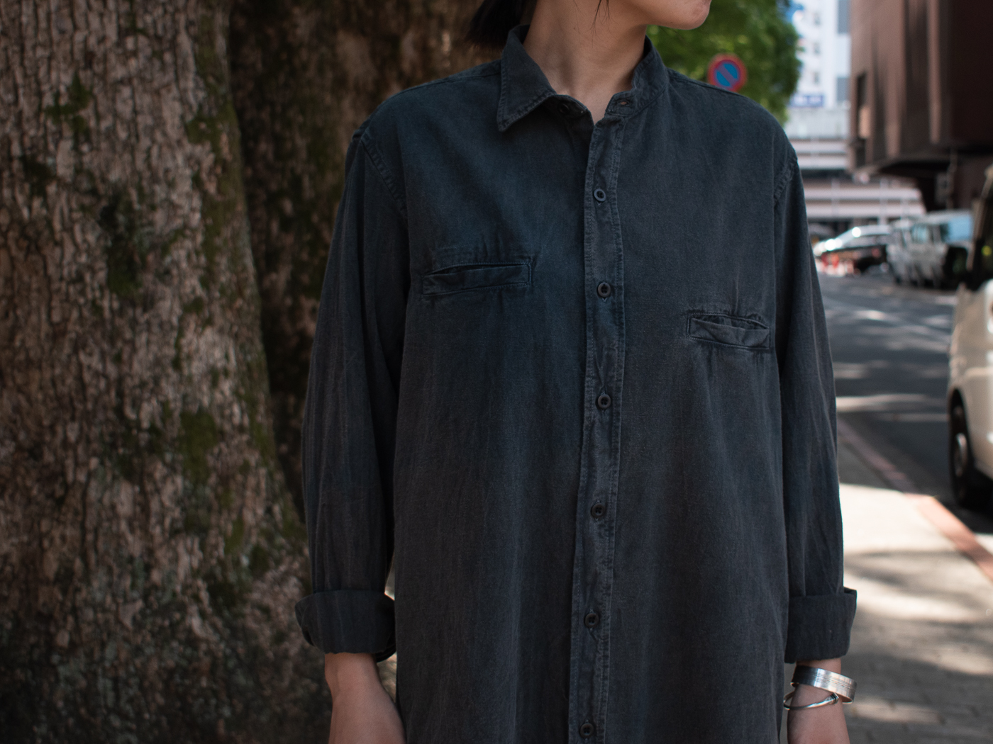 OUTILのデザイナーも普段から良く着ているアシンメトリーのシャツにも通じる、新型のシャツワンピース。