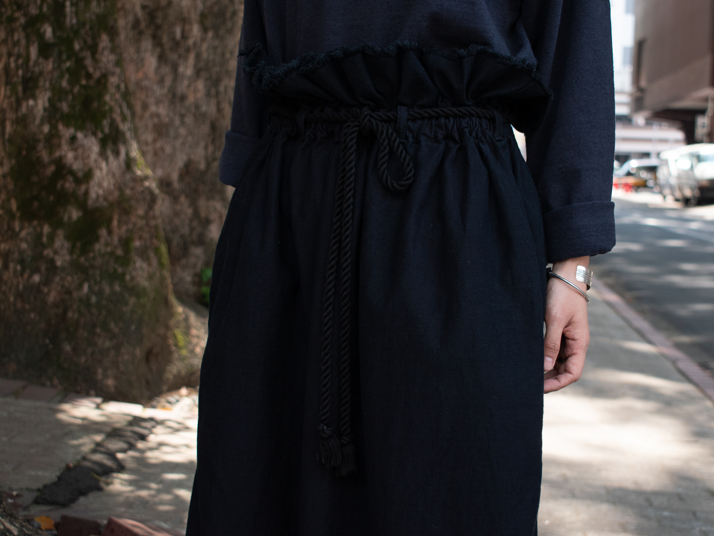 個人的に、背中のディティールもとても好きで、涙開きになった首後ろは、共地の紐を付けて、たらりとリボンの様に垂らしてアクセントに。