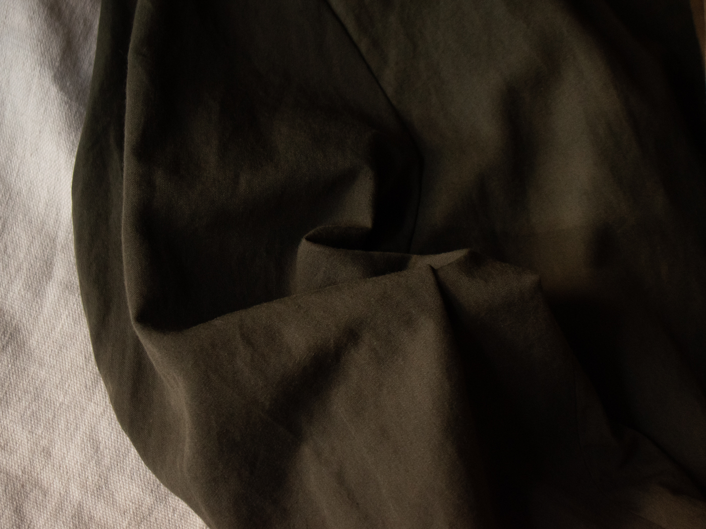 僕自身、とても惹かれた部分でもあります。コットンラミーのハリがありながらも、やんわり柔らかさのある生地感にオイルドの雰囲気がとてもピッタリ。