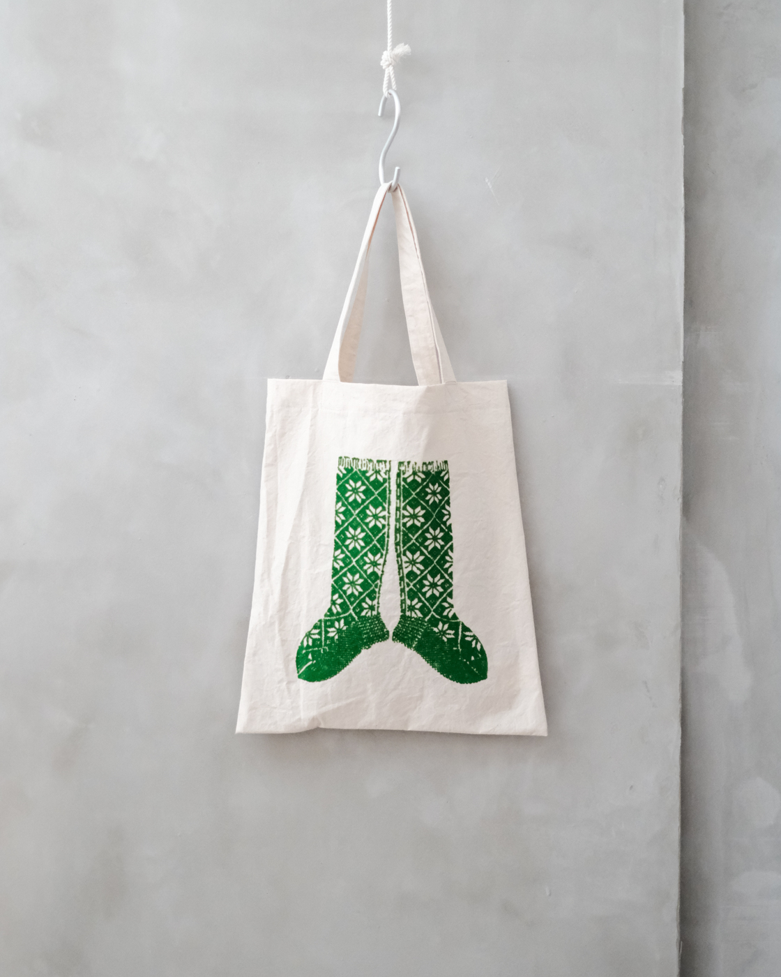 靴下のイラストはフロッキープリントで、立体感あるノルディック柄の靴下を。
