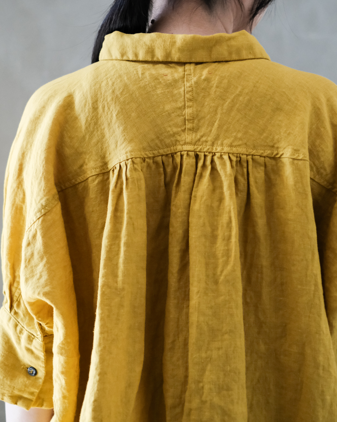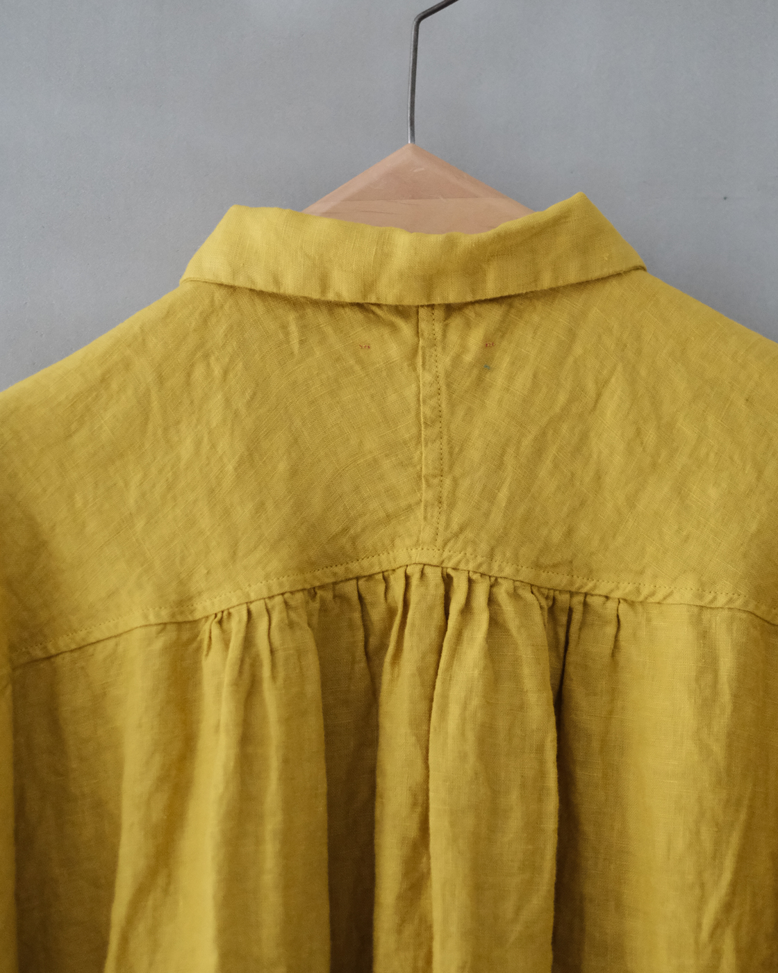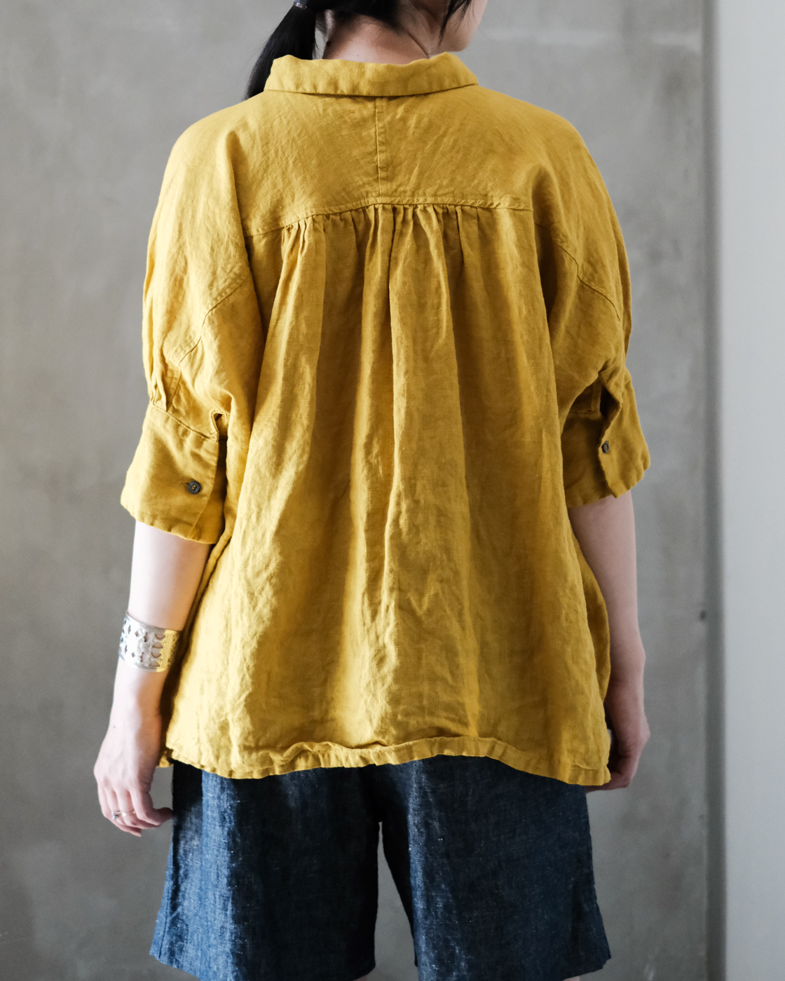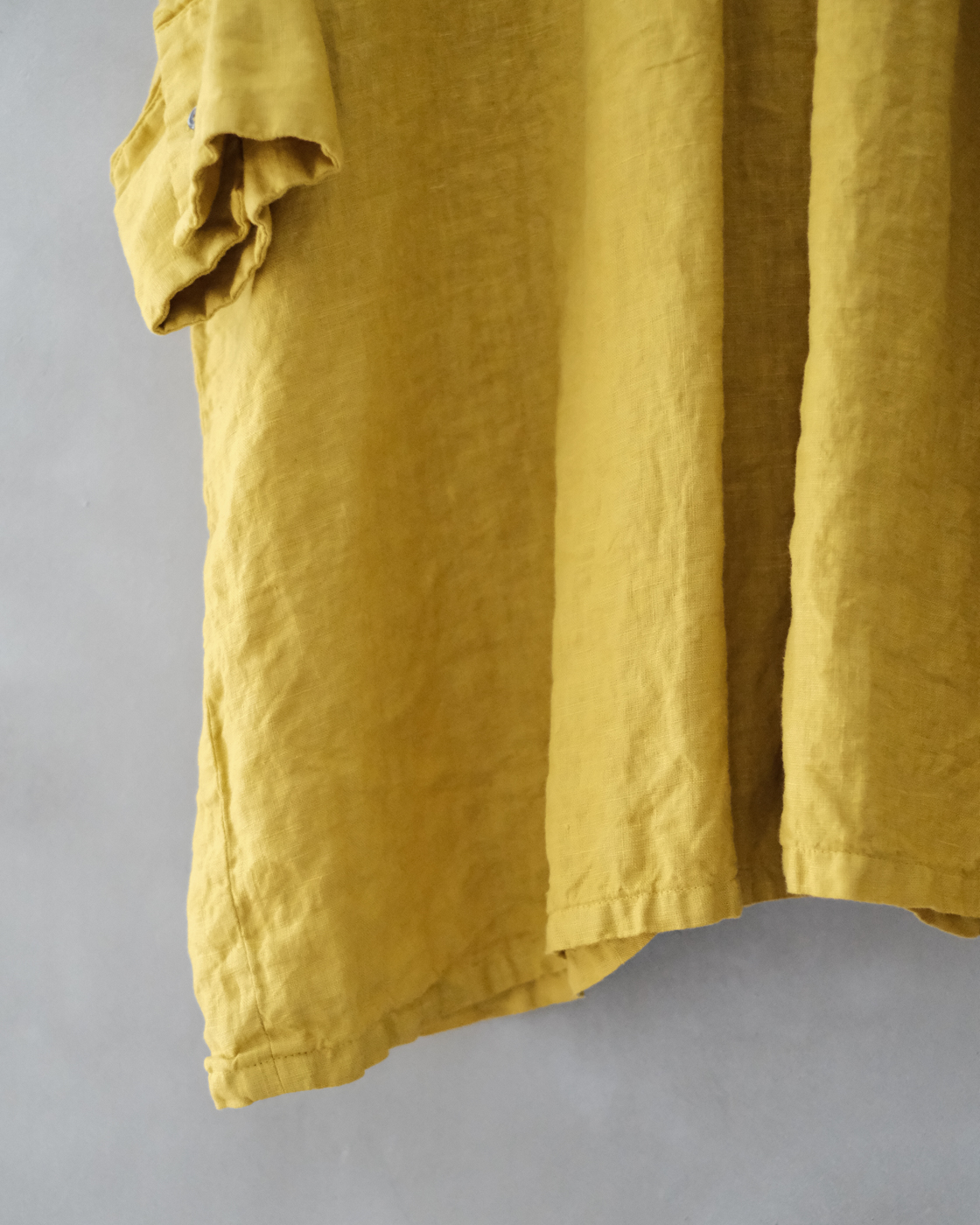 後染め・製品洗いを施しており、リネン特有のハリを感じながらも着始めからくたっと柔らかく、大変心地良い一着です。
