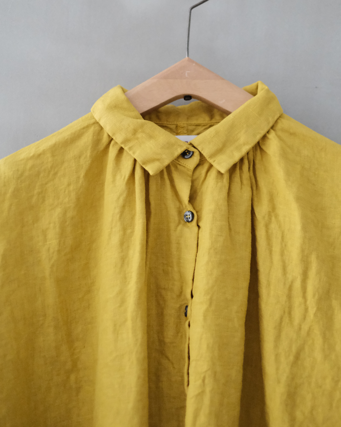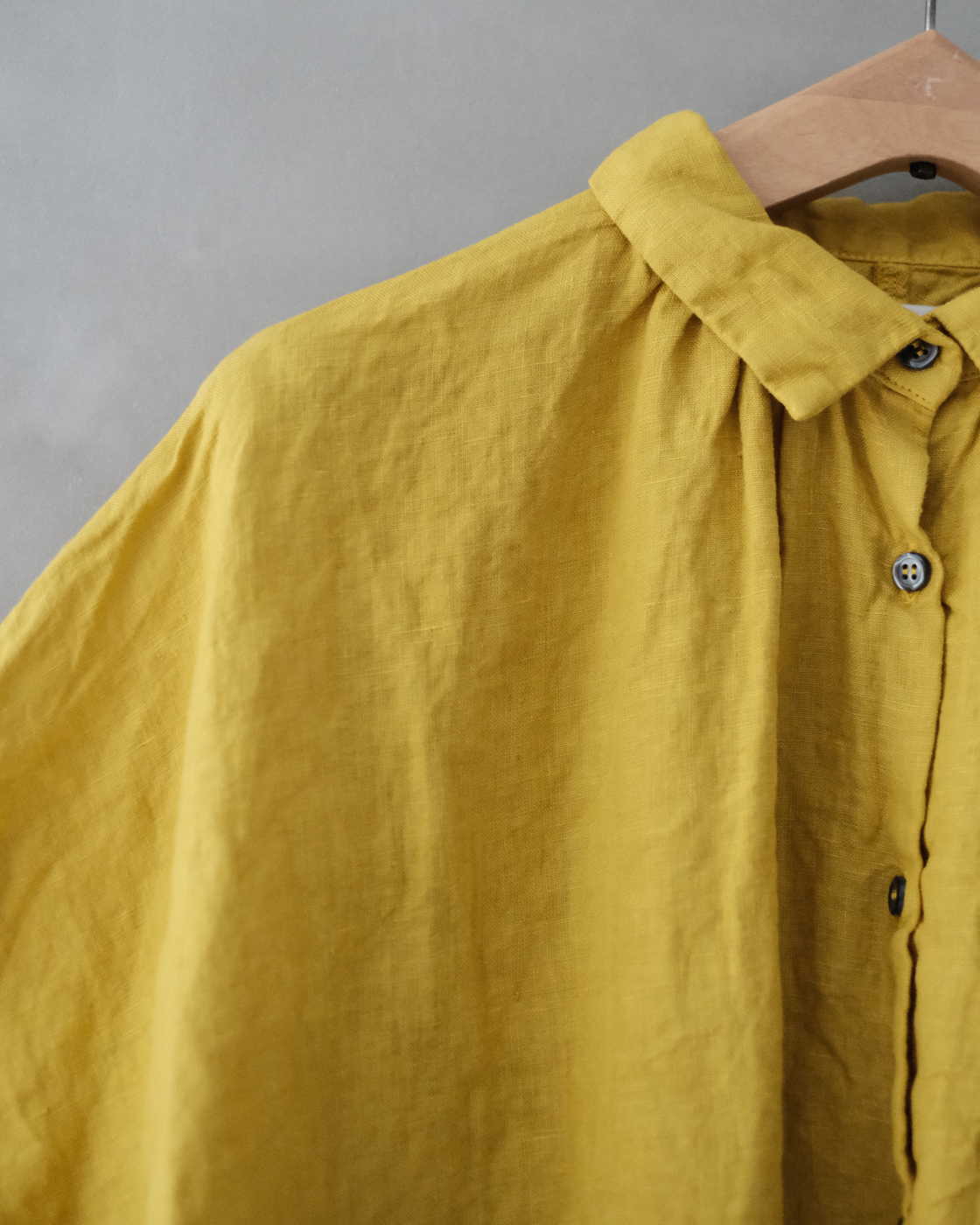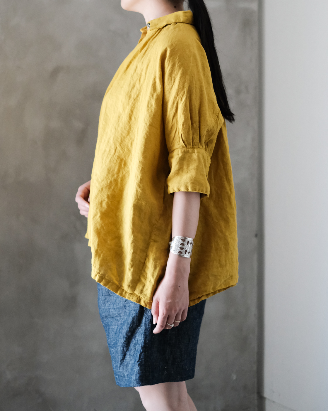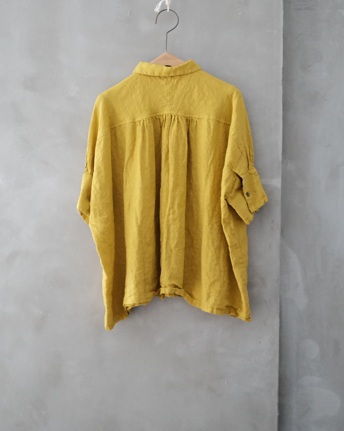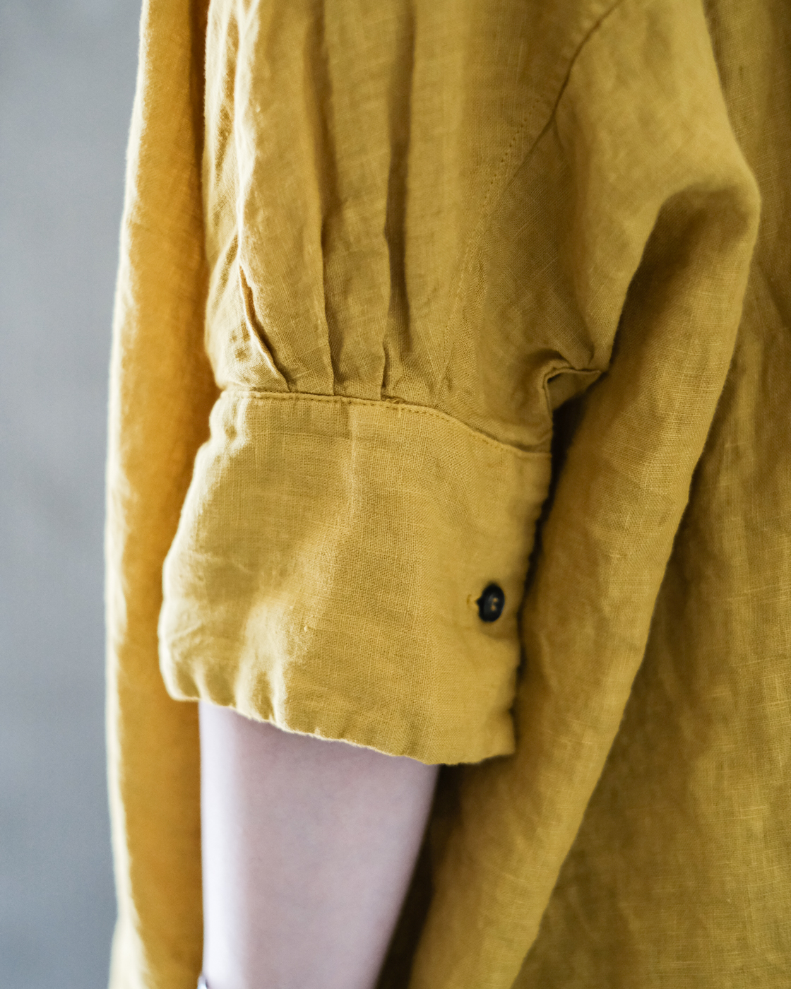 後染め・製品洗いを施しており、リネン特有のハリを感じながらも着始めからくたっと柔らかく、大変心地良い一着です。