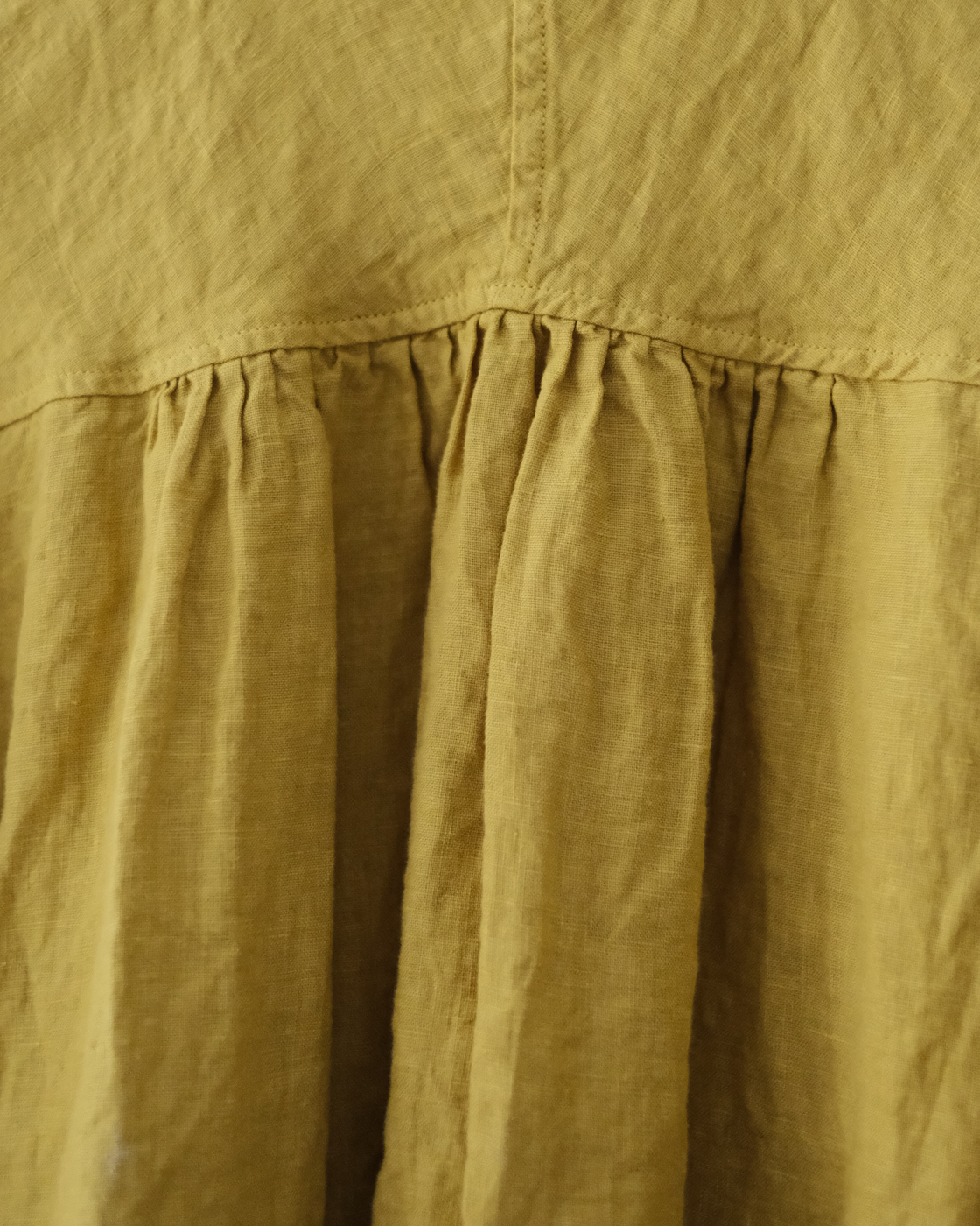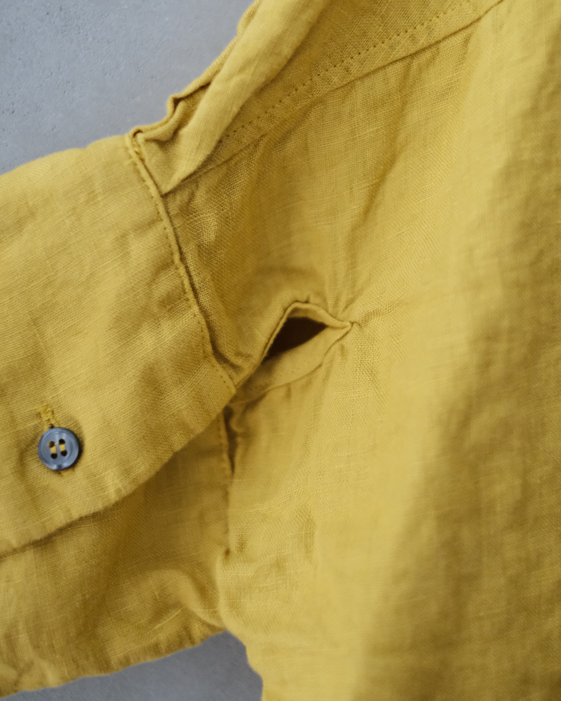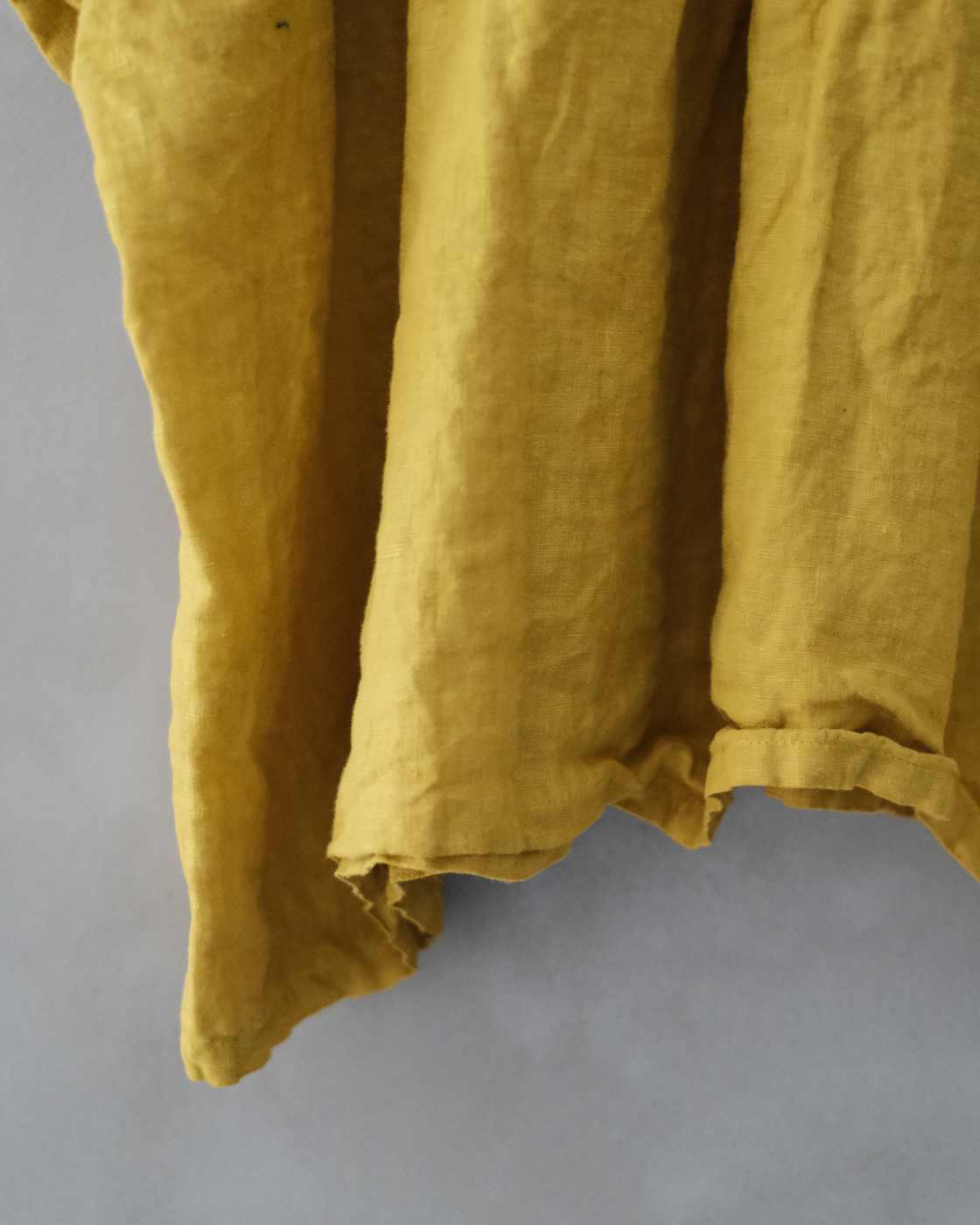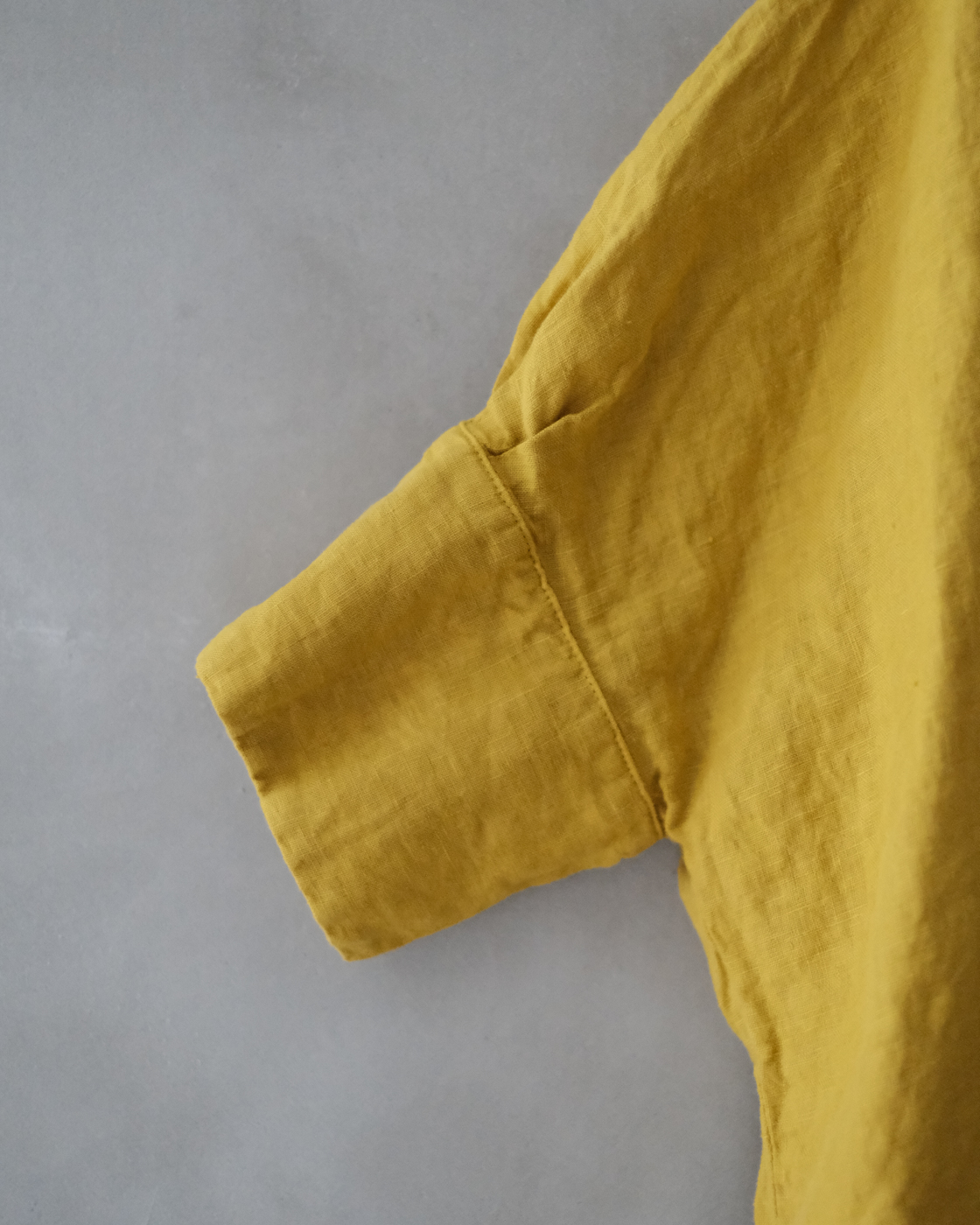 後染め・製品洗いを施しており、リネン特有のハリを感じながらも着始めからくたっと柔らかく、大変心地良い一着です。