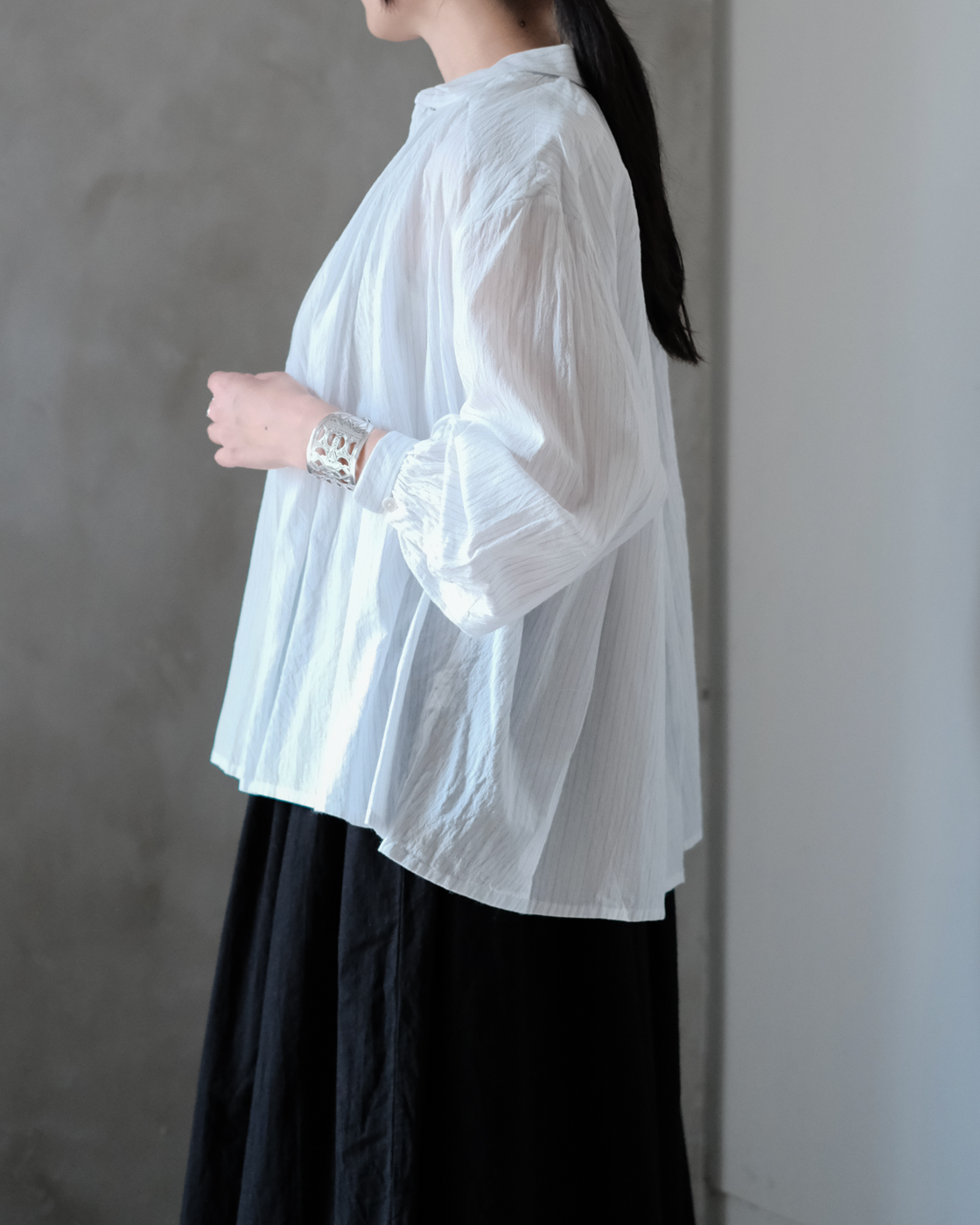 シンプルなコーディネートでも際立つ存在感のあるブラウスは、パンツからスカートまで幅広いボトムスとの相性が良く、