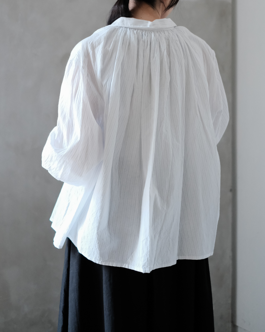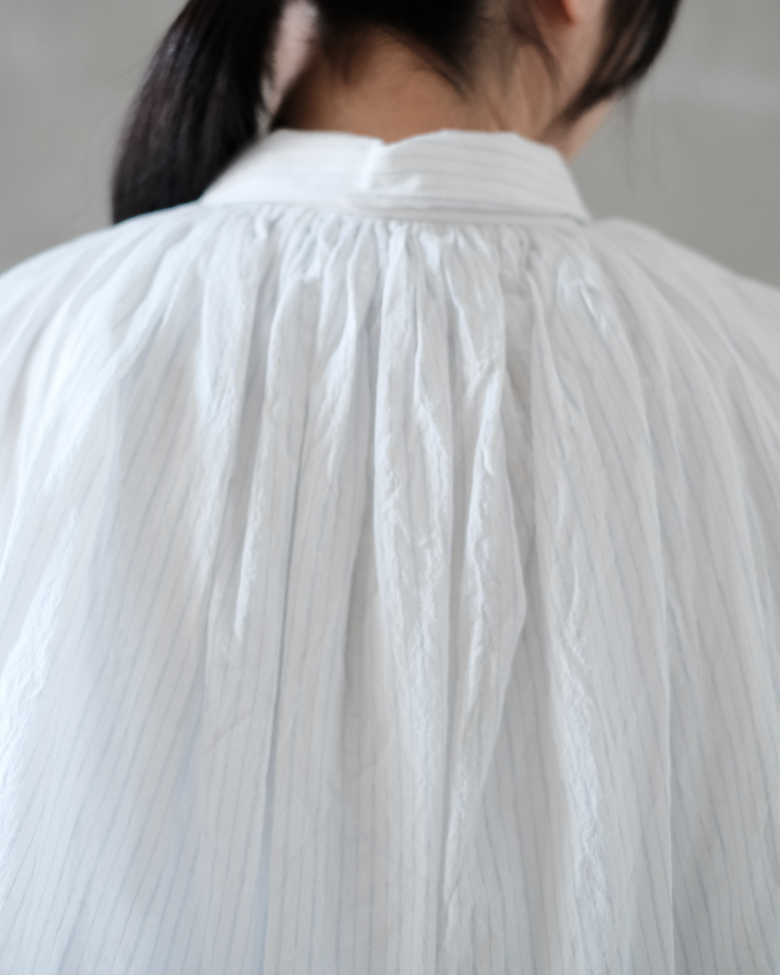 コンパクトな襟元は愛らしさがあり、首周りには細かくギャザーが施されたつくりに。