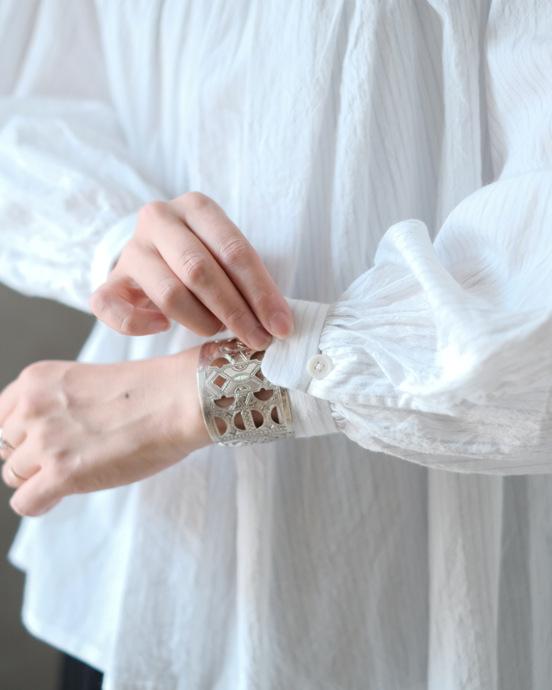 普段の装いをほんのり華やかに見せてくれるオススメのブラウスです。