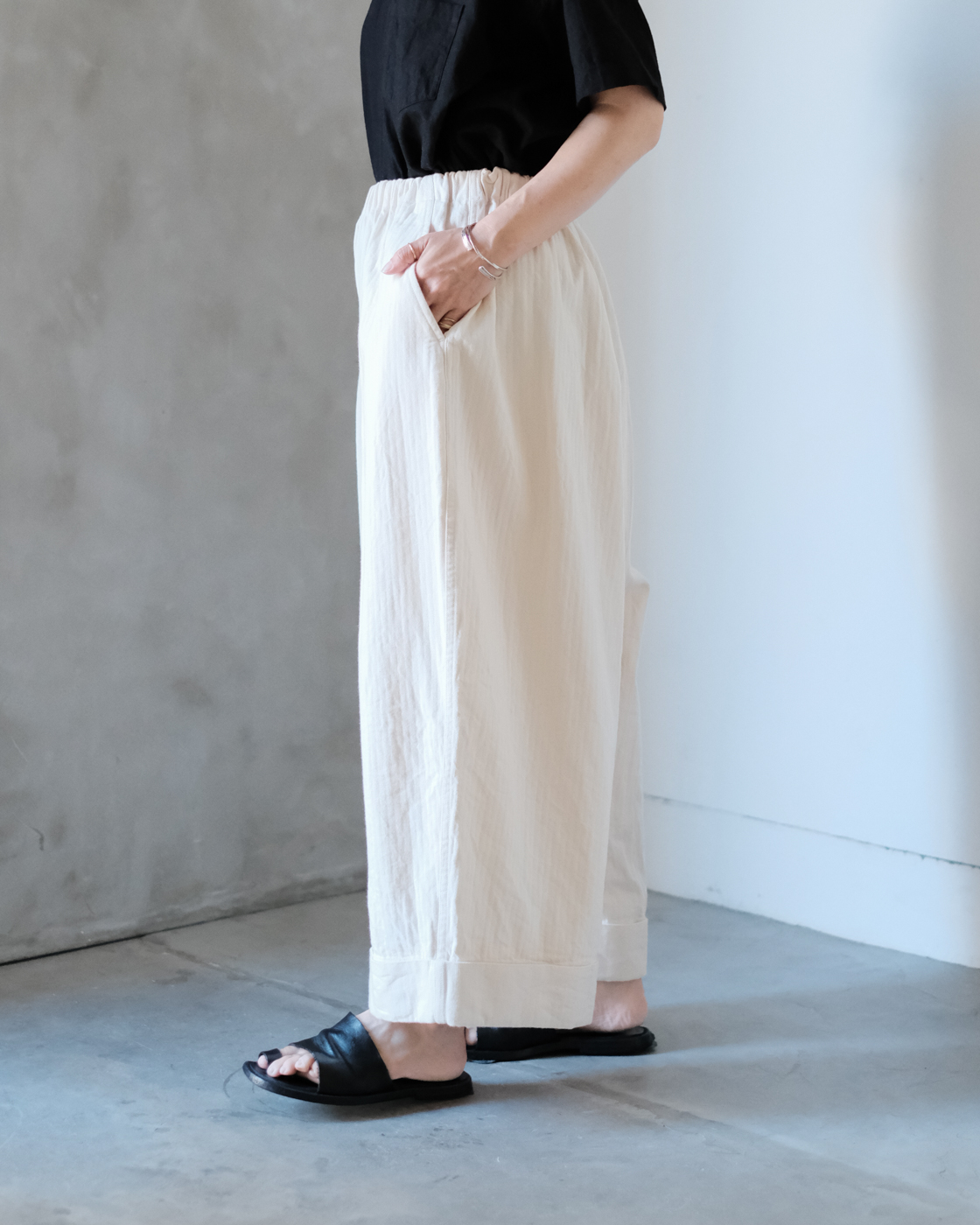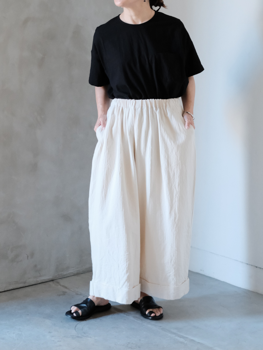 裾がダブルになっている為、シルエットにより立体感が強調され印象的なパンツに。