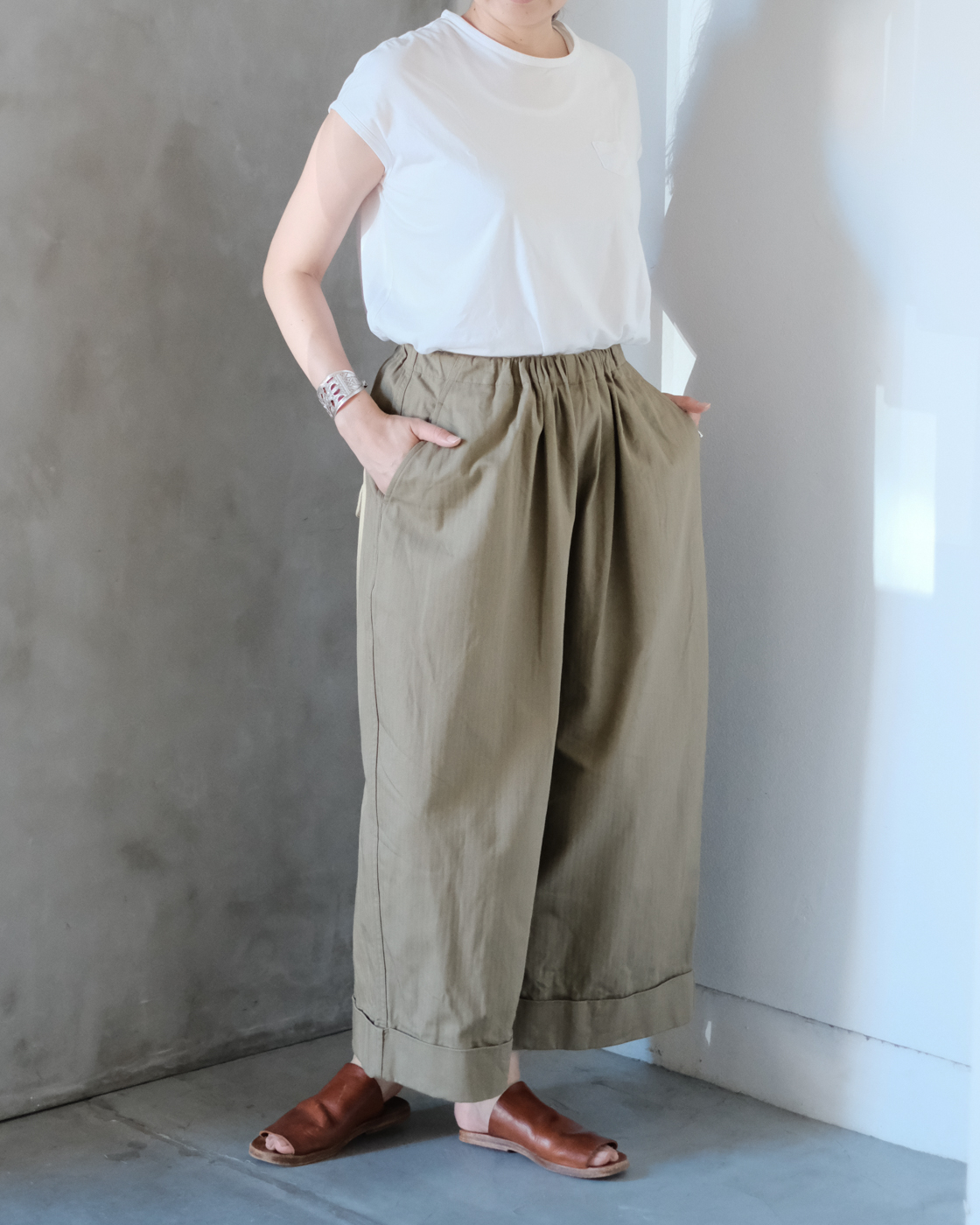 ボトムスに程よいボリュームが出る事で、シンプルなトップスでも存在感ある着こなしに。