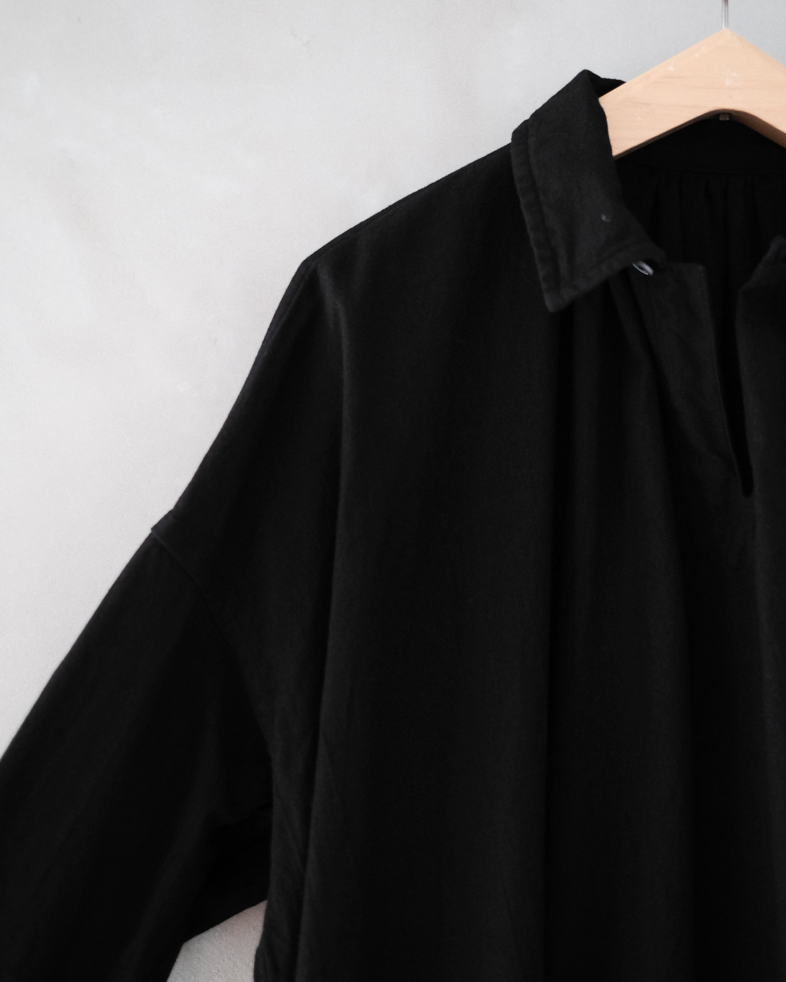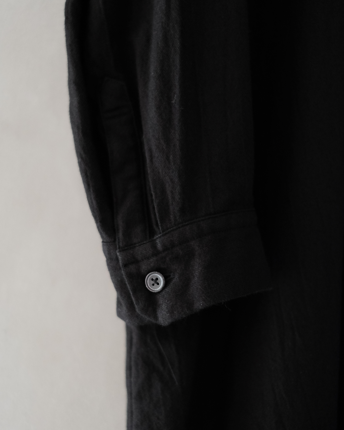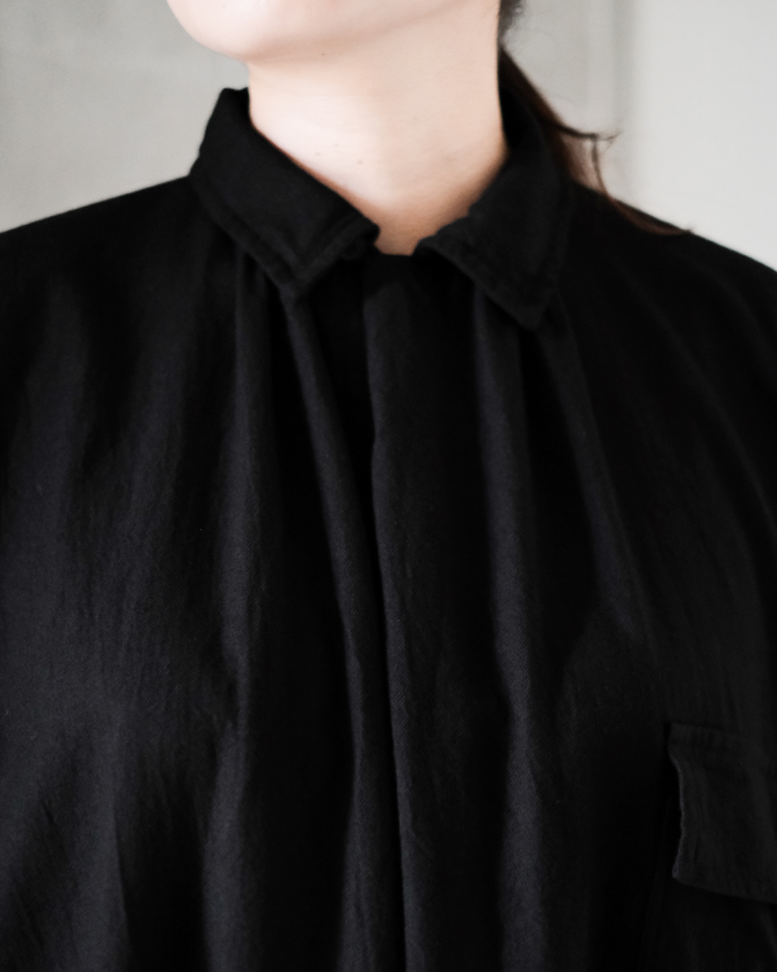 コンパクトな襟にループタイプの一つボタンがヴィンテージのスモッグのような雰囲気を感じさせます。