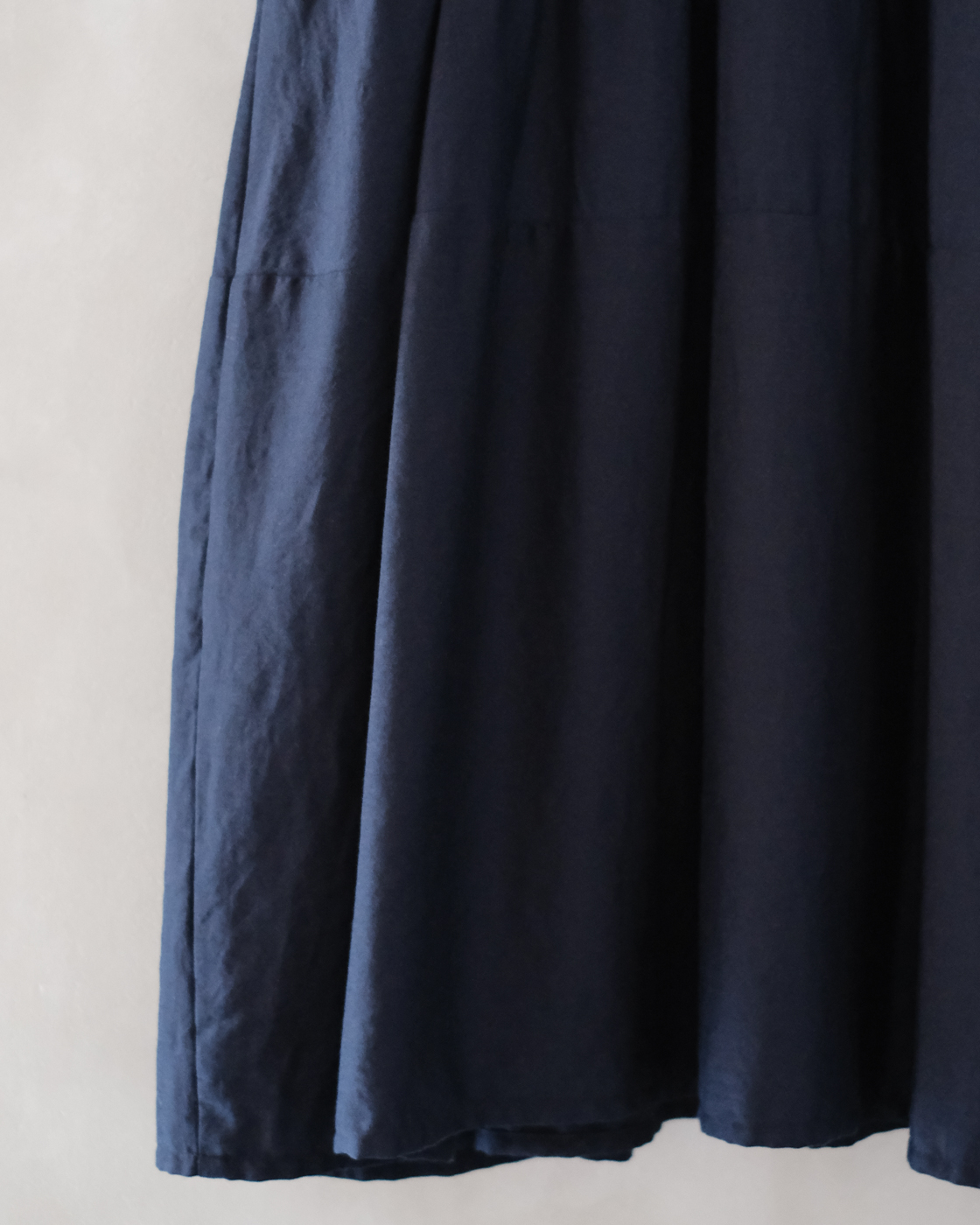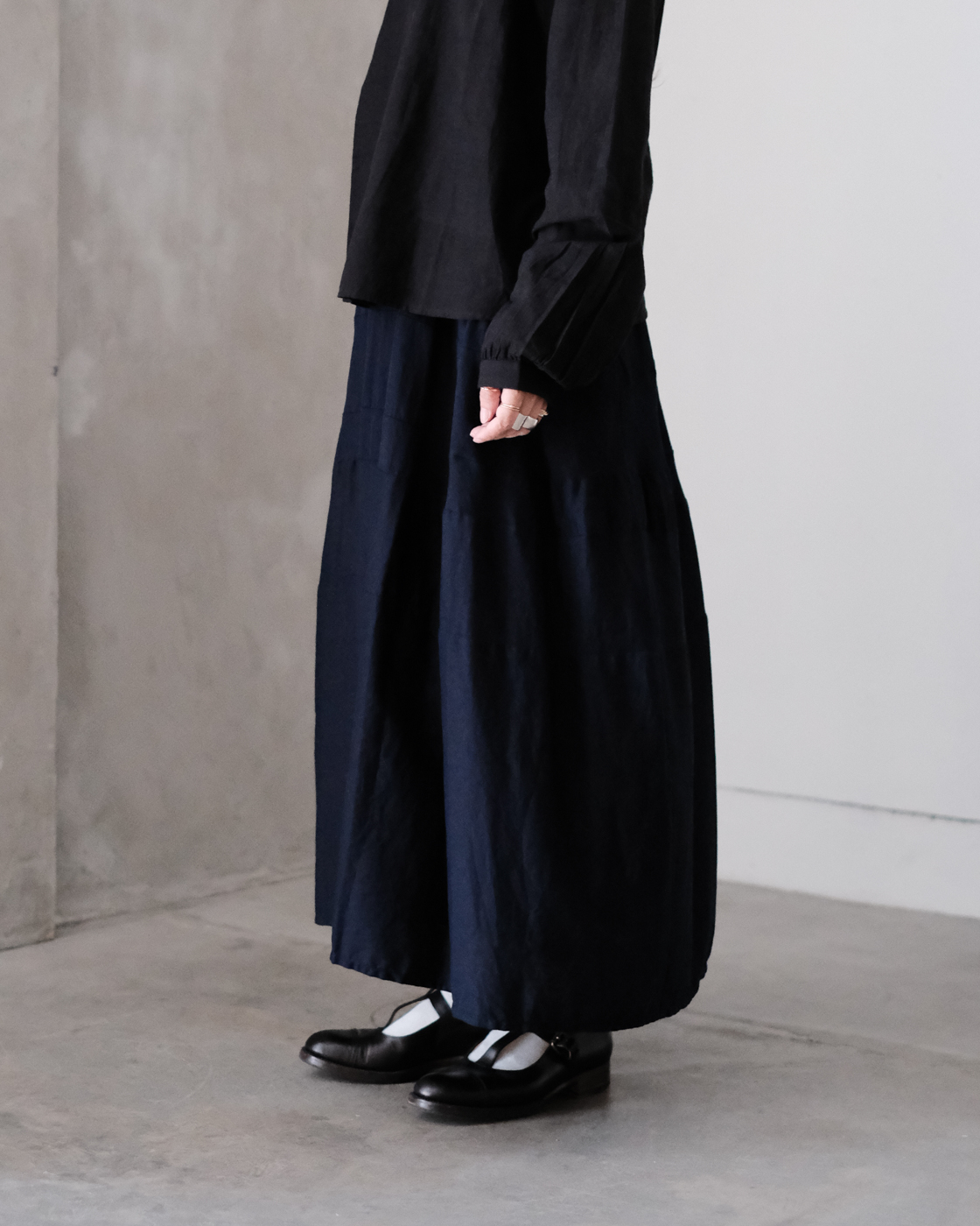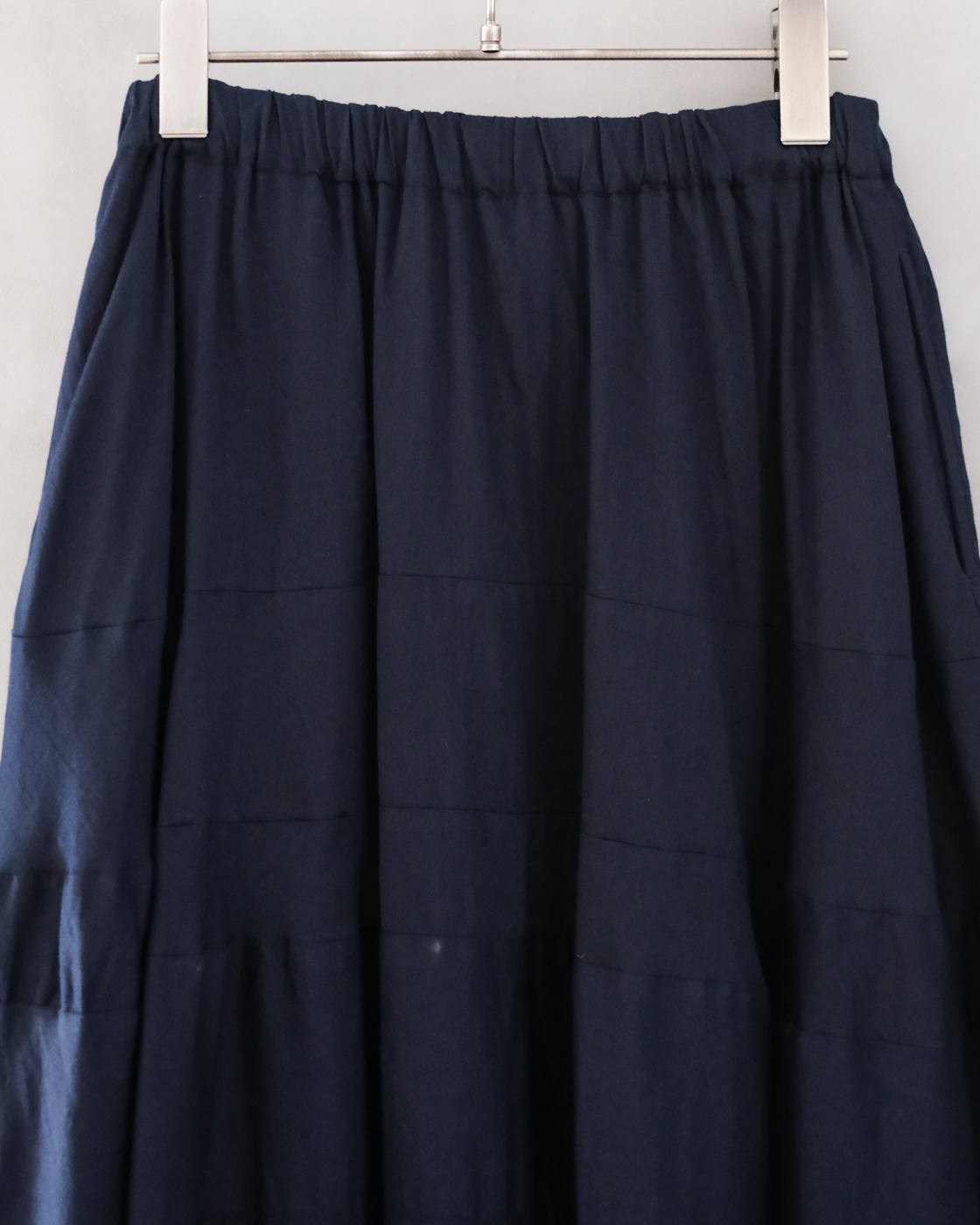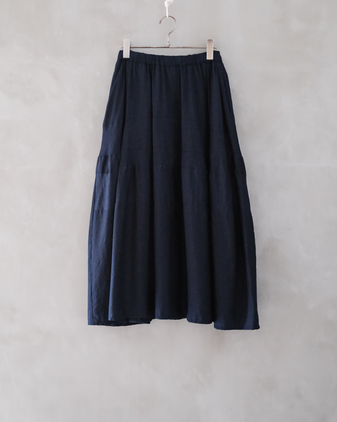 何枚をハギを合わせる事で裾にかけて美しいドレープが表れるのが魅力のスカートです。