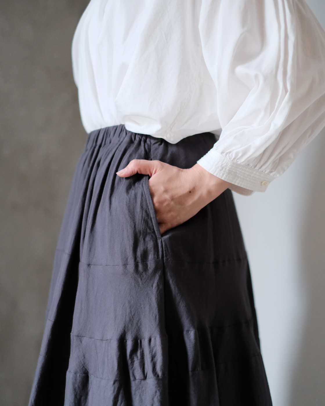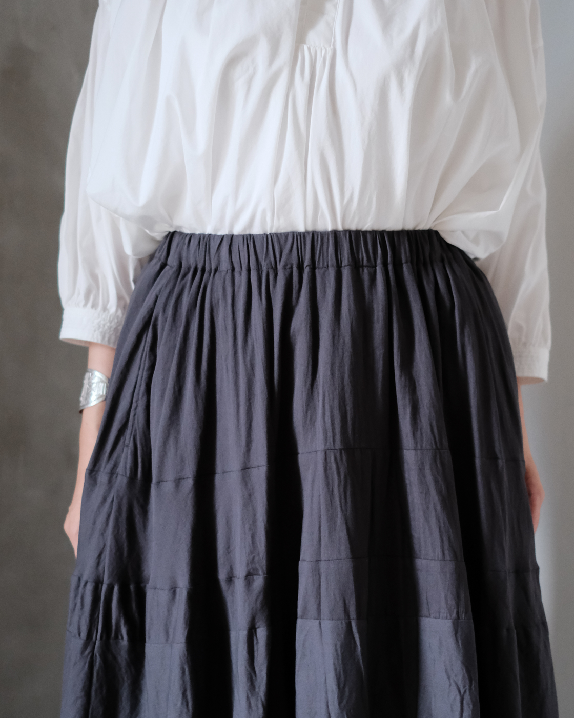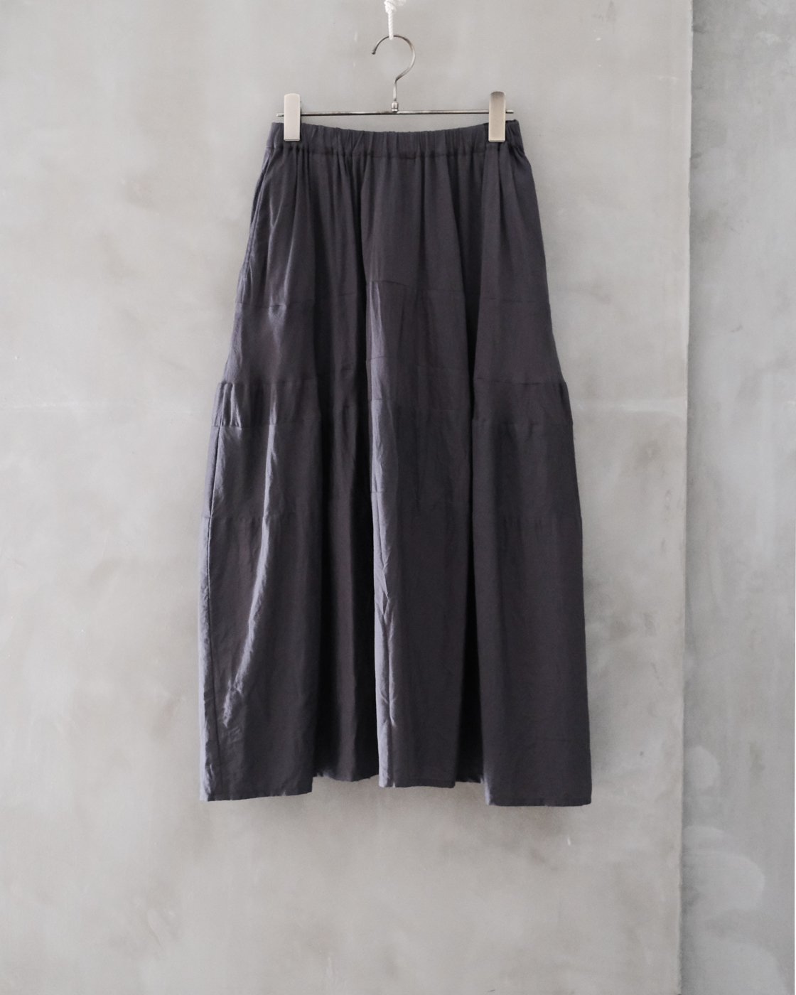 何枚をハギを合わせる事で裾にかけて美しいドレープが表れるのが魅力のスカートです。