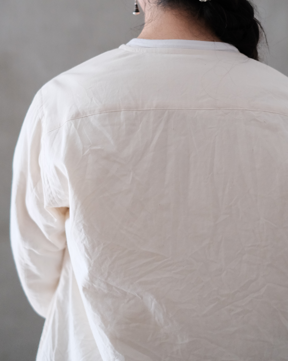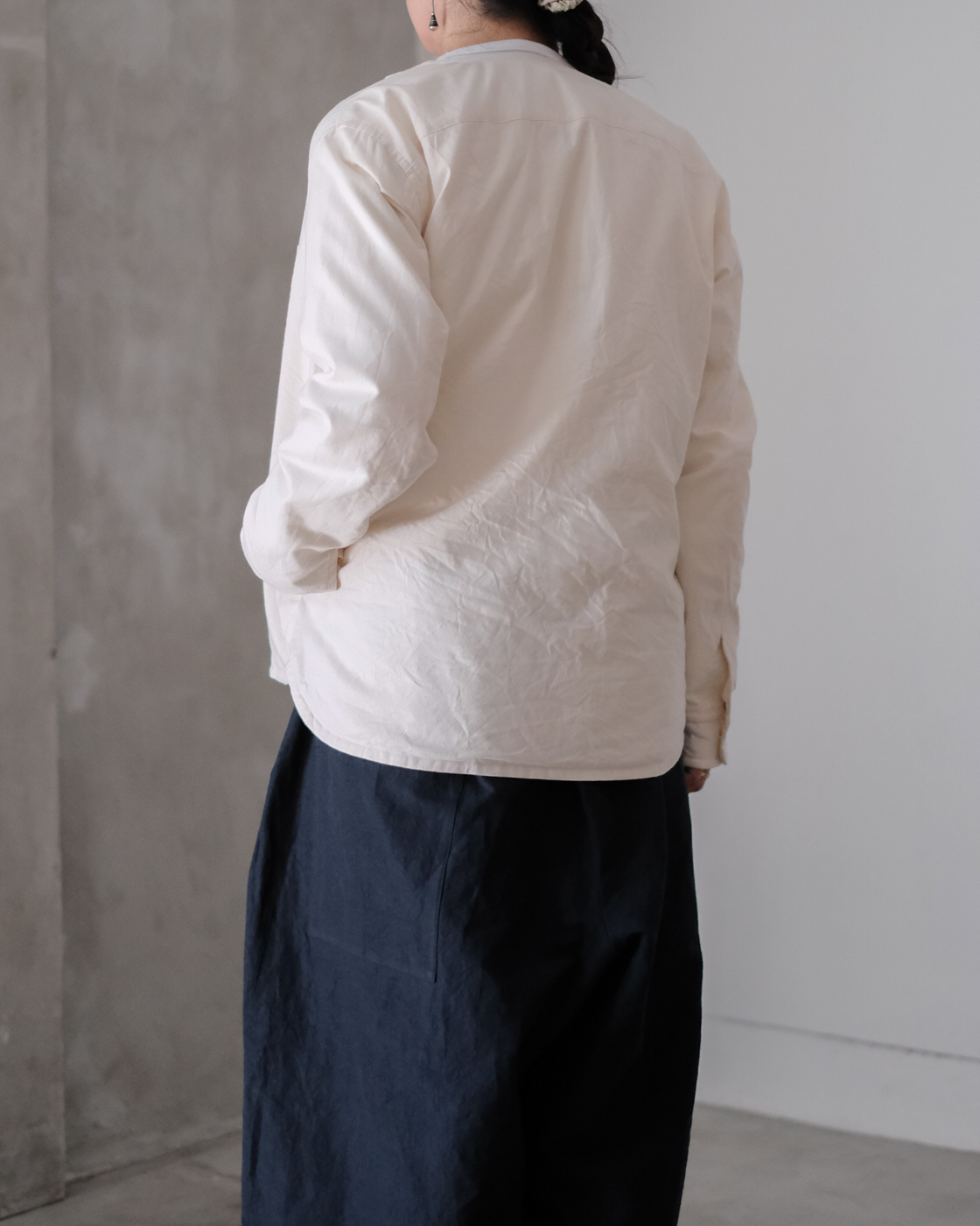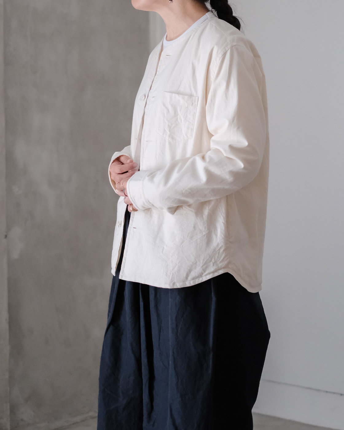 首元は詰まり過ぎず、開き過ぎずの程よいクルーネックで中にタートルやシャツを重ねて頂いた際もバランス良く見えます。