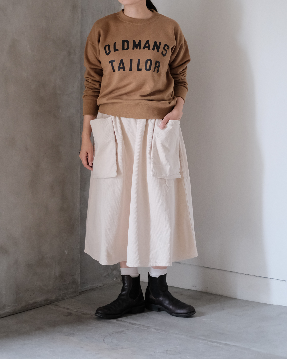 ヴィンテージのような細い畝のコーデュロイが品も感じるR&D.M.Co-の[CORDUROY POCKET SKIRT]のご紹介です。
