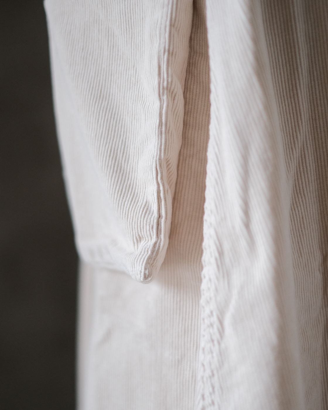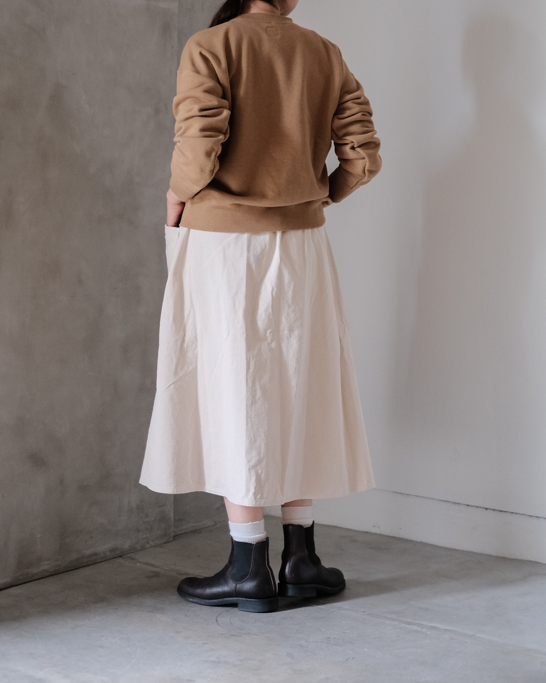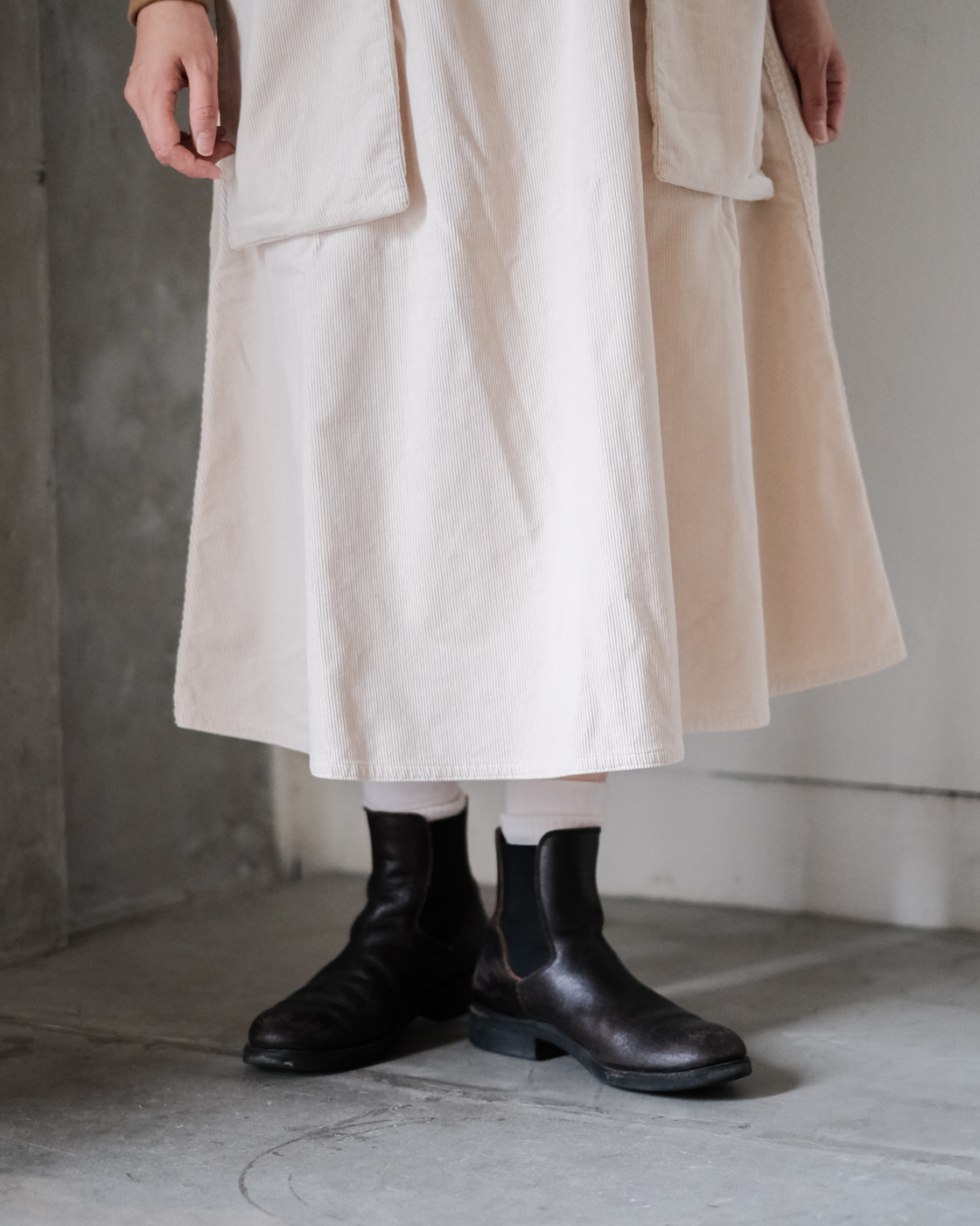 更に細い畝のコーデュロイの生地である事により、台形のシルエットが表現され上品な雰囲気も与えてくれます。
