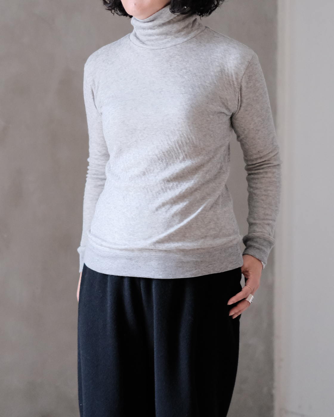 シンプルなゆえに縫い目が目立たないような丁寧な縫製がされており、体に沿うようなスッキリとしたシルエットは重ね着用としても万能アイテム。