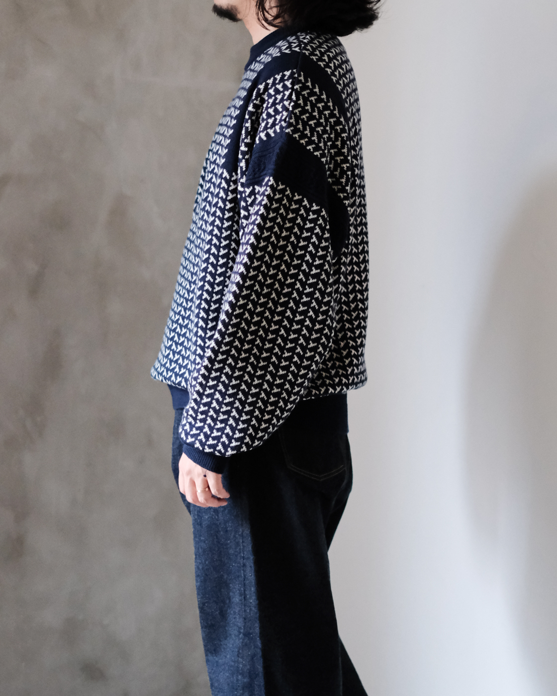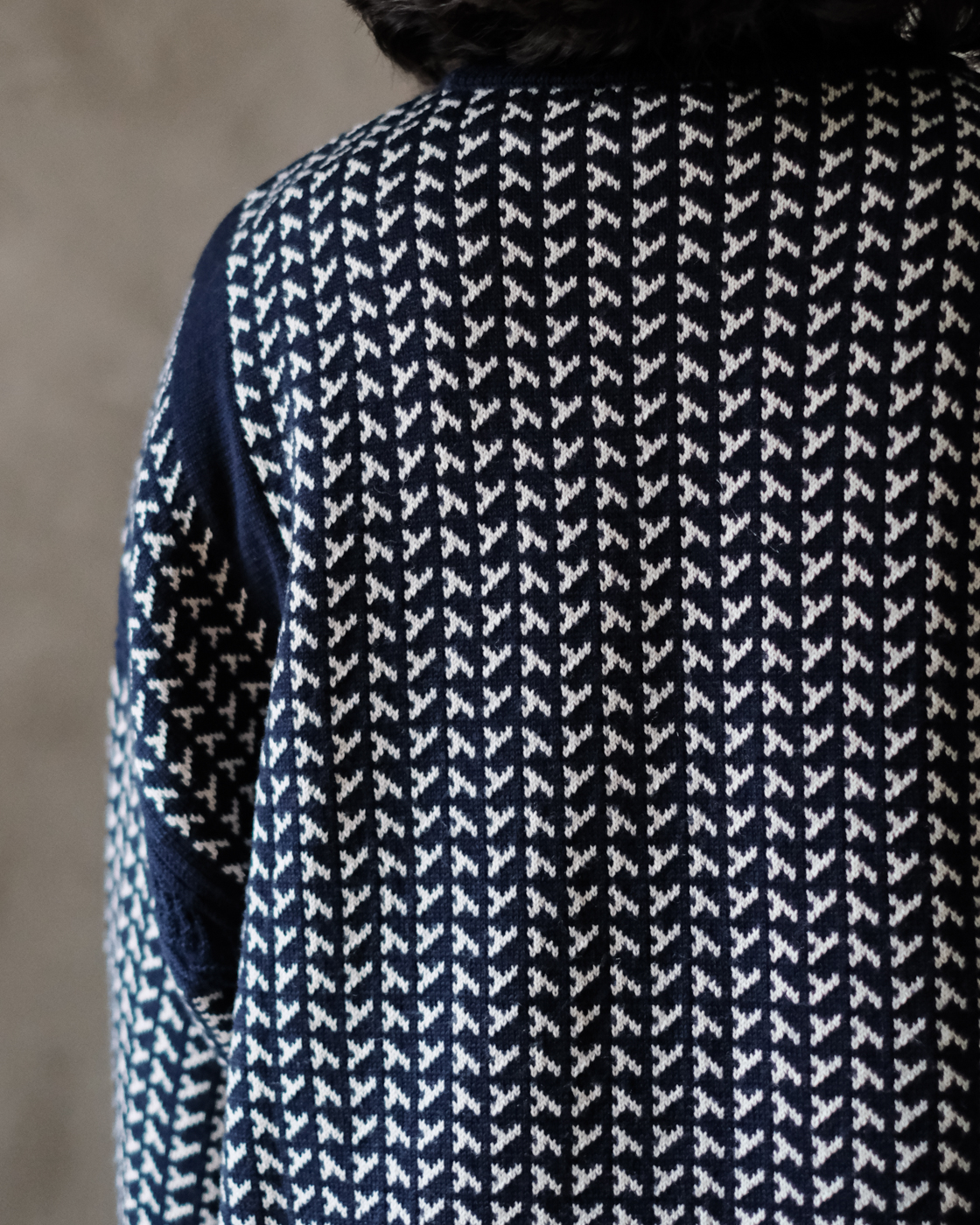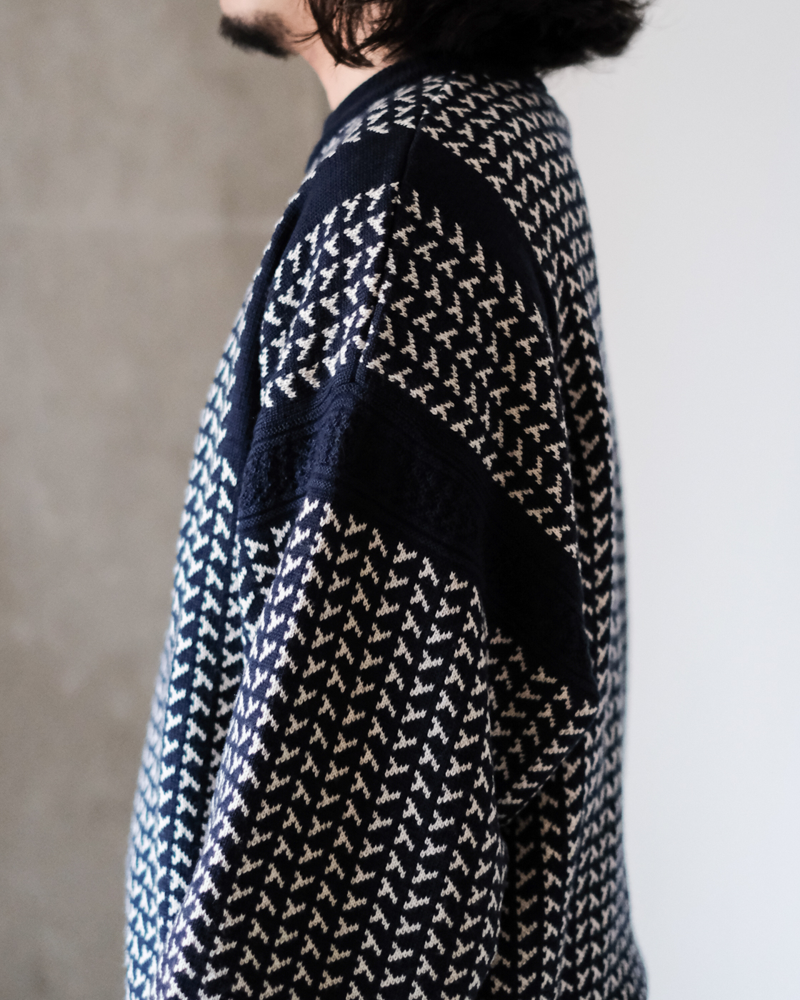 風もない静かな夜、雪がしんしんと降り積もる様子をイメージして編まれたシングルジャカードニットです。