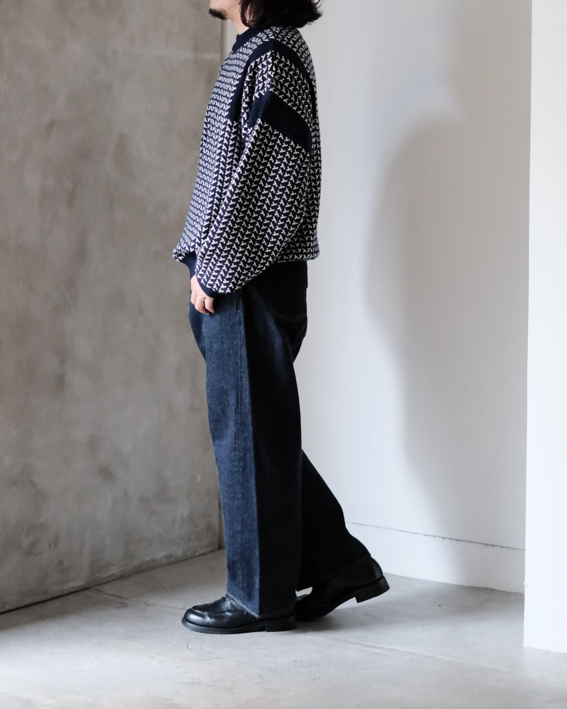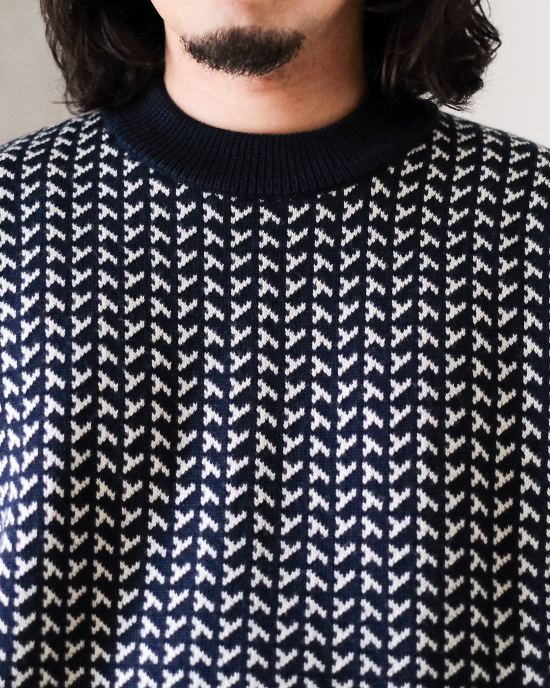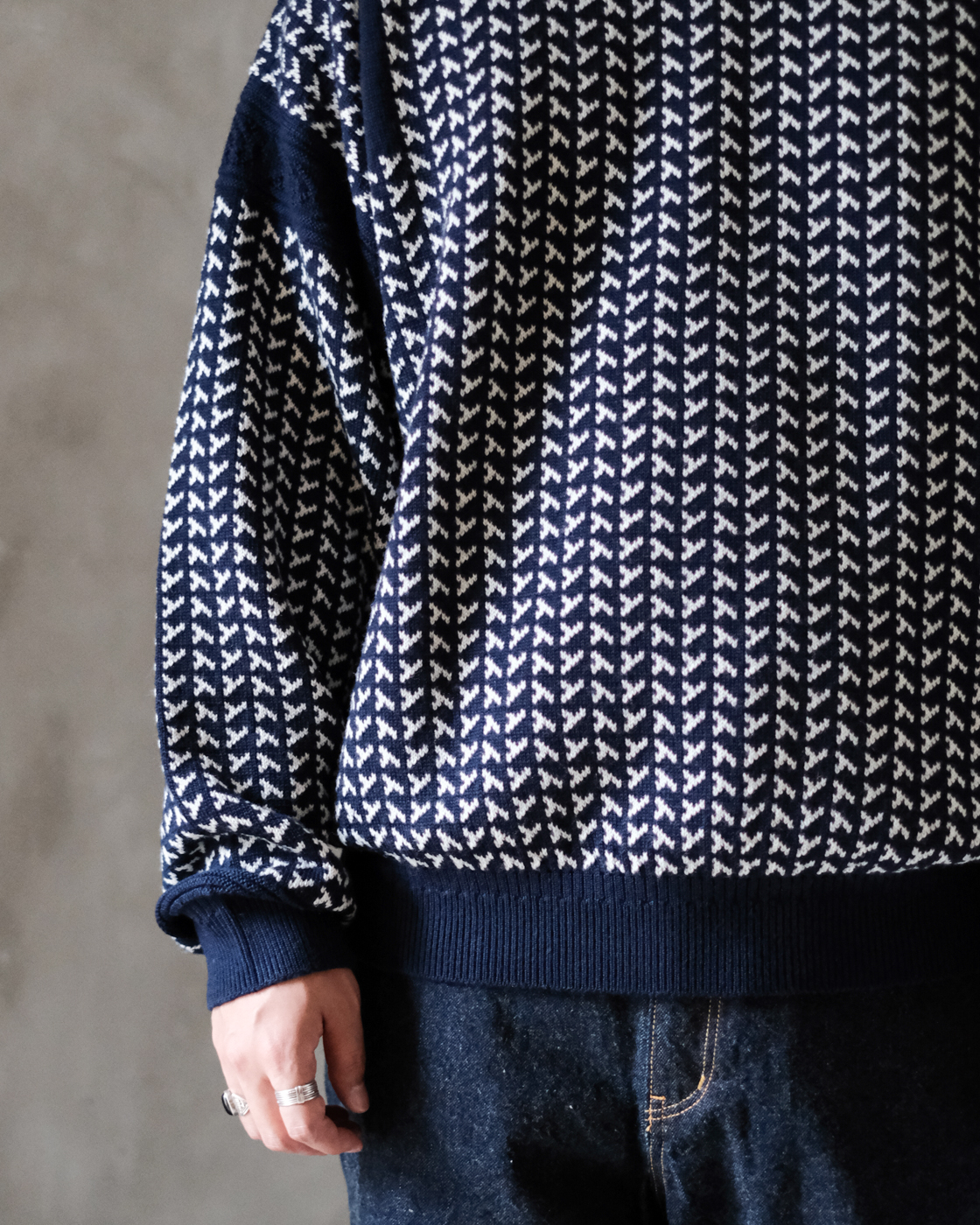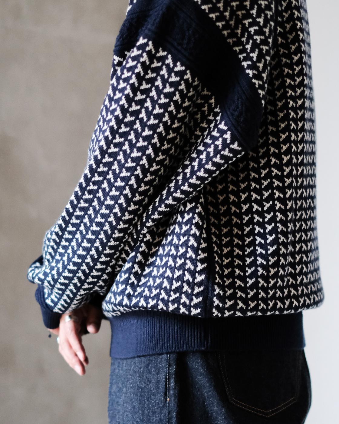 風もない静かな夜、雪がしんしんと降り積もる様子をイメージして編まれたシングルジャカードニットです。