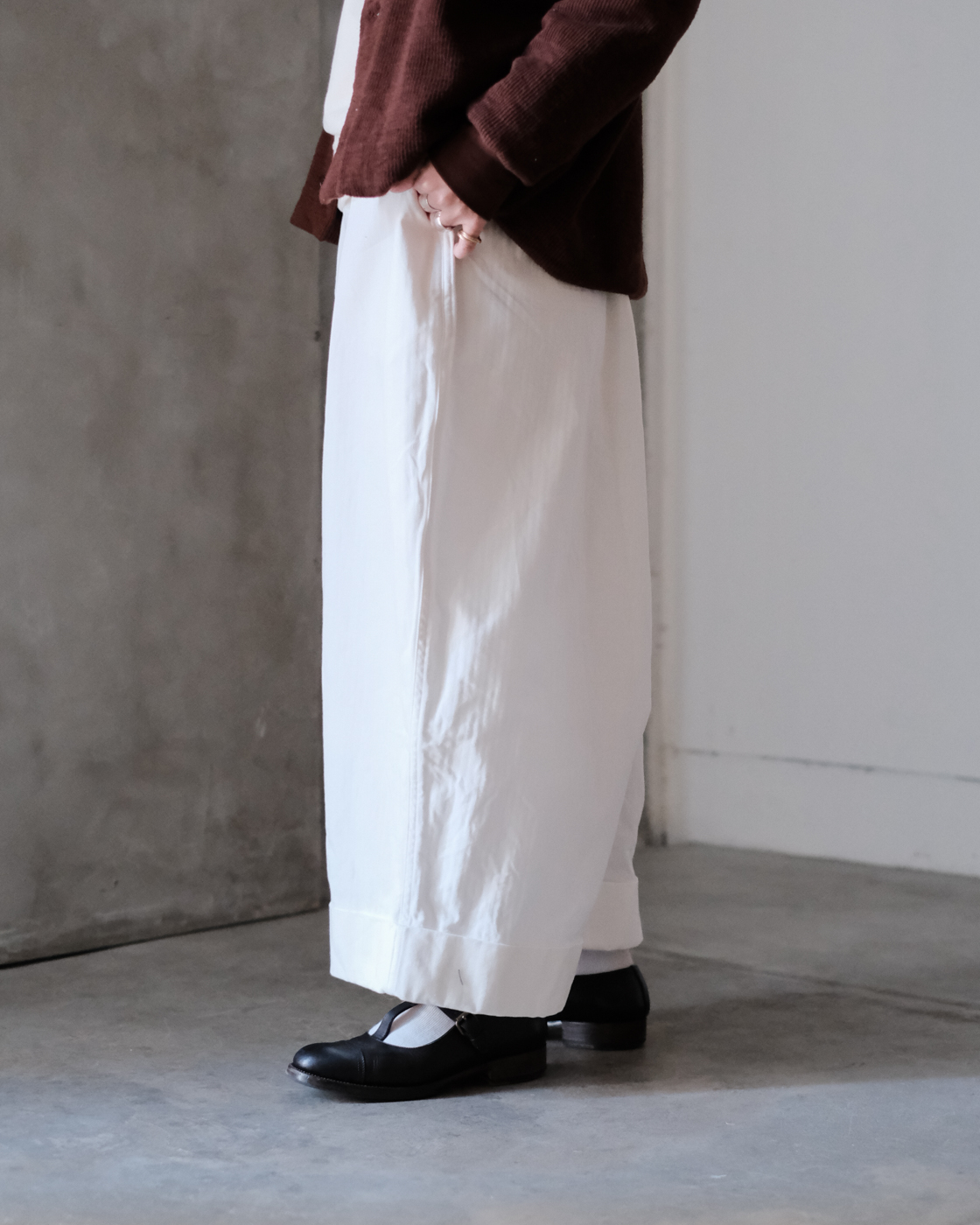 裾がダブルになっている為、シルエットにより立体感が強調され印象的なパンツに。