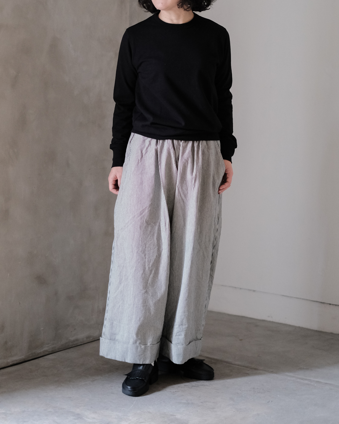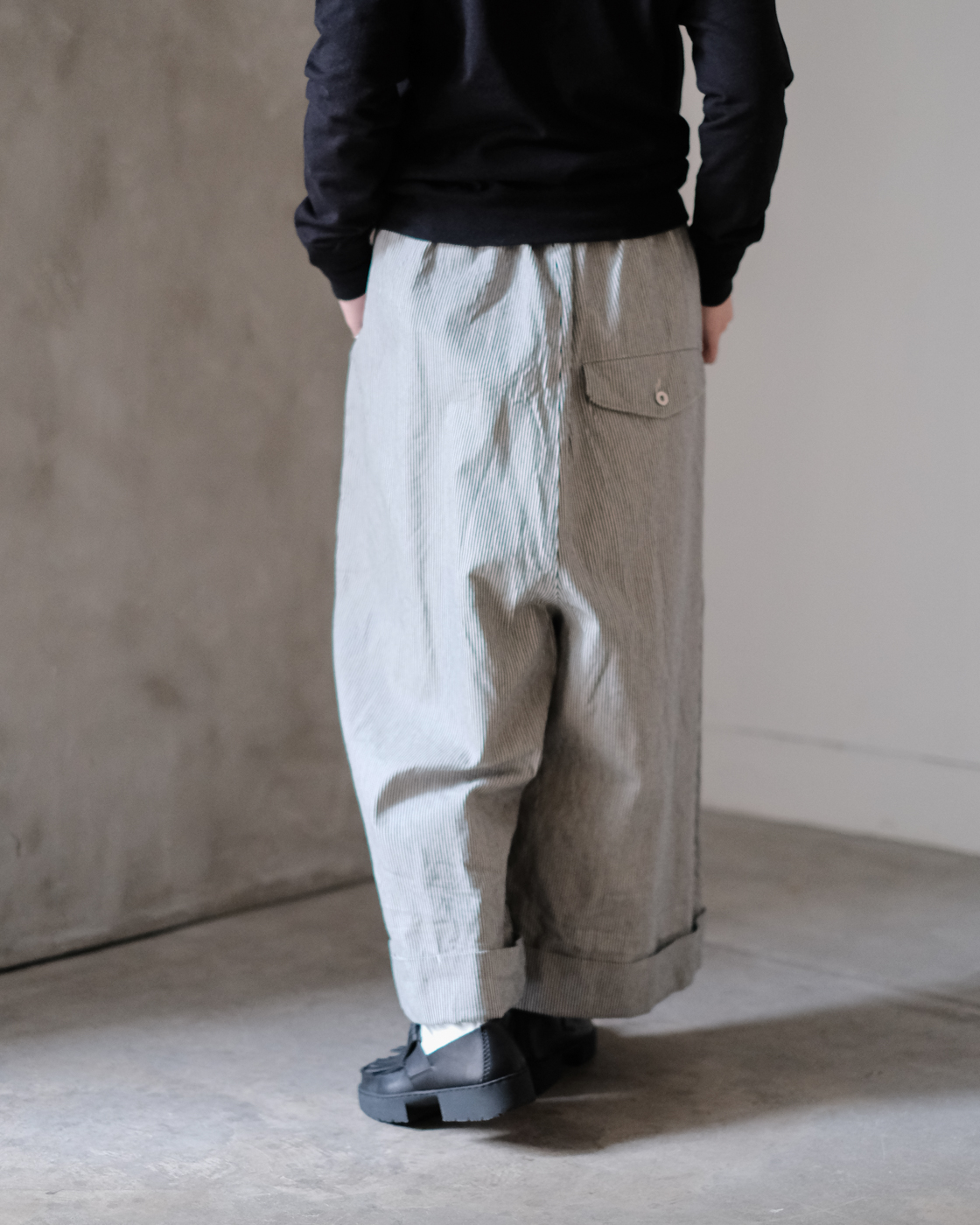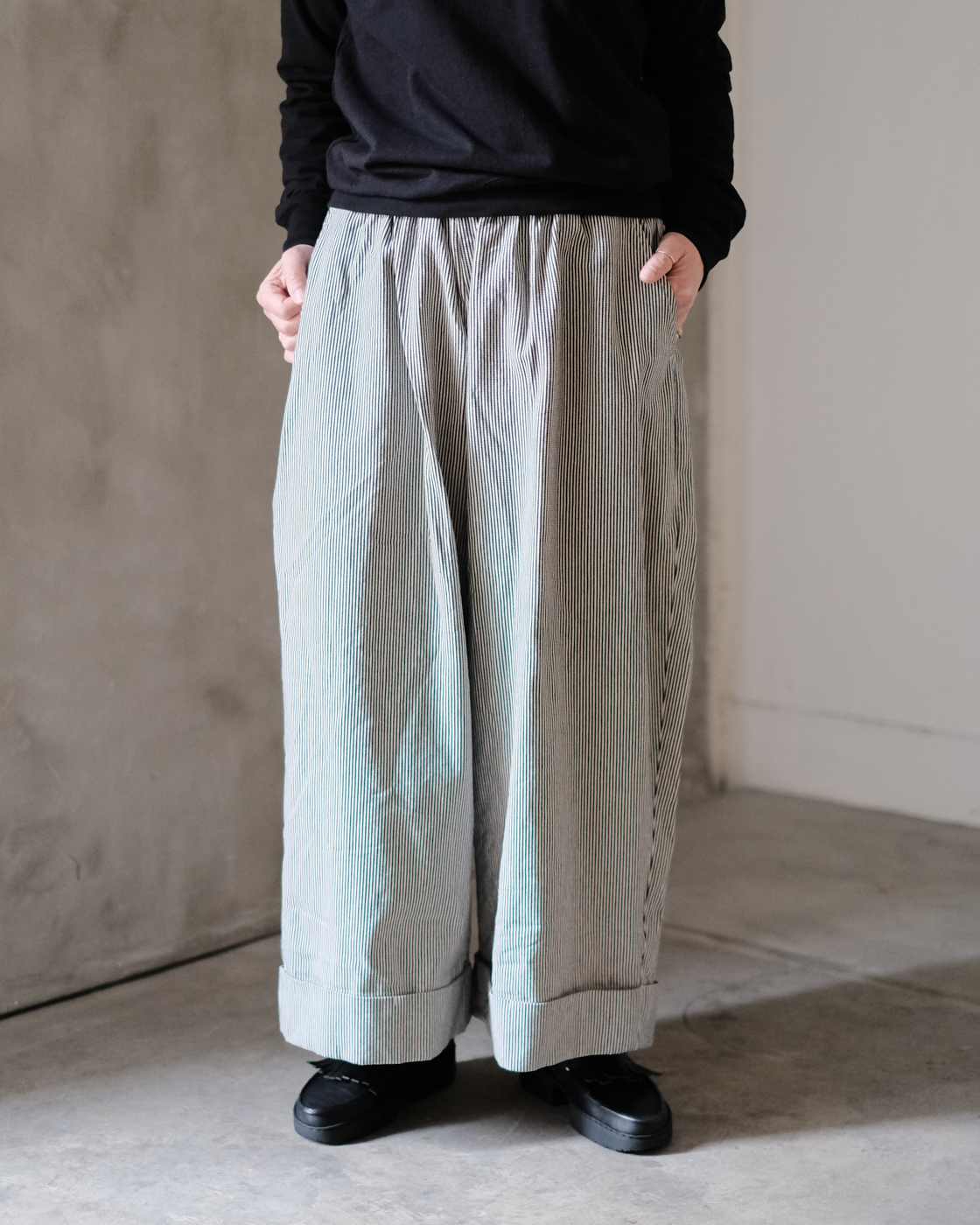 ワークな空気を洗練させて日常に寄り添ってくれる[コットンヒッコリー ワイドパンツ]がゴーシュより届きました。