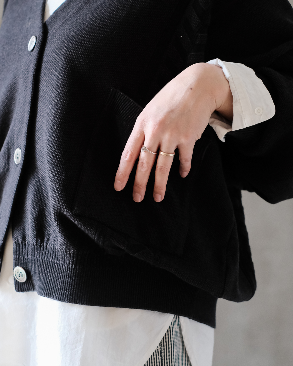 昨年のVネックのカーディガンと比較すると、ボタンが一つなくなり首元の開きが広くなっています。