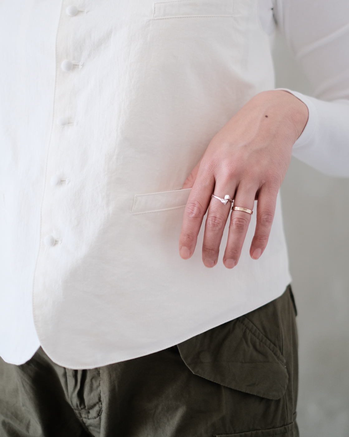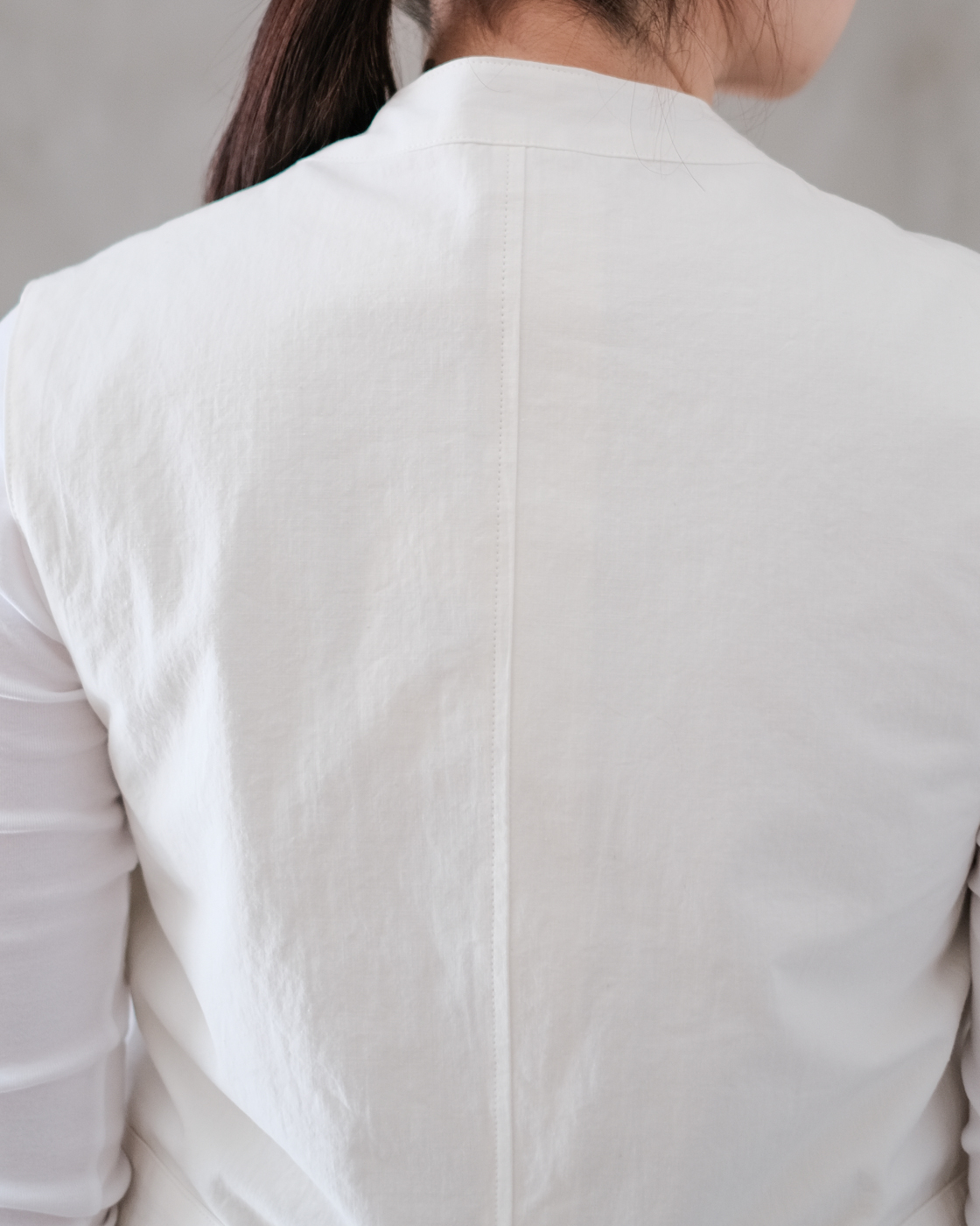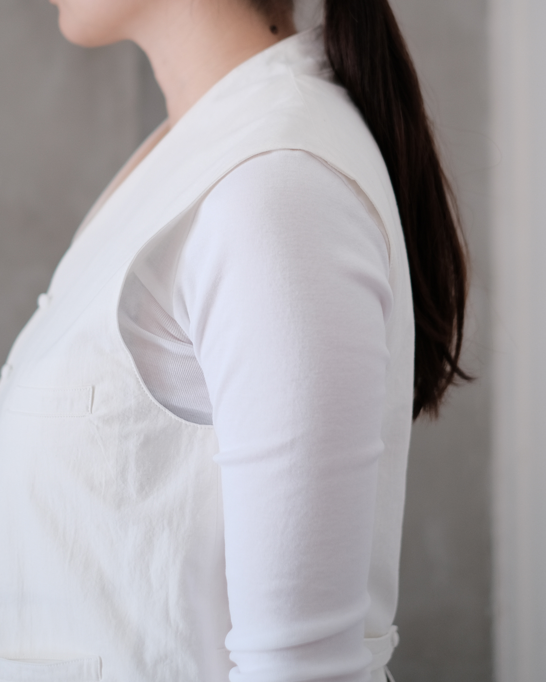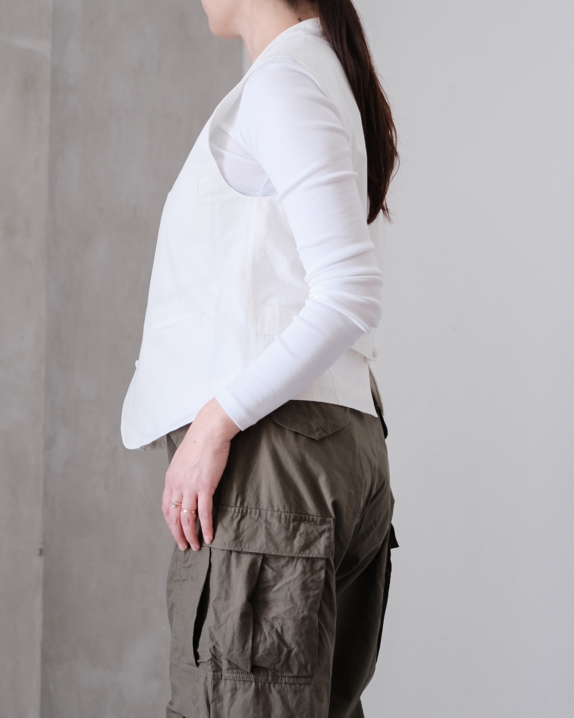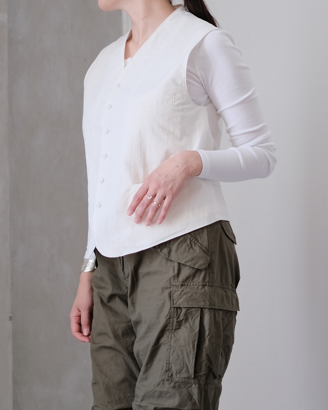 落ち着いた色合いの展開が多いベストの中でも珍しい明るい色合いのホワイトです。