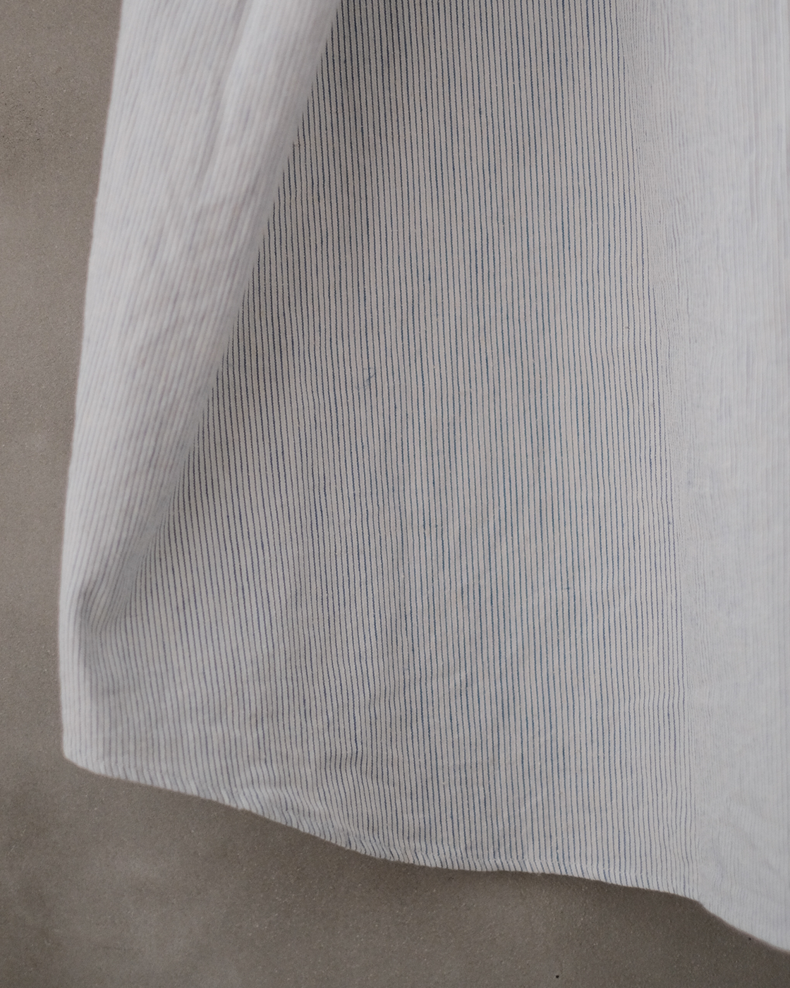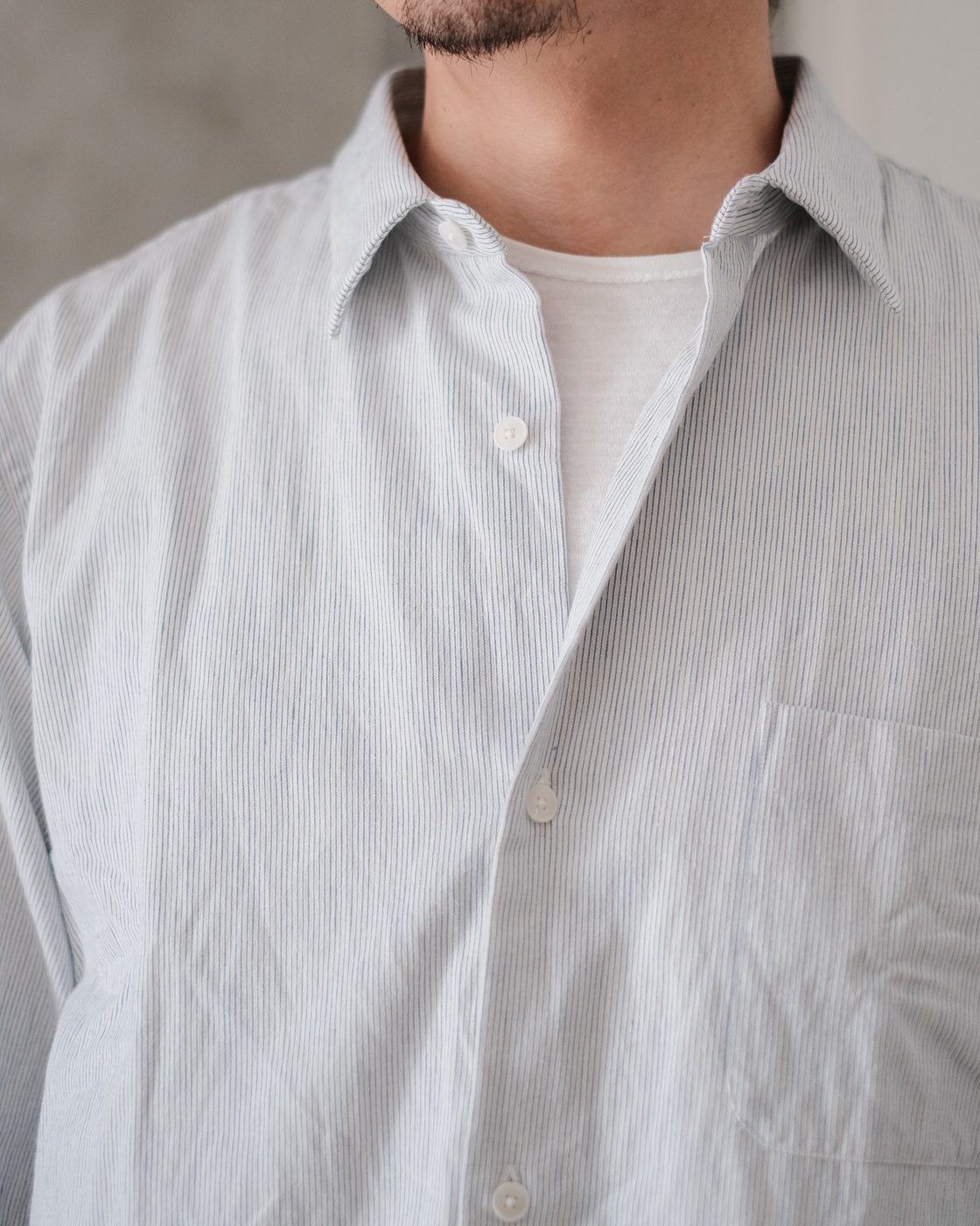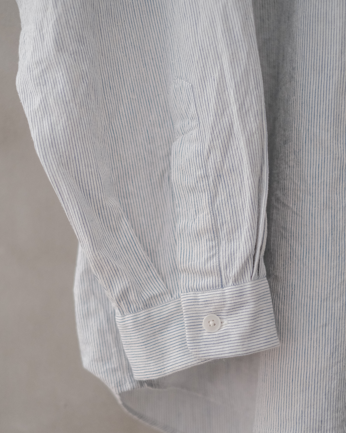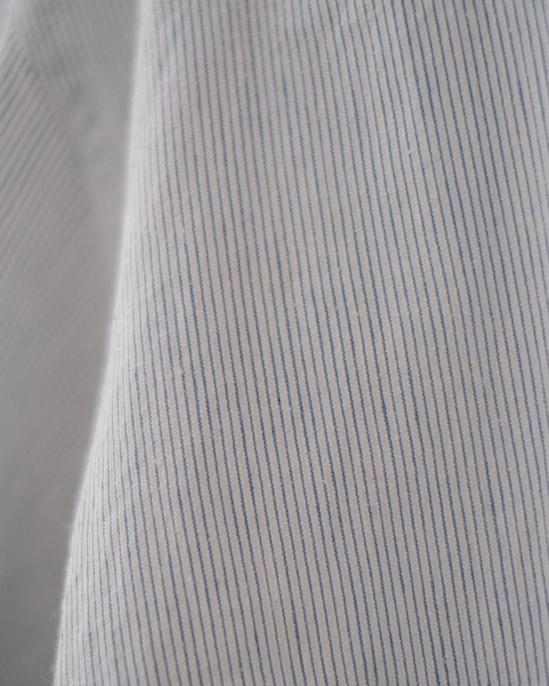 無染色の生成りをベースに線の様に繊細な細さで織られたYAECAオリジナルファブリックのペンシルストライプ。