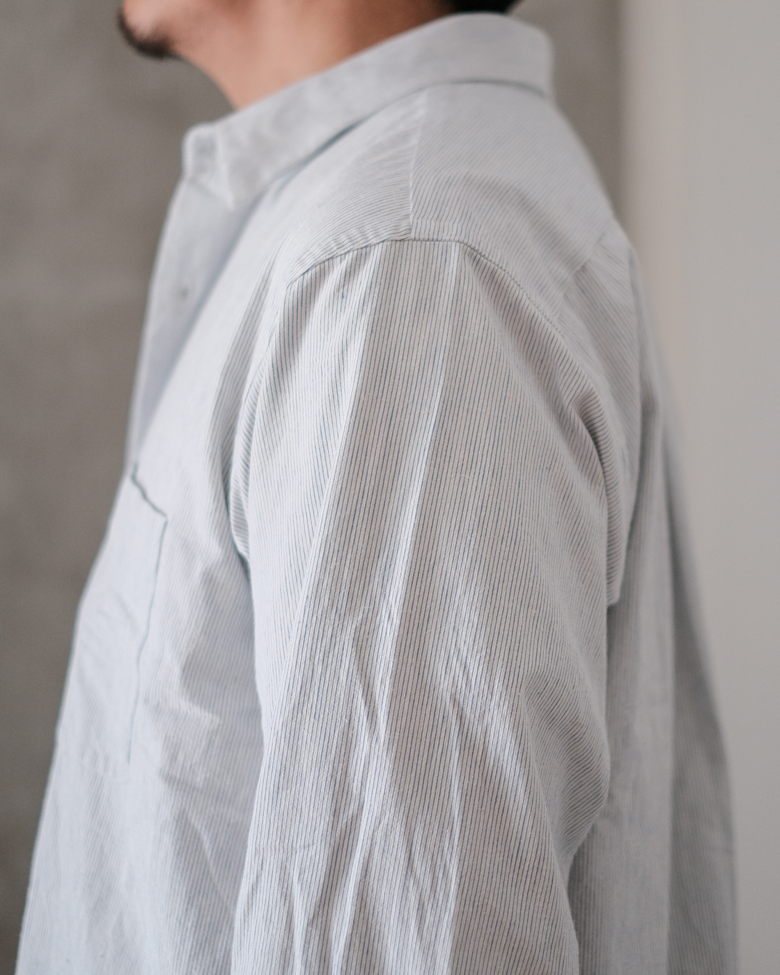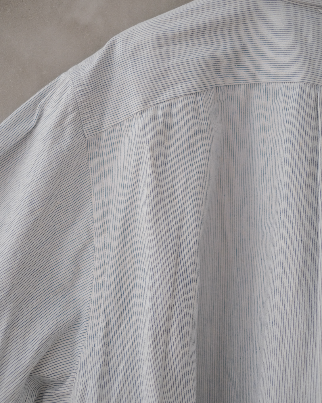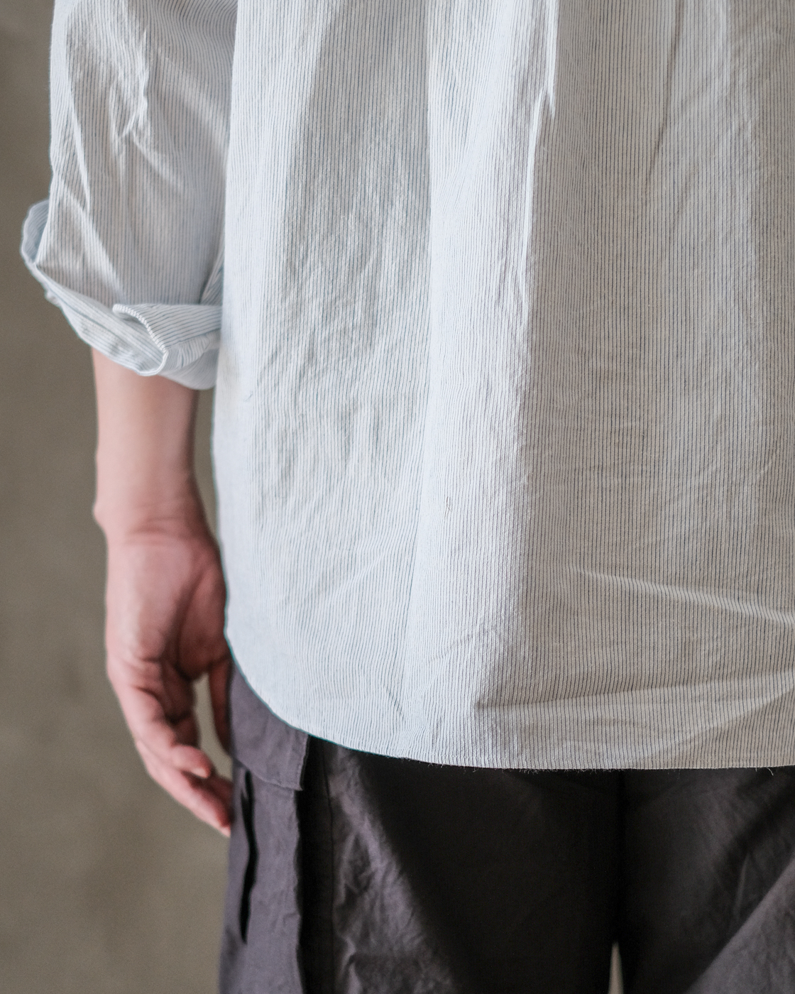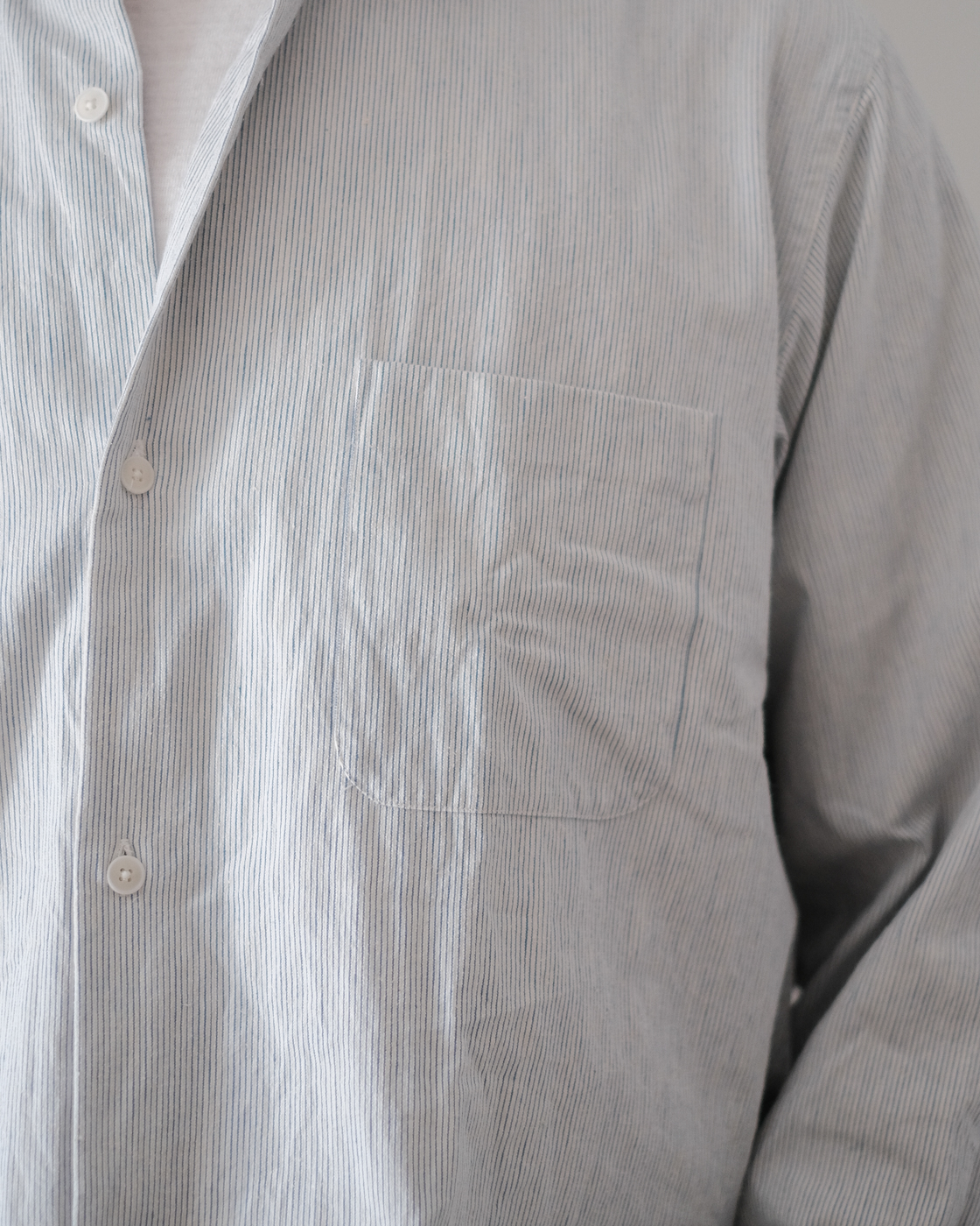 無染色の生成りをベースに線の様に繊細な細さで織られたYAECAオリジナルファブリックのペンシルストライプ。
