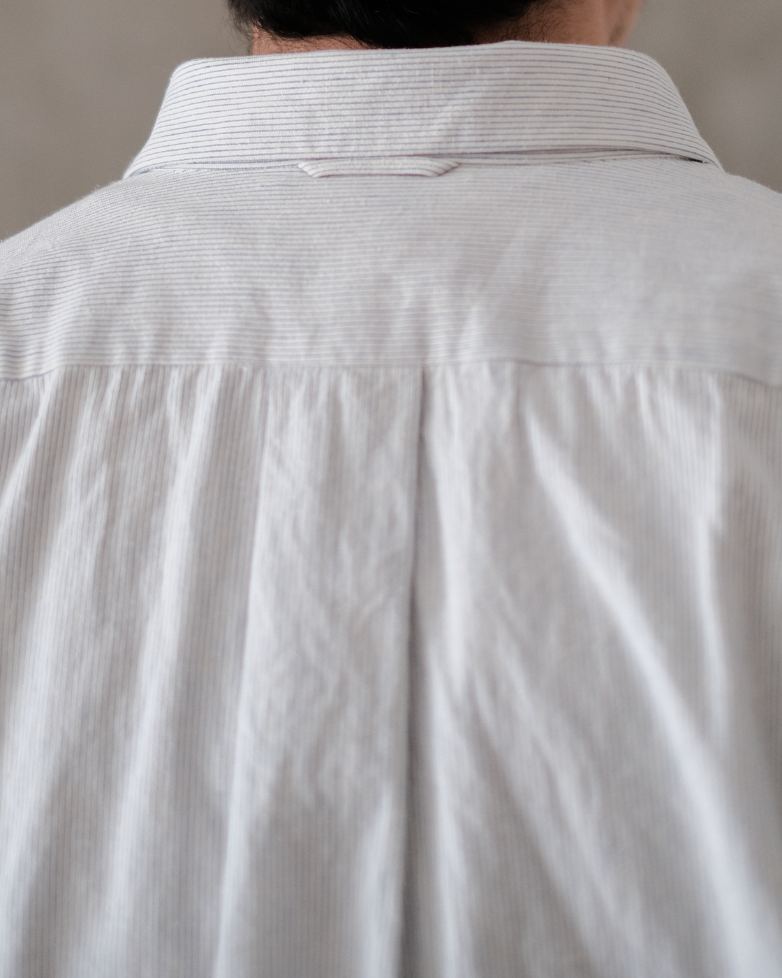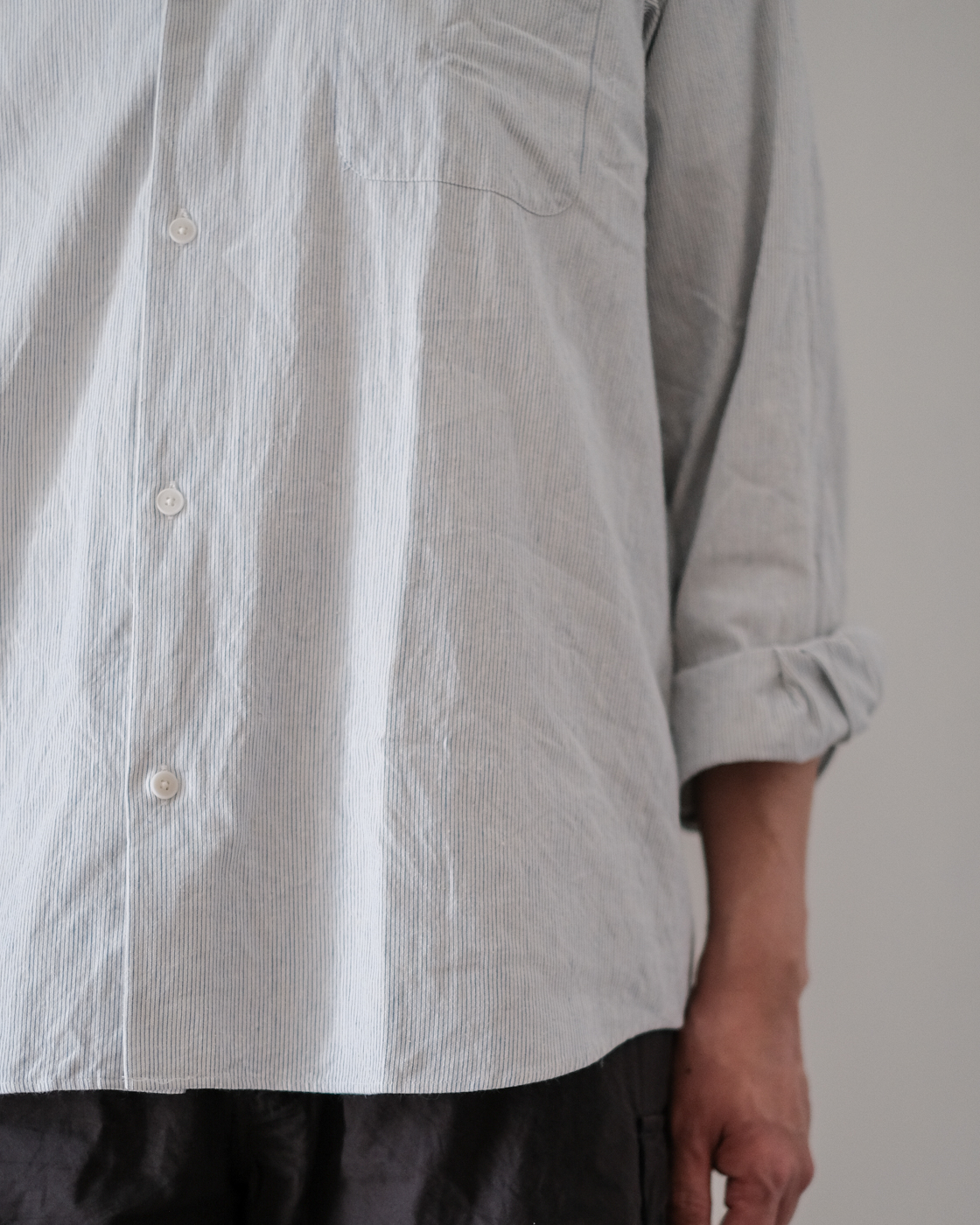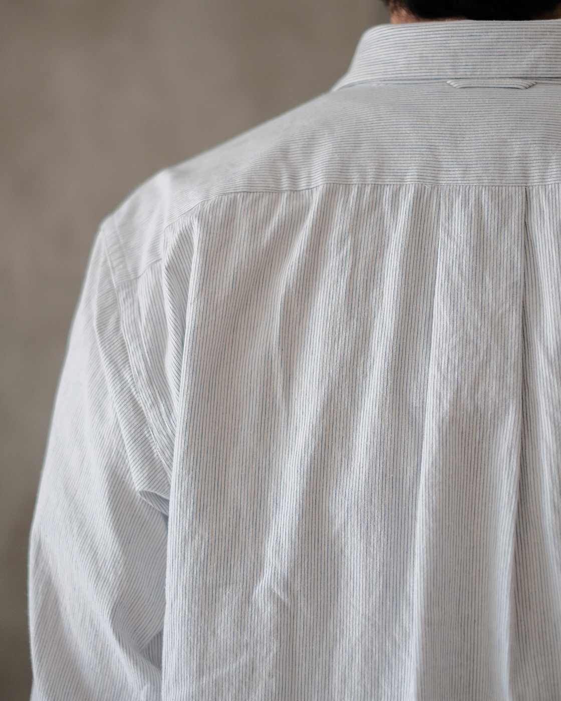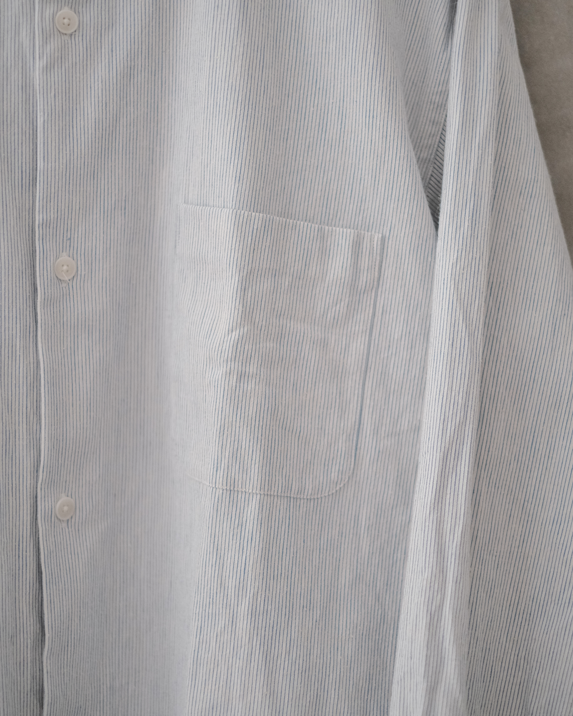無染色の生成りをベースに線の様に繊細な細さで織られたYAECAオリジナルファブリックのペンシルストライプ。