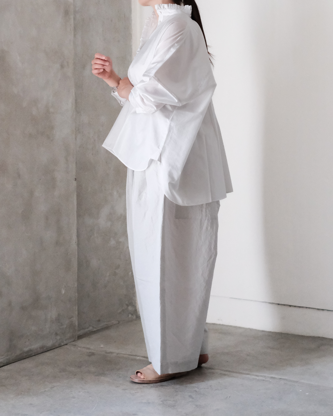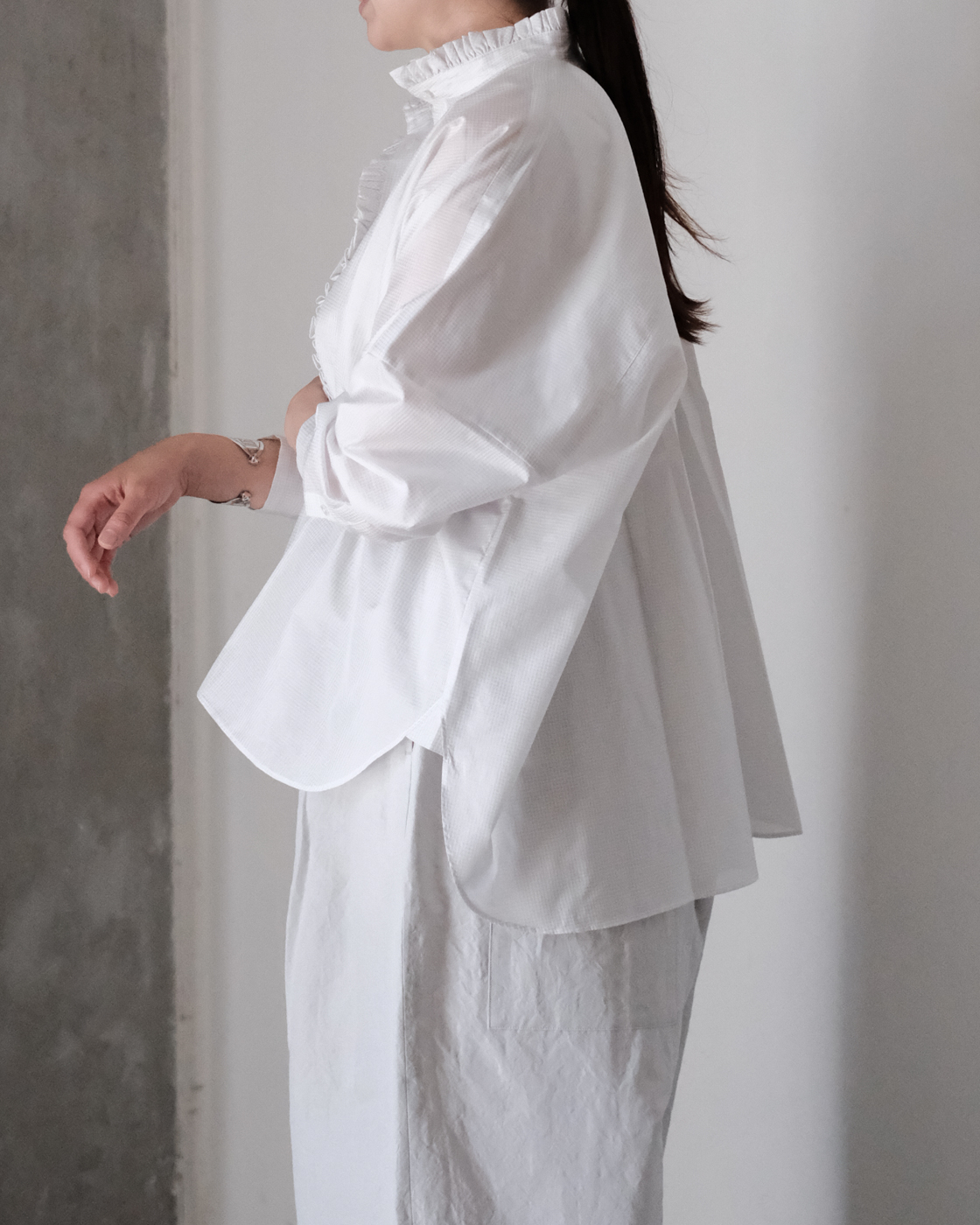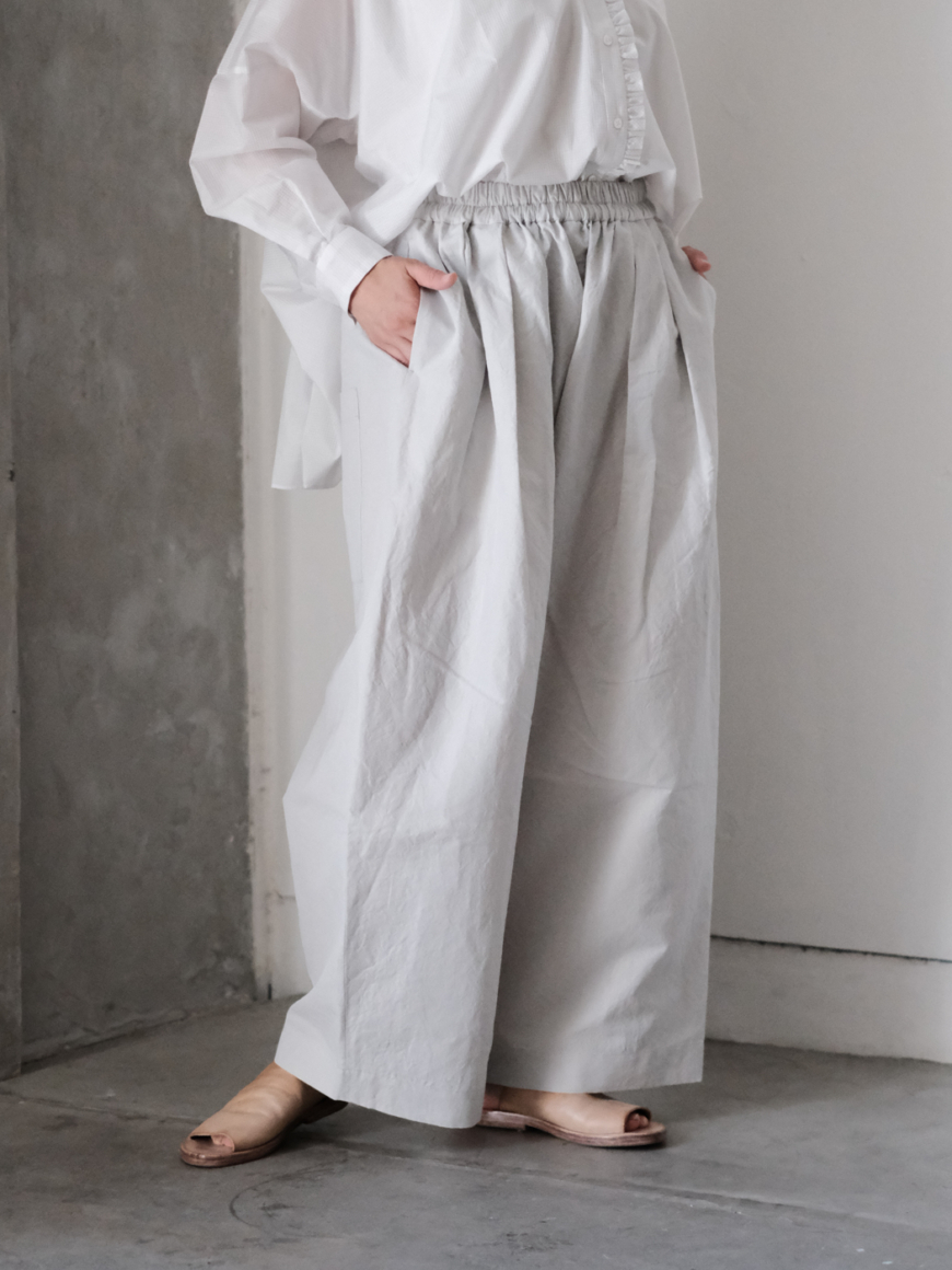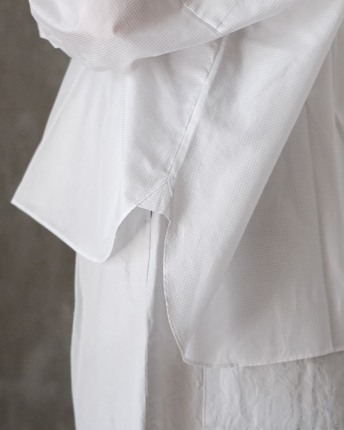 着丈の長さを前後で変えることで、自然と裾に動きが出て軽やかさも加わり、より一層奥行きのある一枚に。