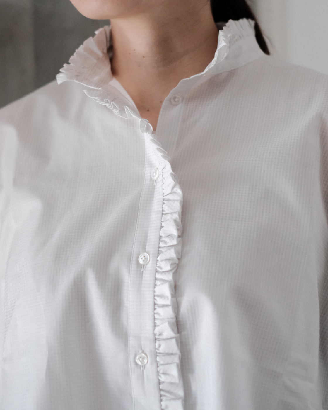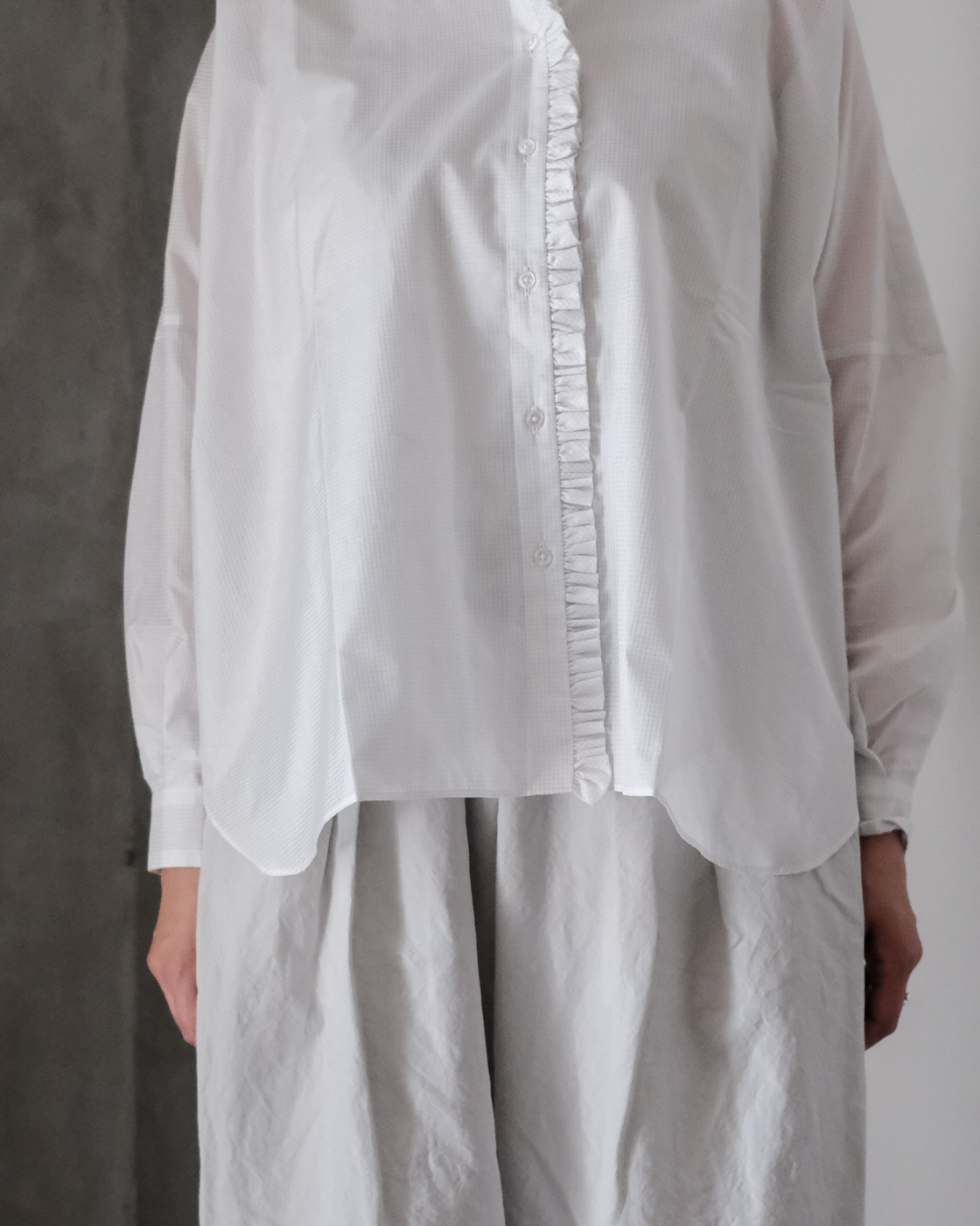 甘さを感じない、襟とフロントを飾る細やかなフリルが魅力のブラウスです。