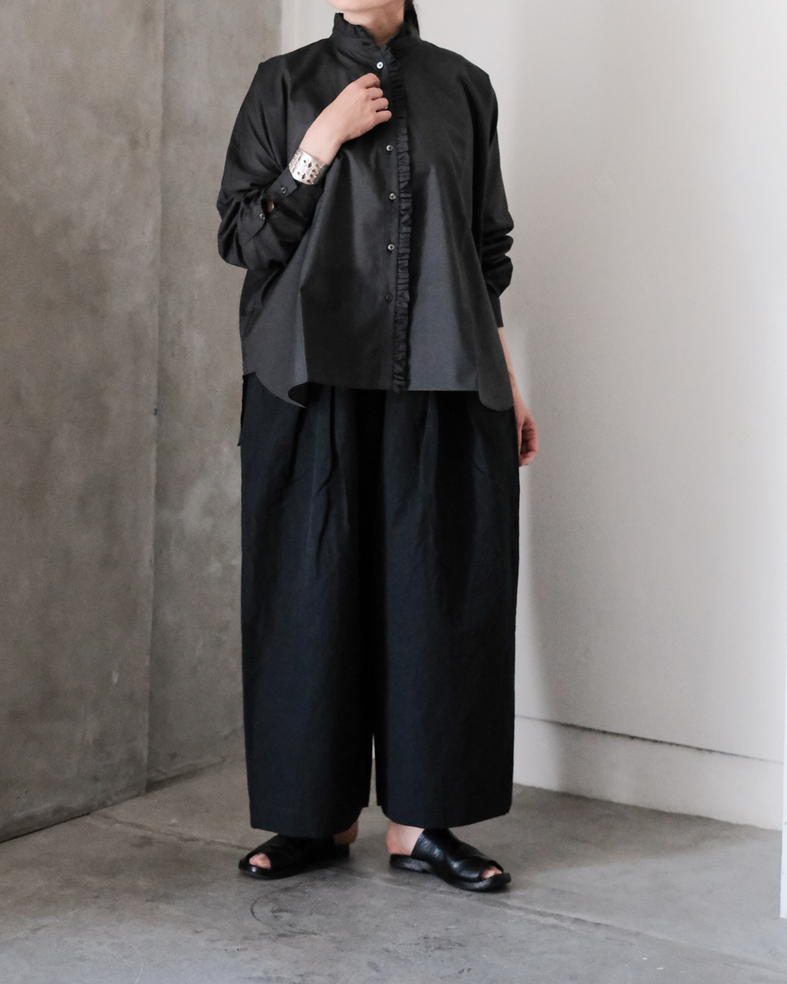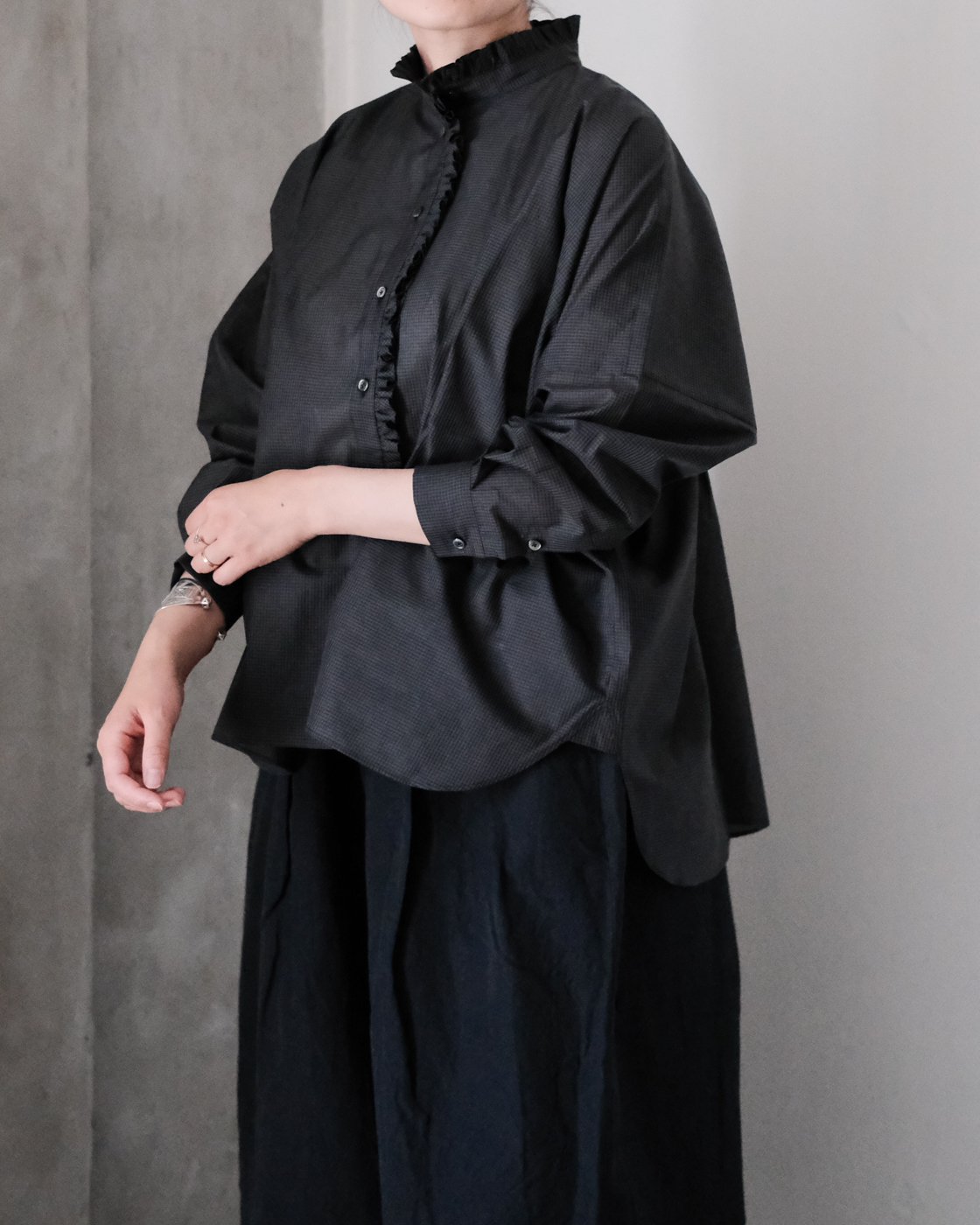 甘さを感じない、襟とフロントを飾る細やかなフリルが魅力のブラウスです。