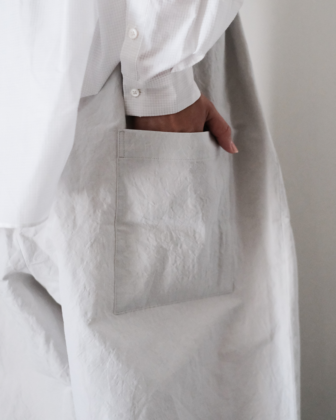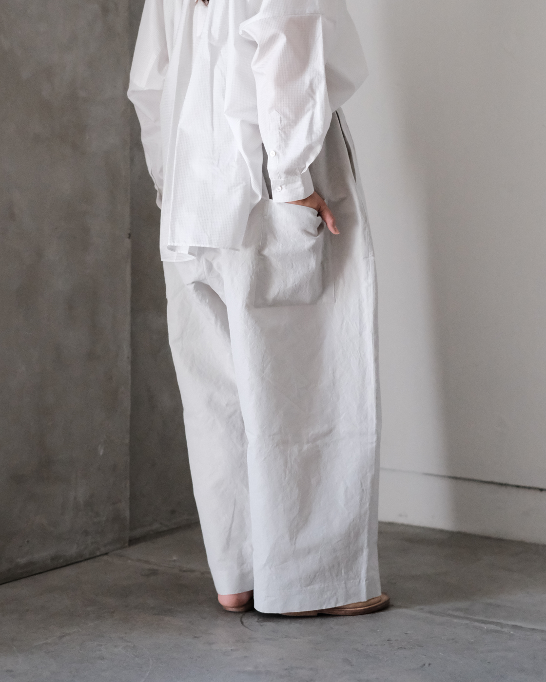 ドライタッチな素材の表情が魅力の生地をたっぷりと使用したワイドシルエットが魅せるSACUCAの[pocket wide pants]が届きました。
