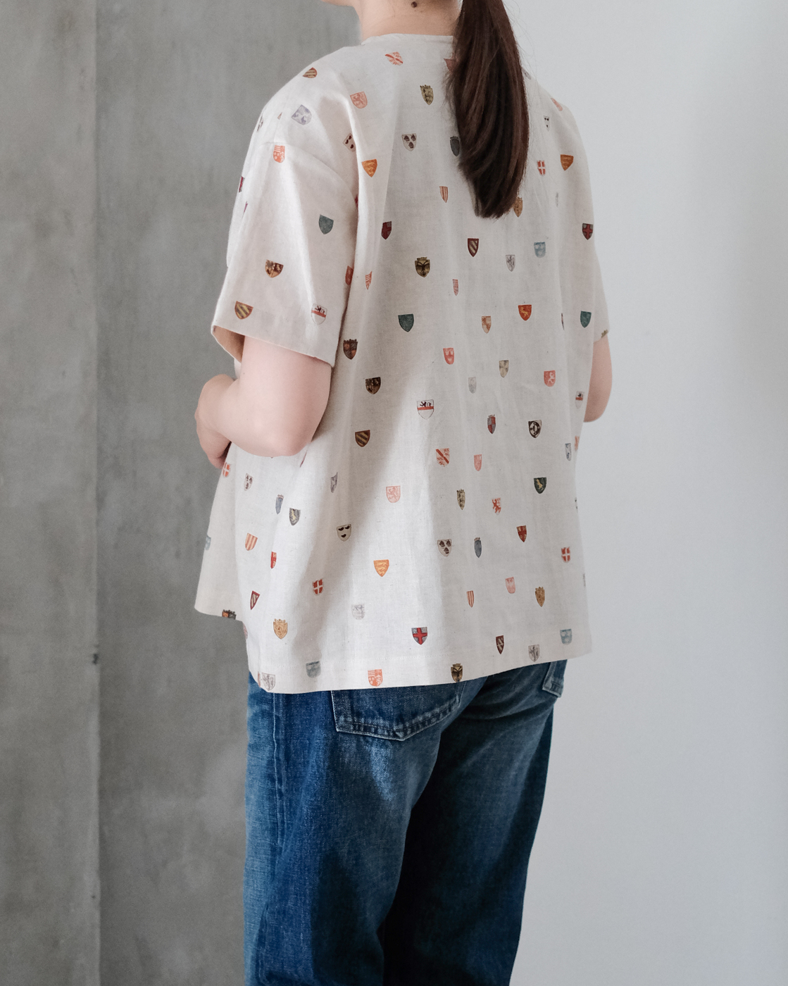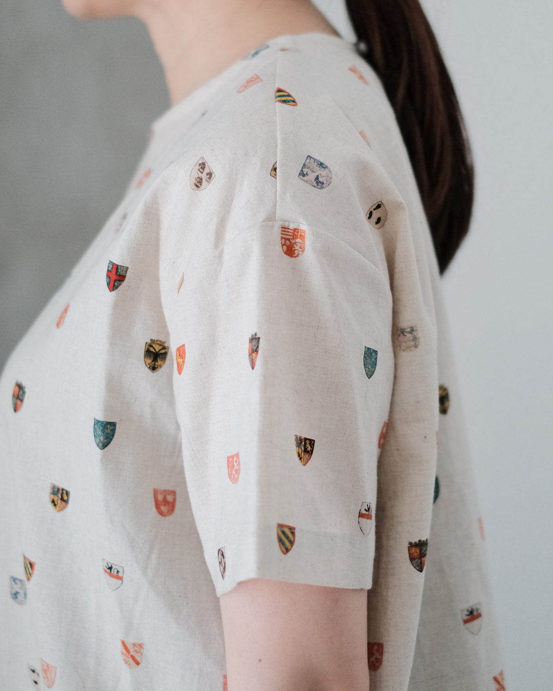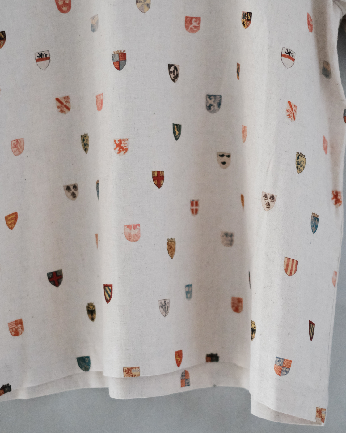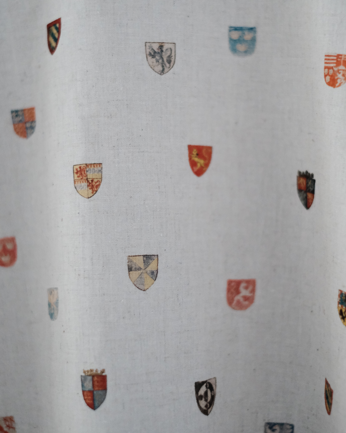 色もデザインも異なる紋章がプリントされており、掠れたような表情が、まさにアンティークの生地を彷彿させる柄。