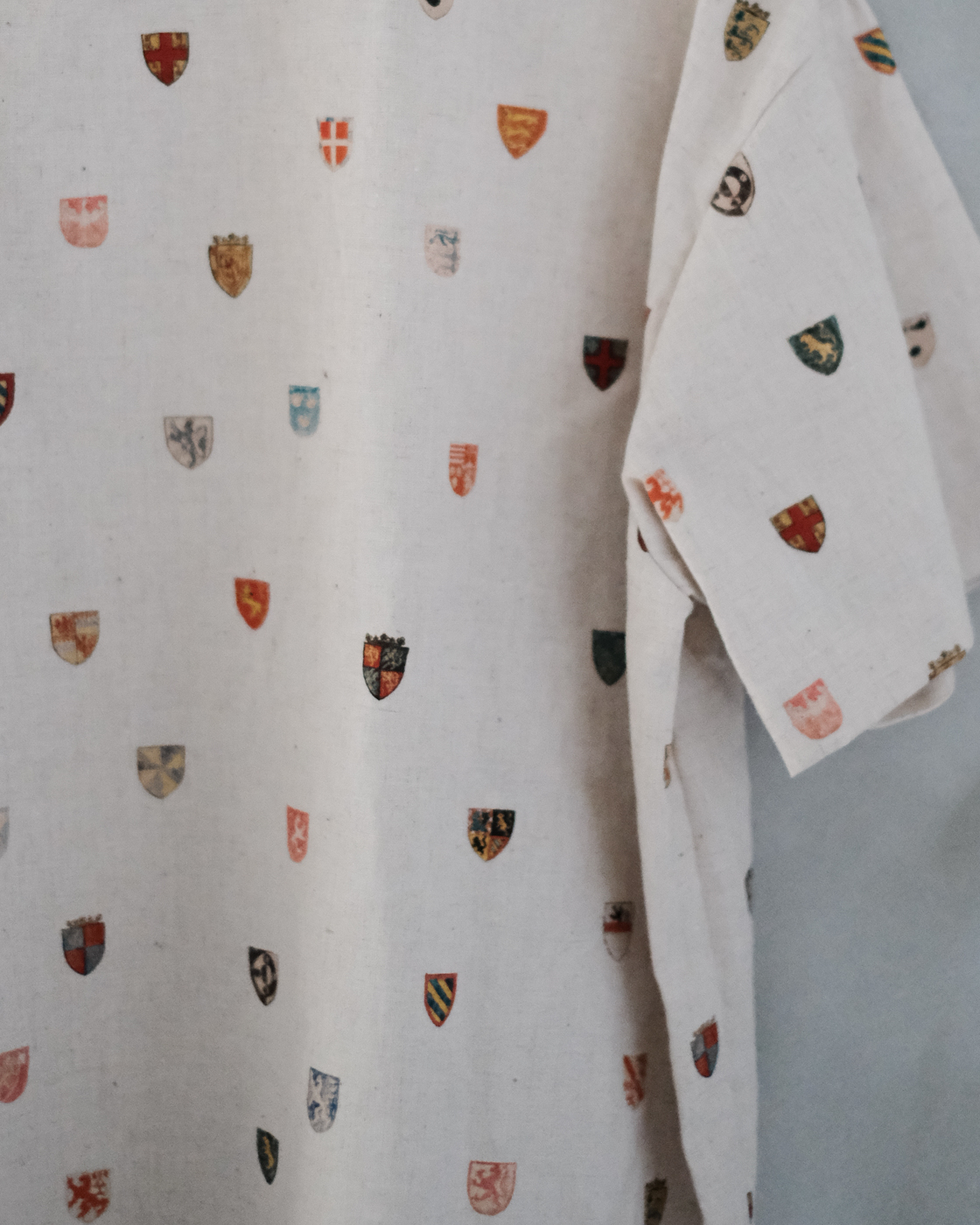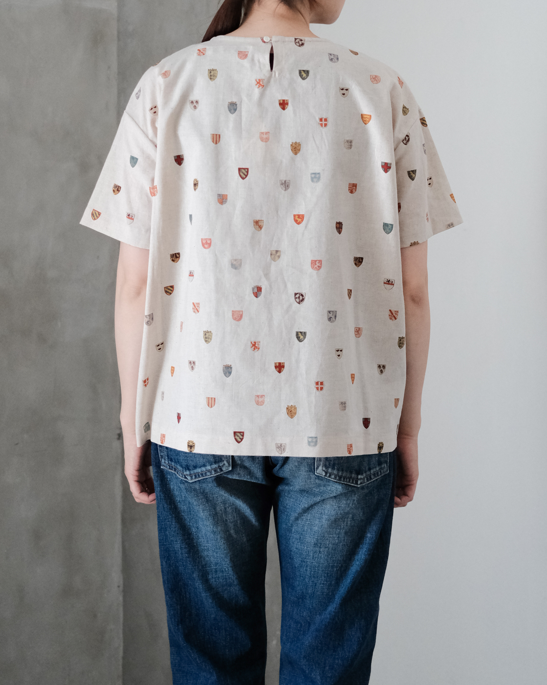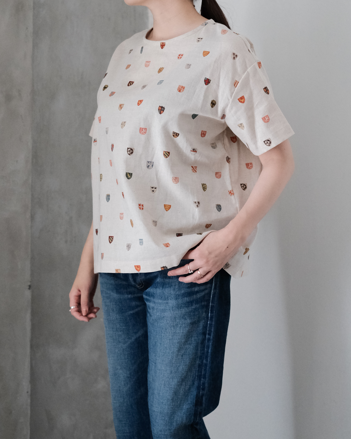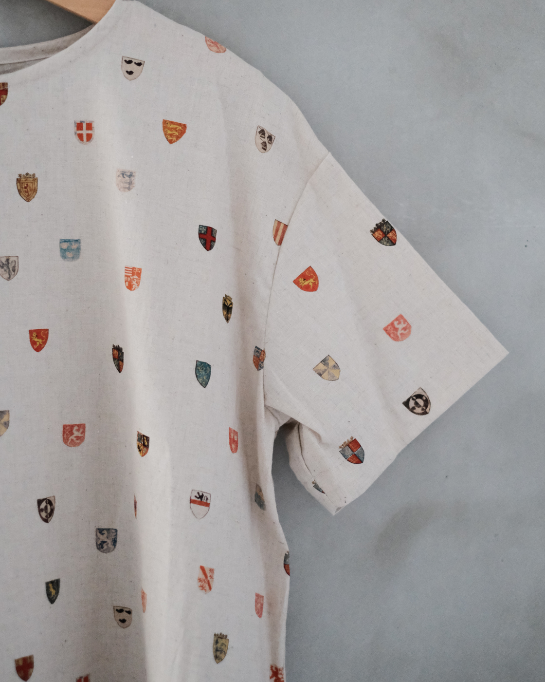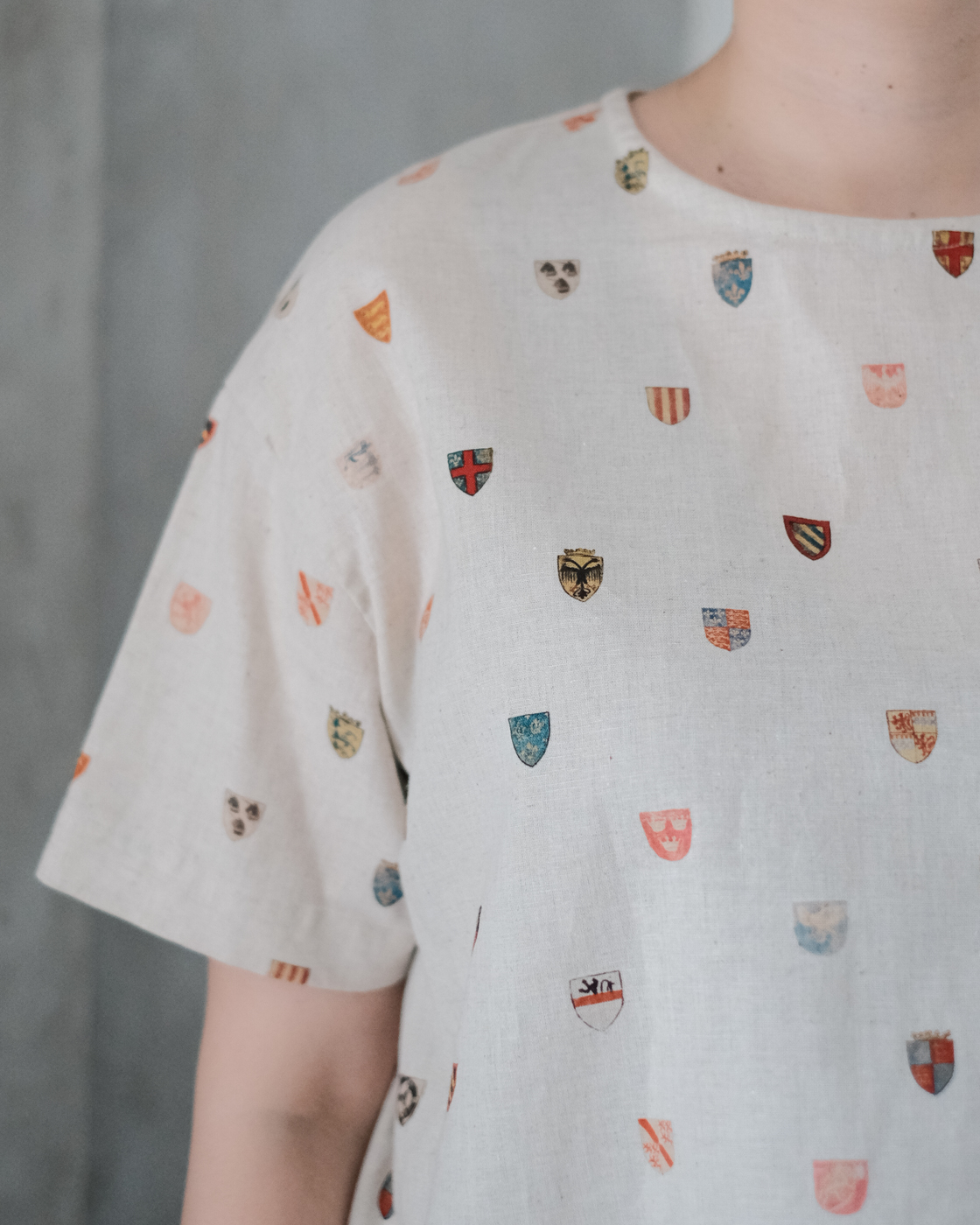 色もデザインも異なる紋章がプリントされており、掠れたような表情が、まさにアンティークの生地を彷彿させる柄。