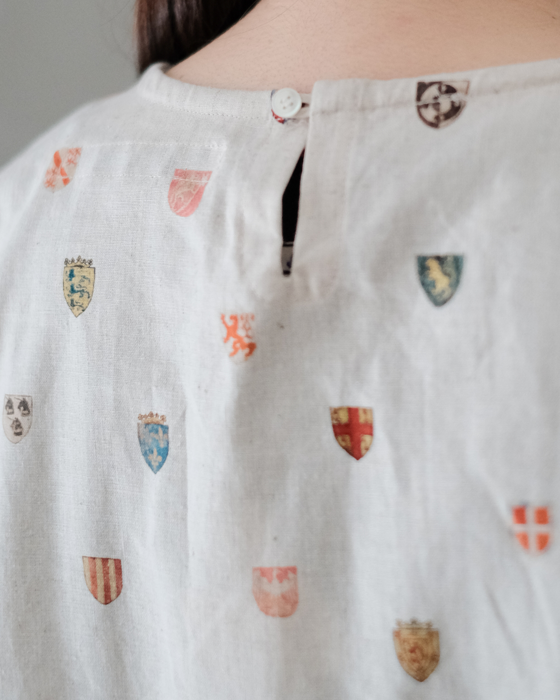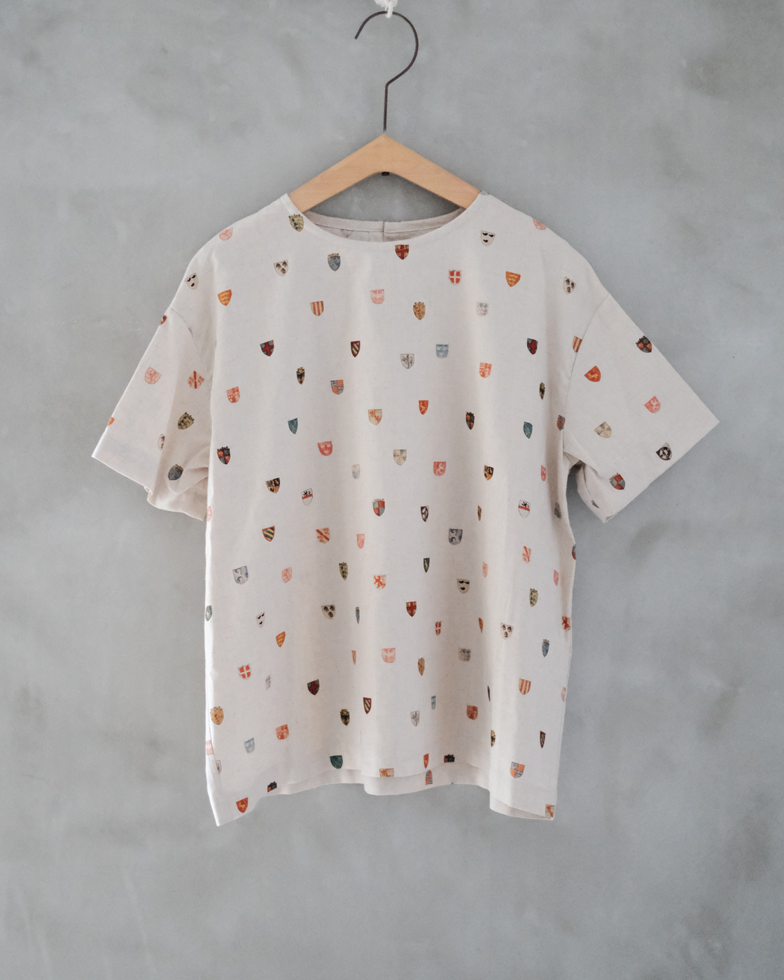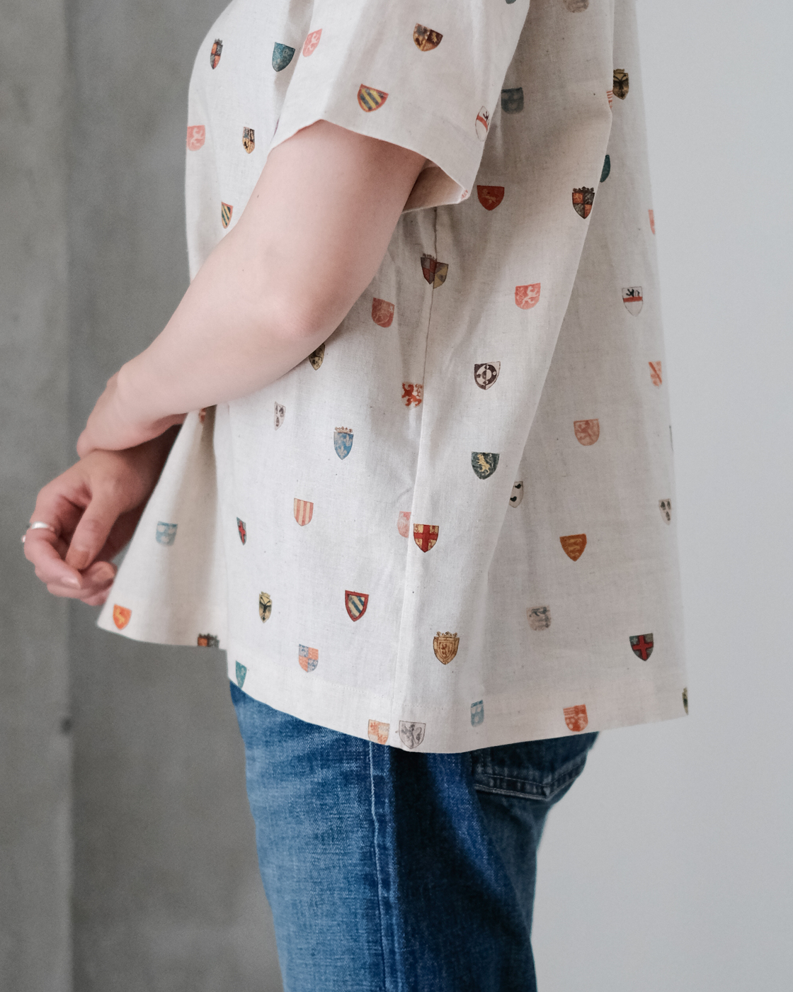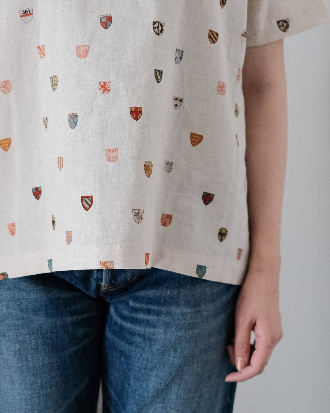 色もデザインも異なる紋章がプリントされており、掠れたような表情が、まさにアンティークの生地を彷彿させる柄。