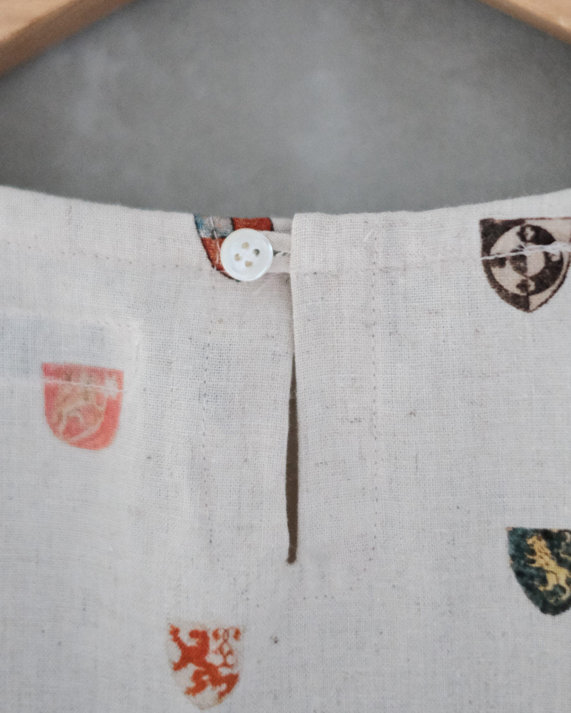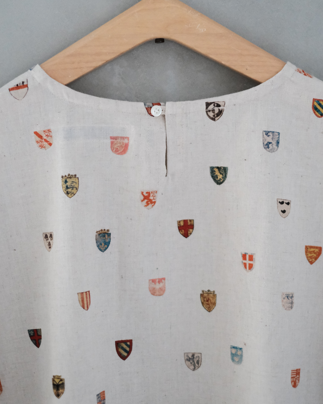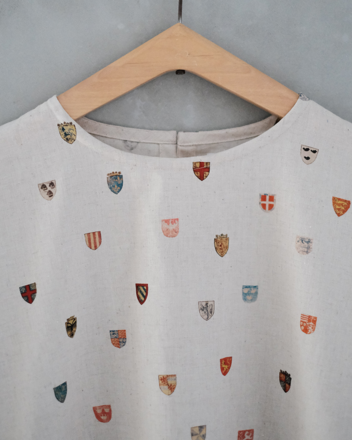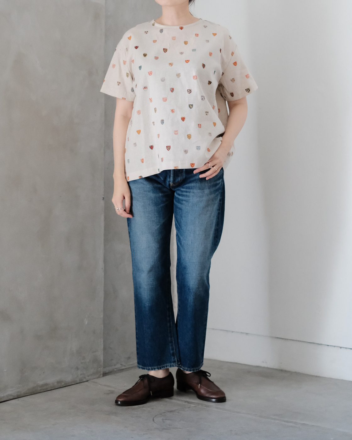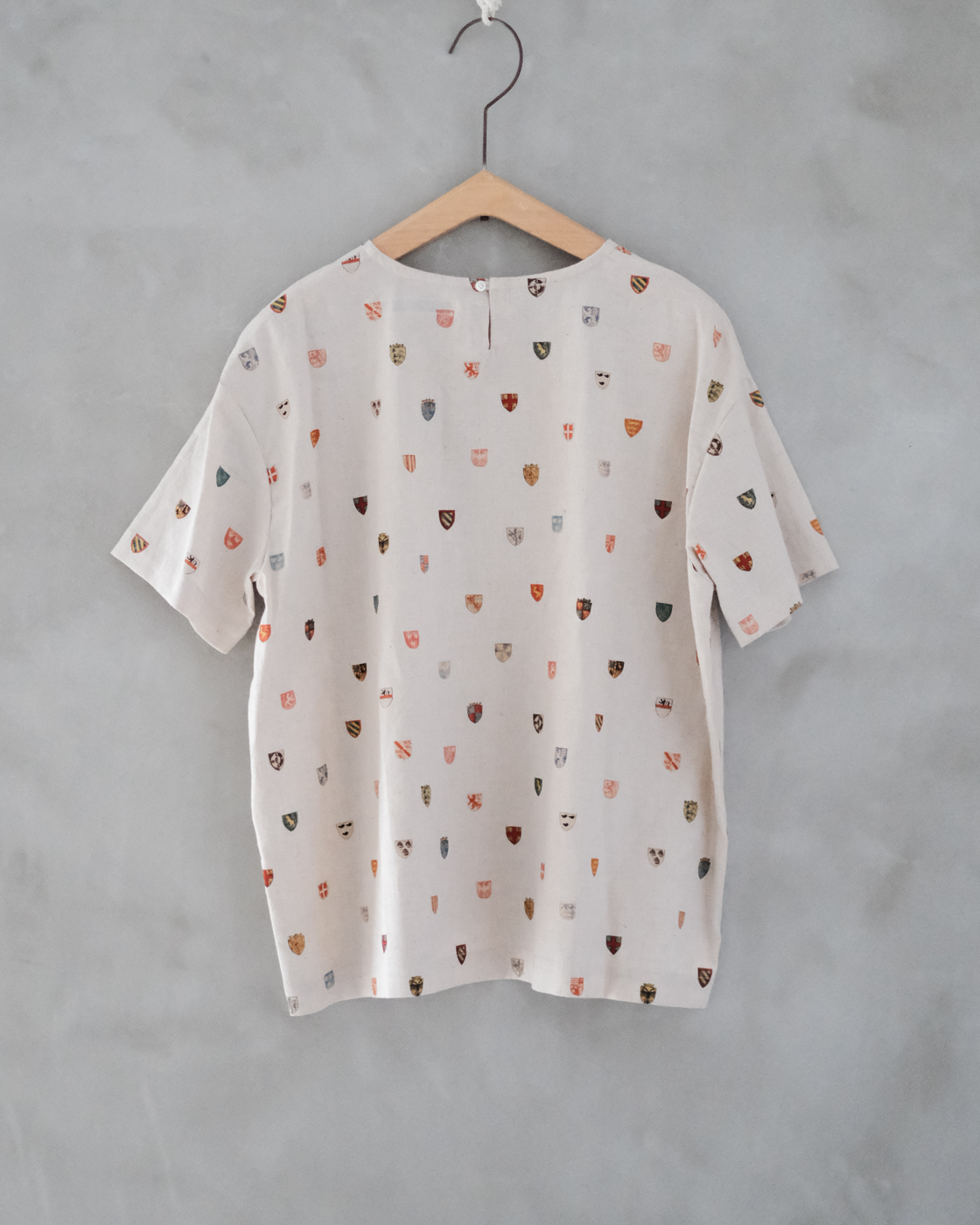 色もデザインも異なる紋章がプリントされており、掠れたような表情が、まさにアンティークの生地を彷彿させる柄。