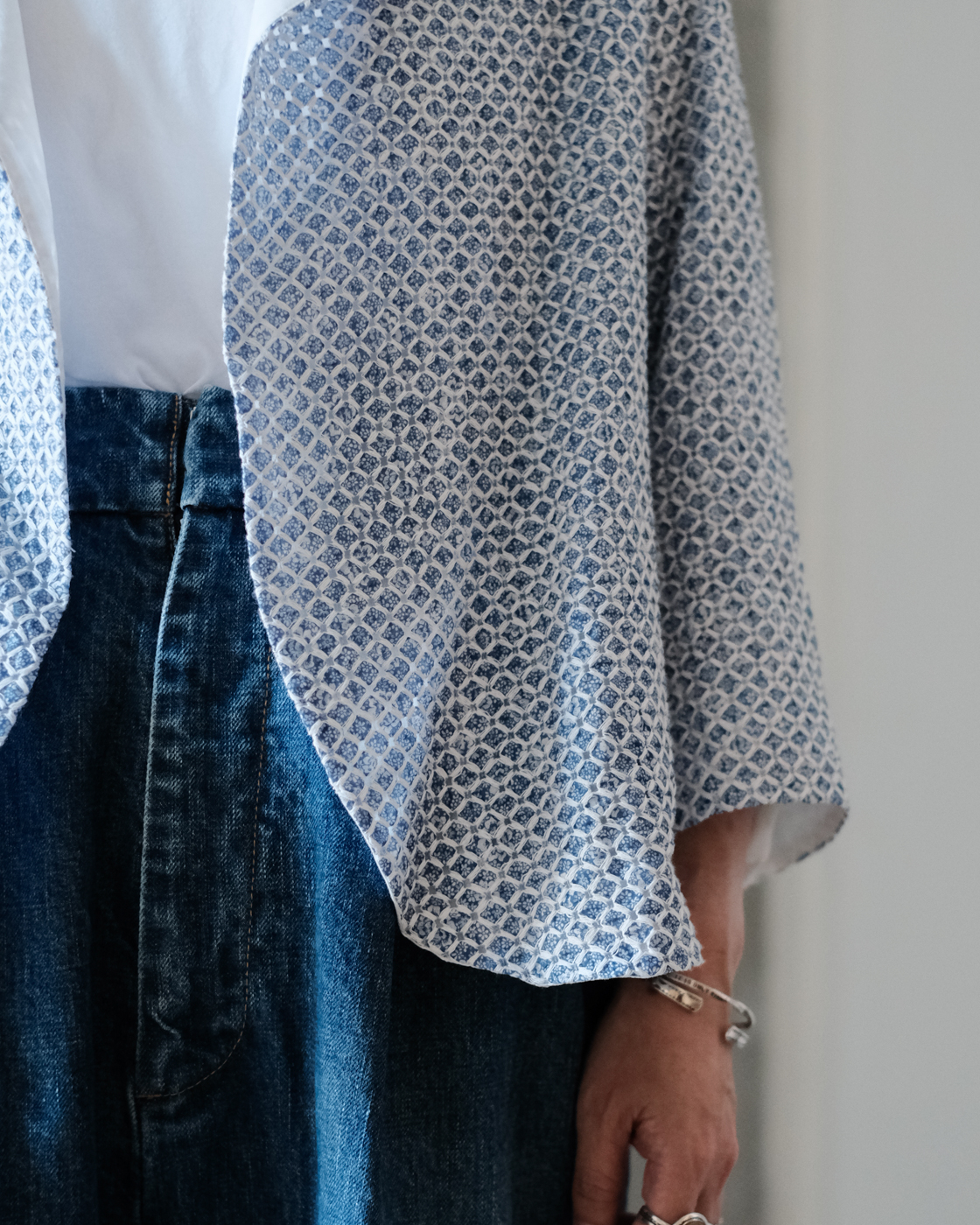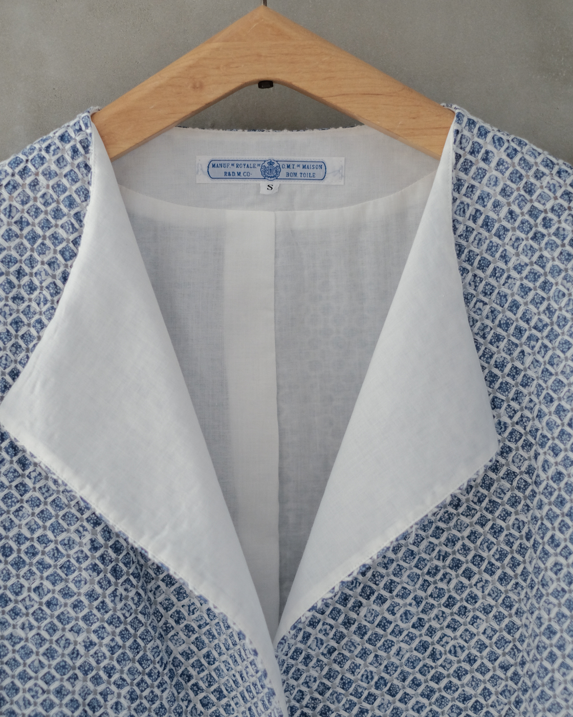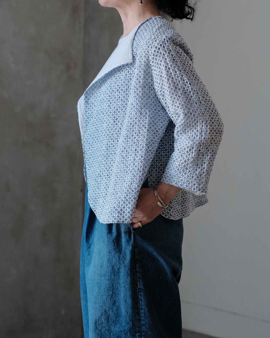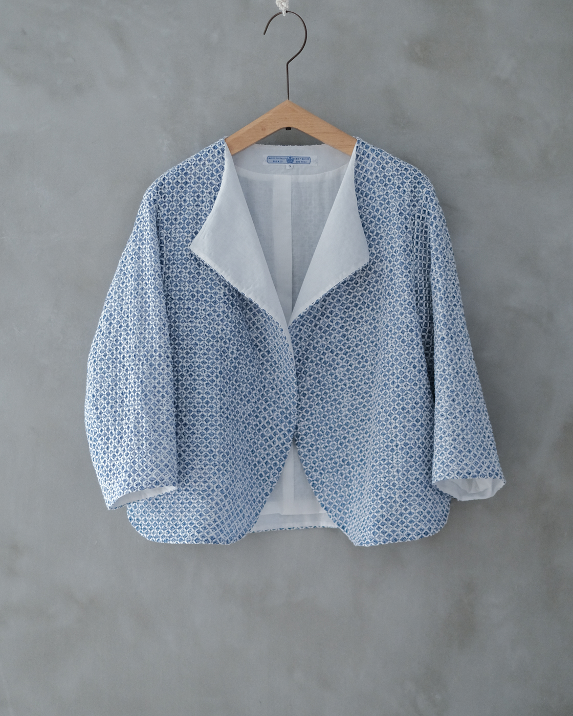 ボレロのように気軽に羽織っていただけるフロントにボタンが施されていないジャケットです。