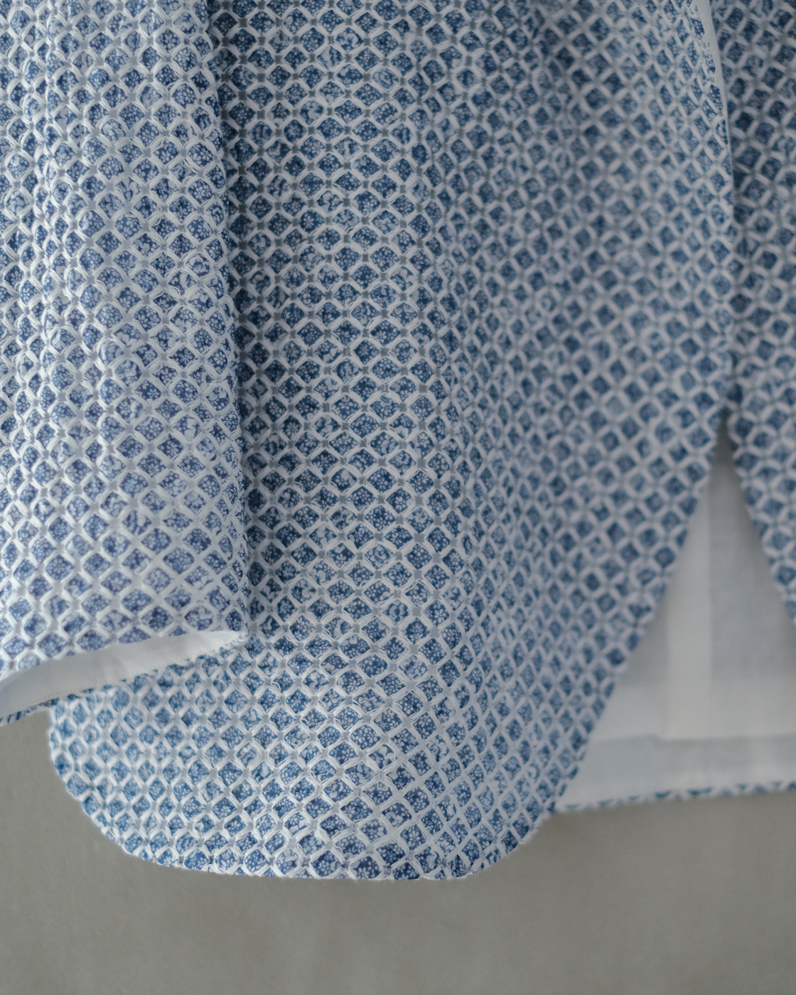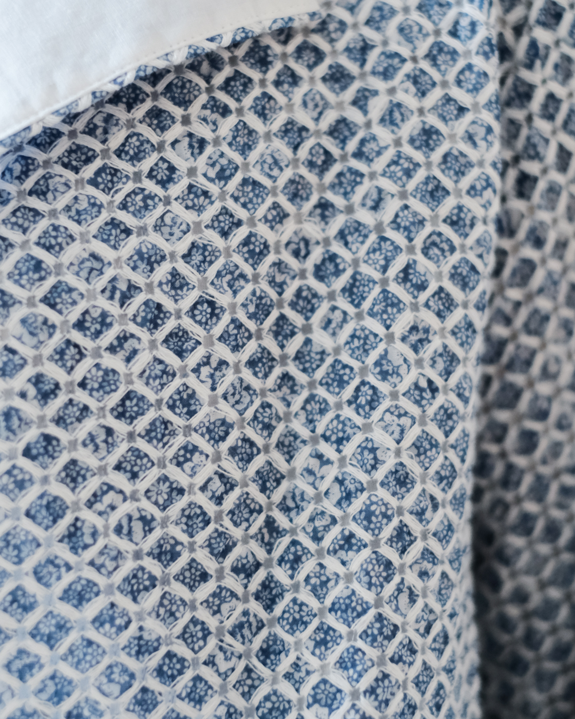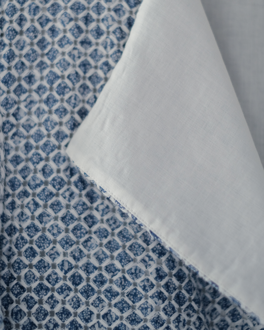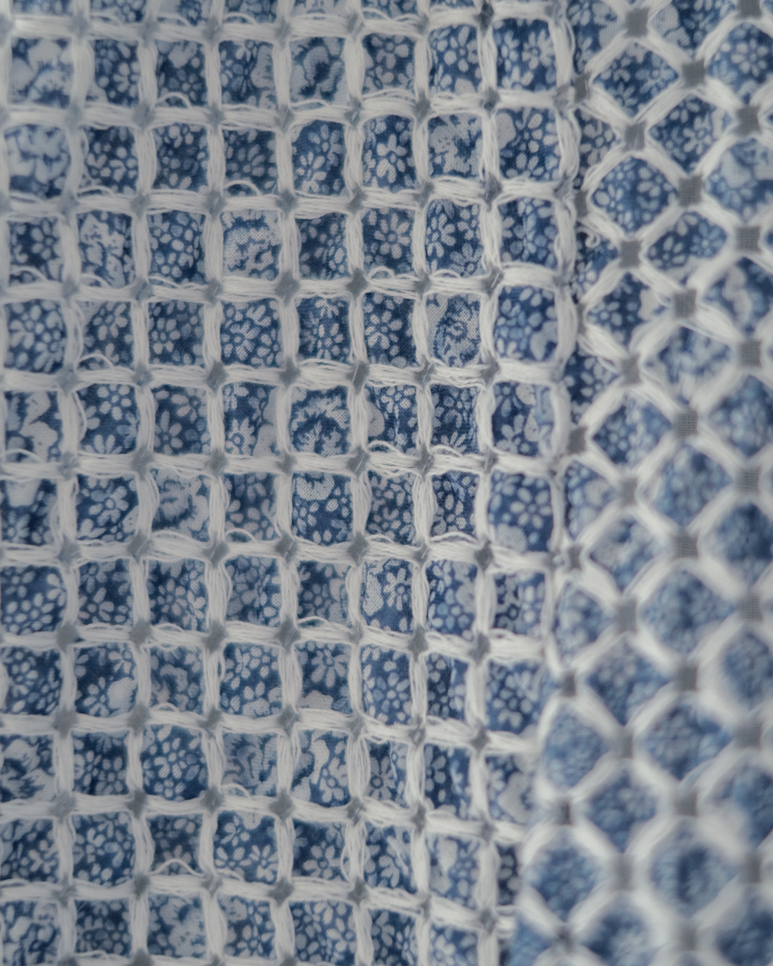 鮮やかなブルーで描かれた小花柄をベースに格子状に刺繍が施されたスペシャルな生地。