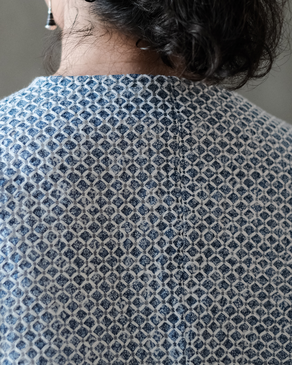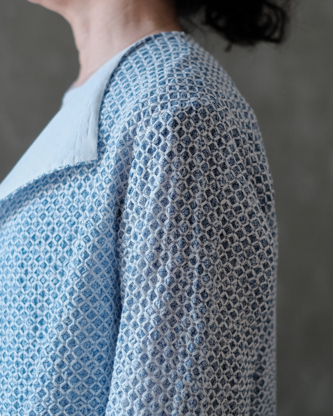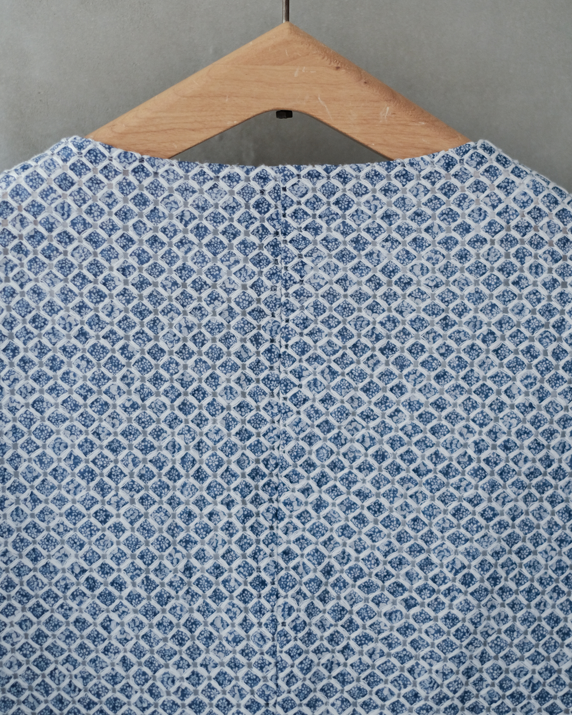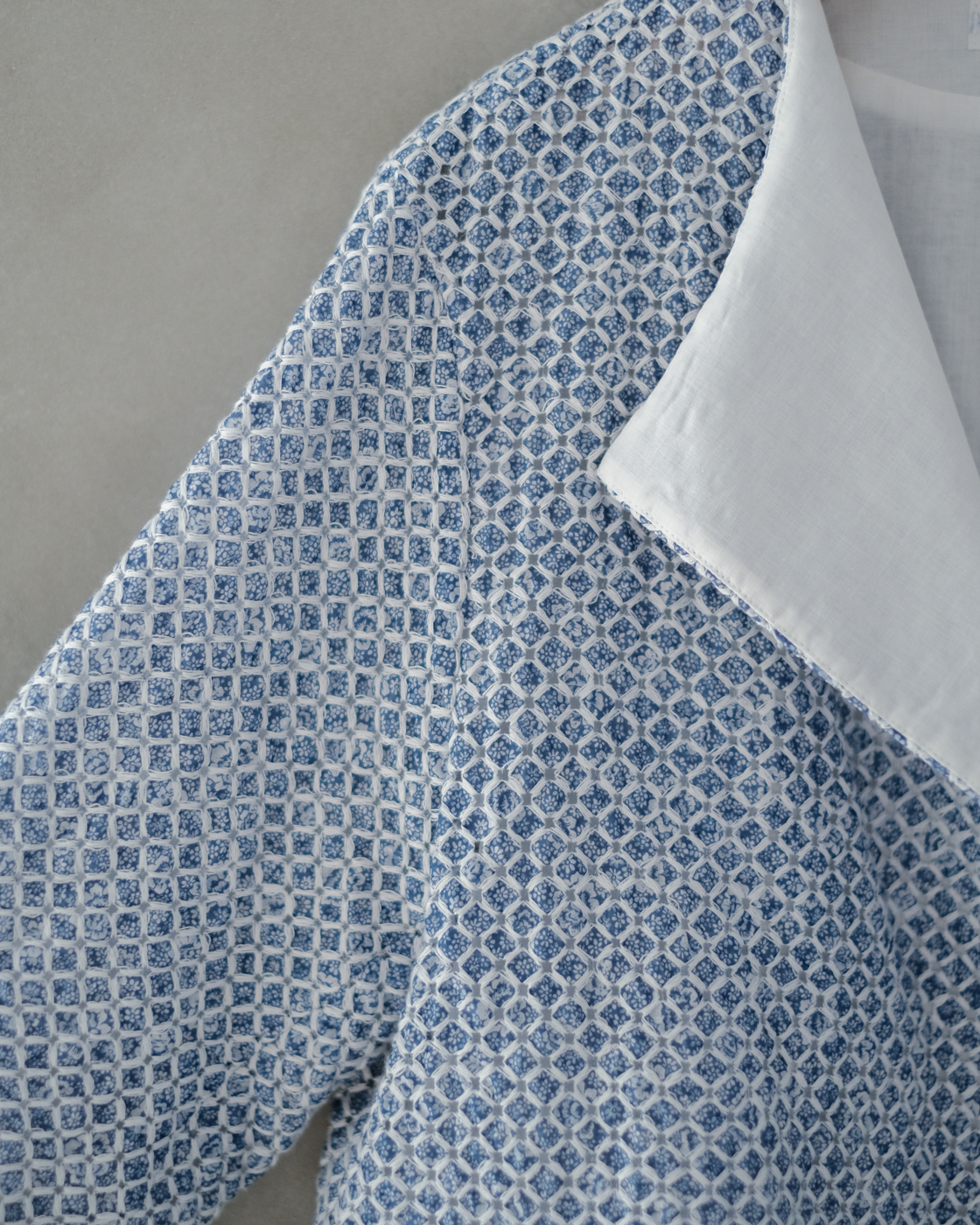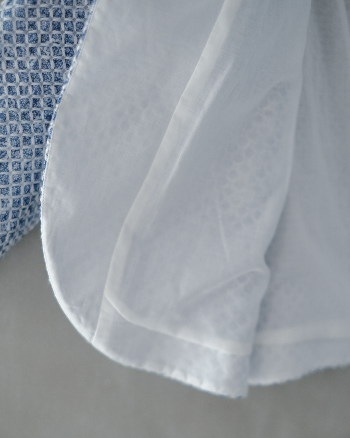 鮮やかなブルーで描かれた小花柄をベースに格子状に刺繍が施されたスペシャルな生地。