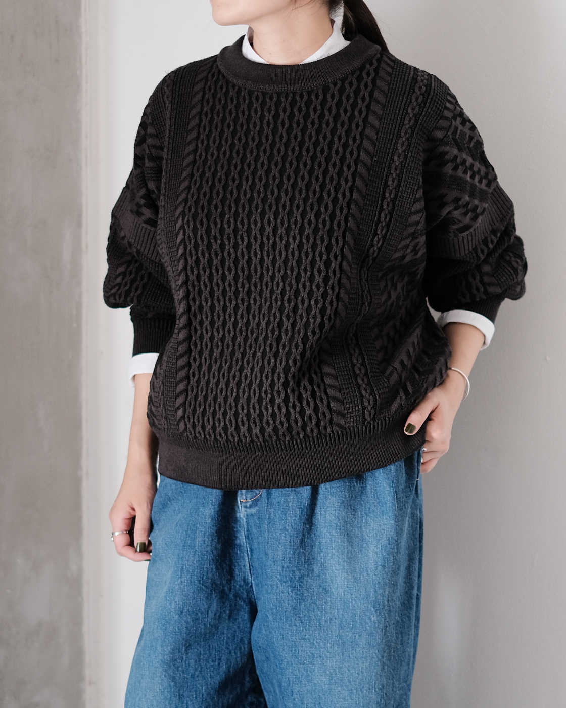 身頃中央のケーブル柄で厚い雲を、身頃横の斜線とケーブル柄で雪雷を表し、