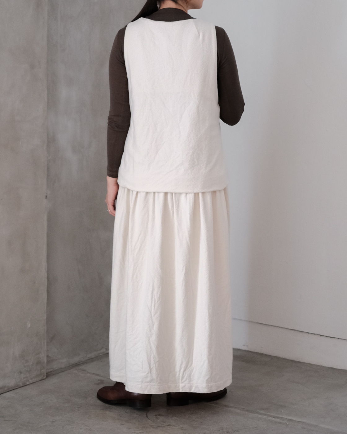 生地をたっぷりと使用した着丈は長めにと、足元のバランスが取りやすい丈感です。
