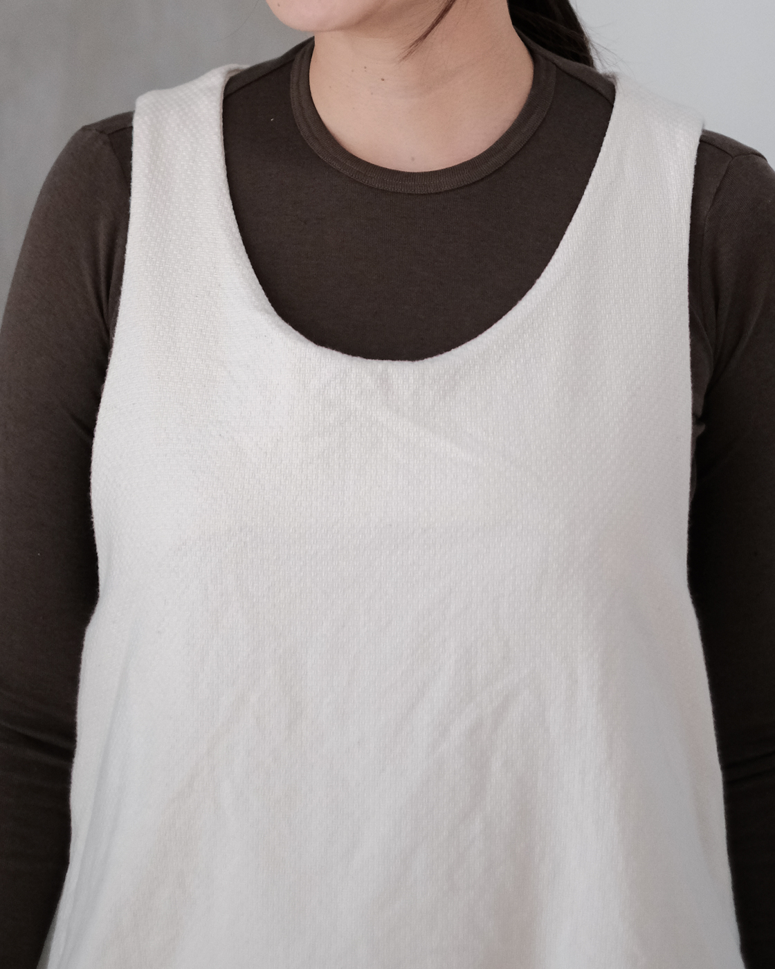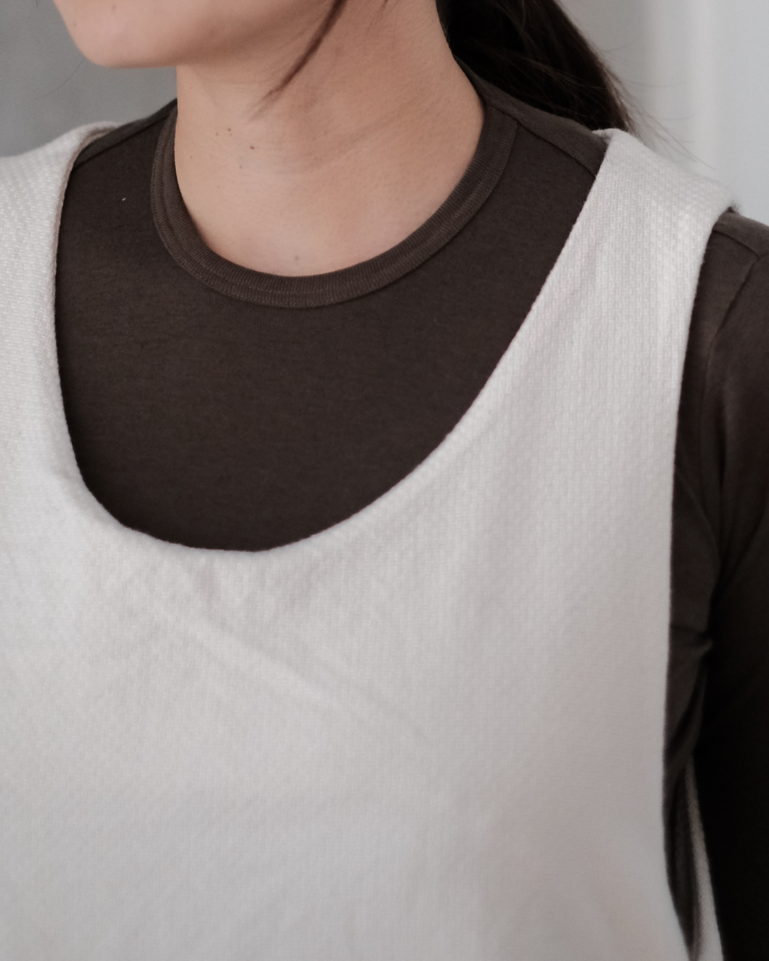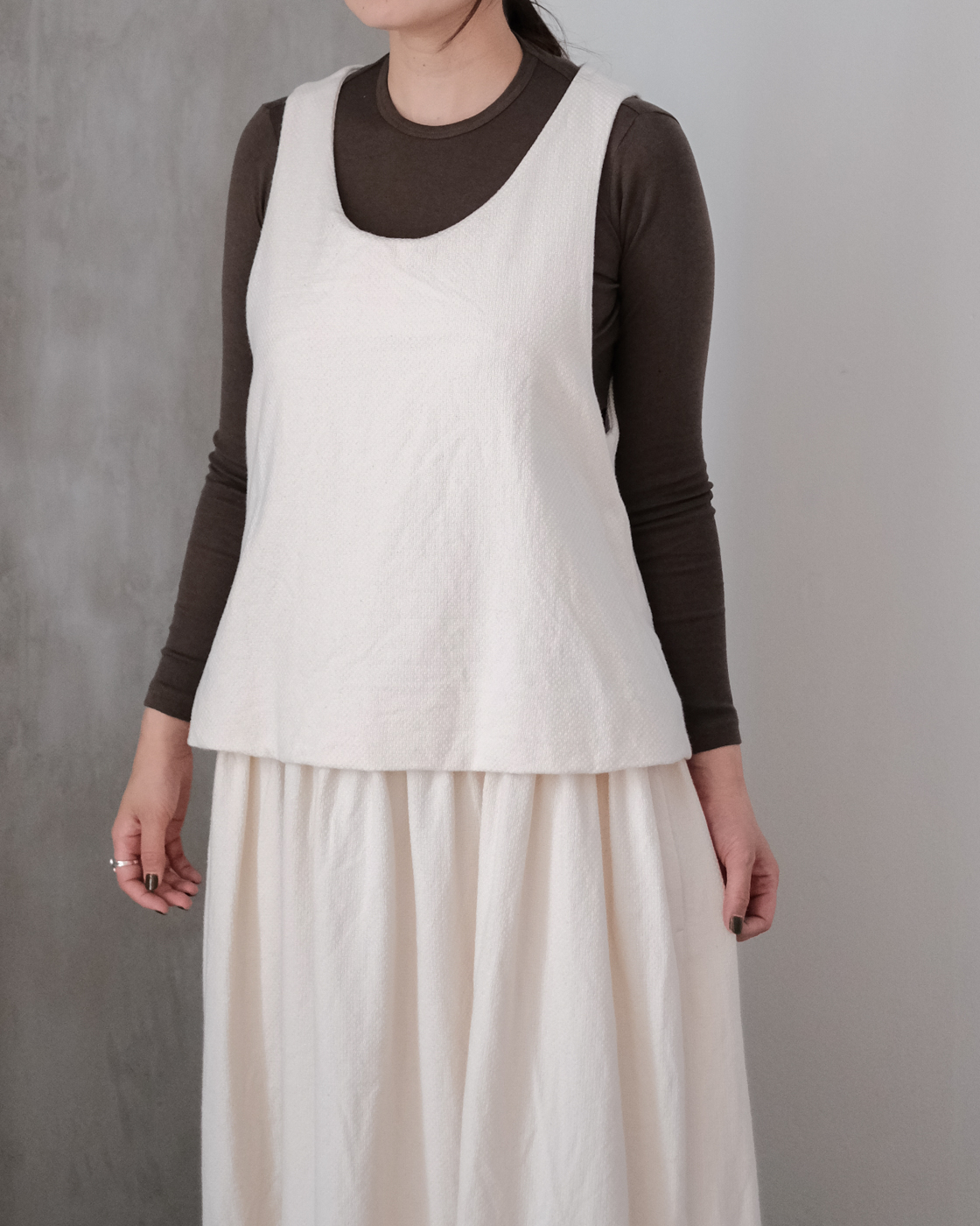 首元は深めに開いており、すっきりと見えながら中に着るシャツやブラウス、スウェット、カットソーなど、