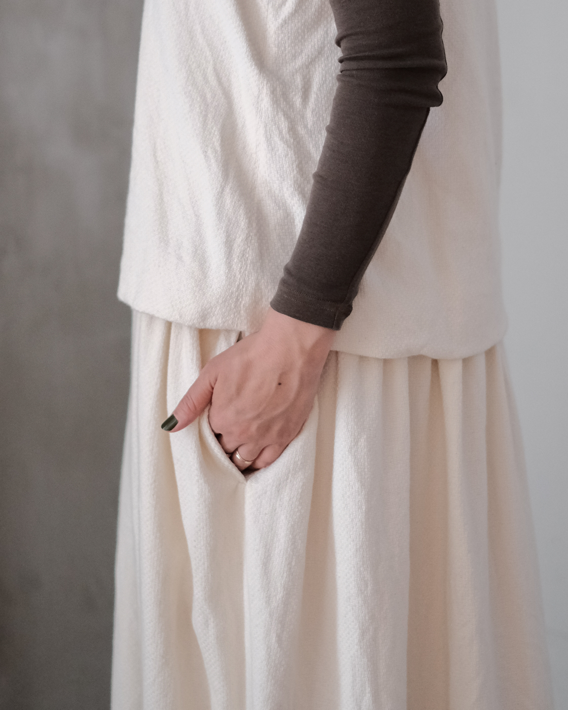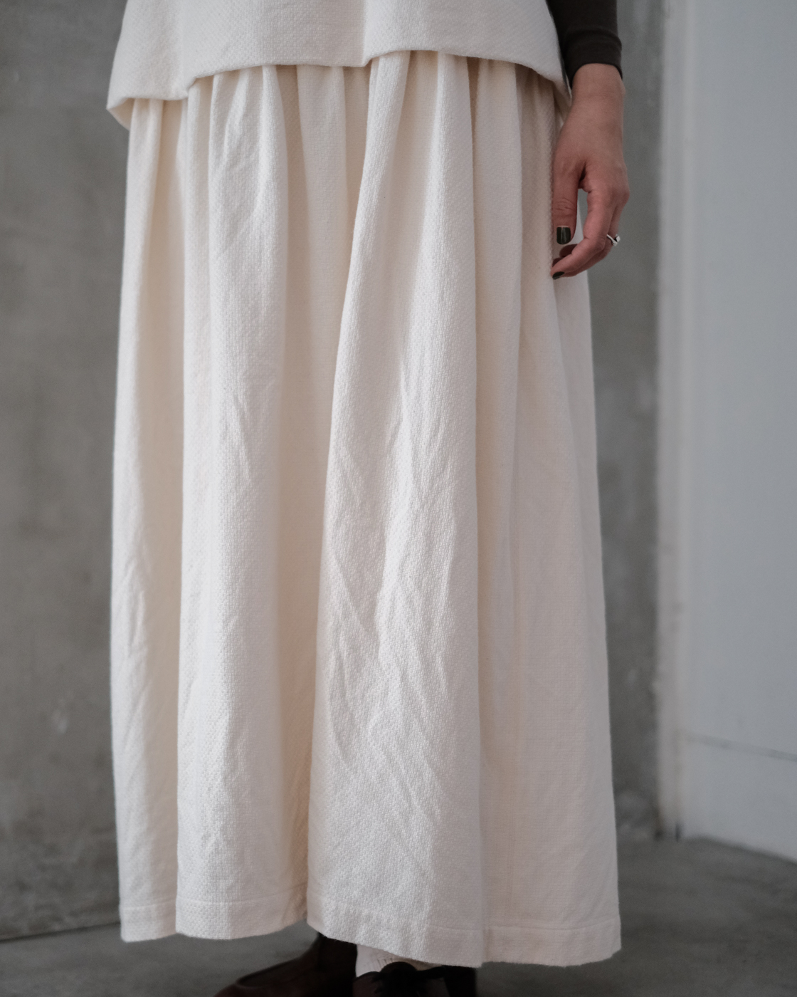 優しい柔らかさがある為、落ち感が綺麗でワイドシルエットならではの動きある表情を